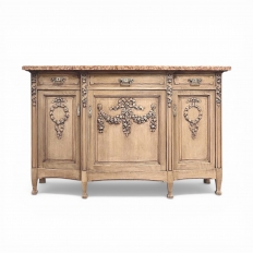 19th Century French Louis XVI Marble Top Buffet in Stripped Oak is an intriguing design conceived during the early years of the Art Deco Period, with broad, arched aprons and tapered, faceted legs supporting the casework which features a broad, elegantly arched bow front design with step-front cabinet configuration under the rust colored marble top. ...