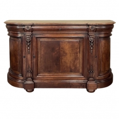 19th Century French Renaissance Marble Top Buffet will make a great presence in any room!  The rounded side design is very traffic-friendly, so even though the maximum depth is almost 2 feet, it seems like a smaller piece.  Topped with beveled marble that follows the case contours, it makes for carefree entertaining, display and even serving food and...