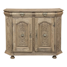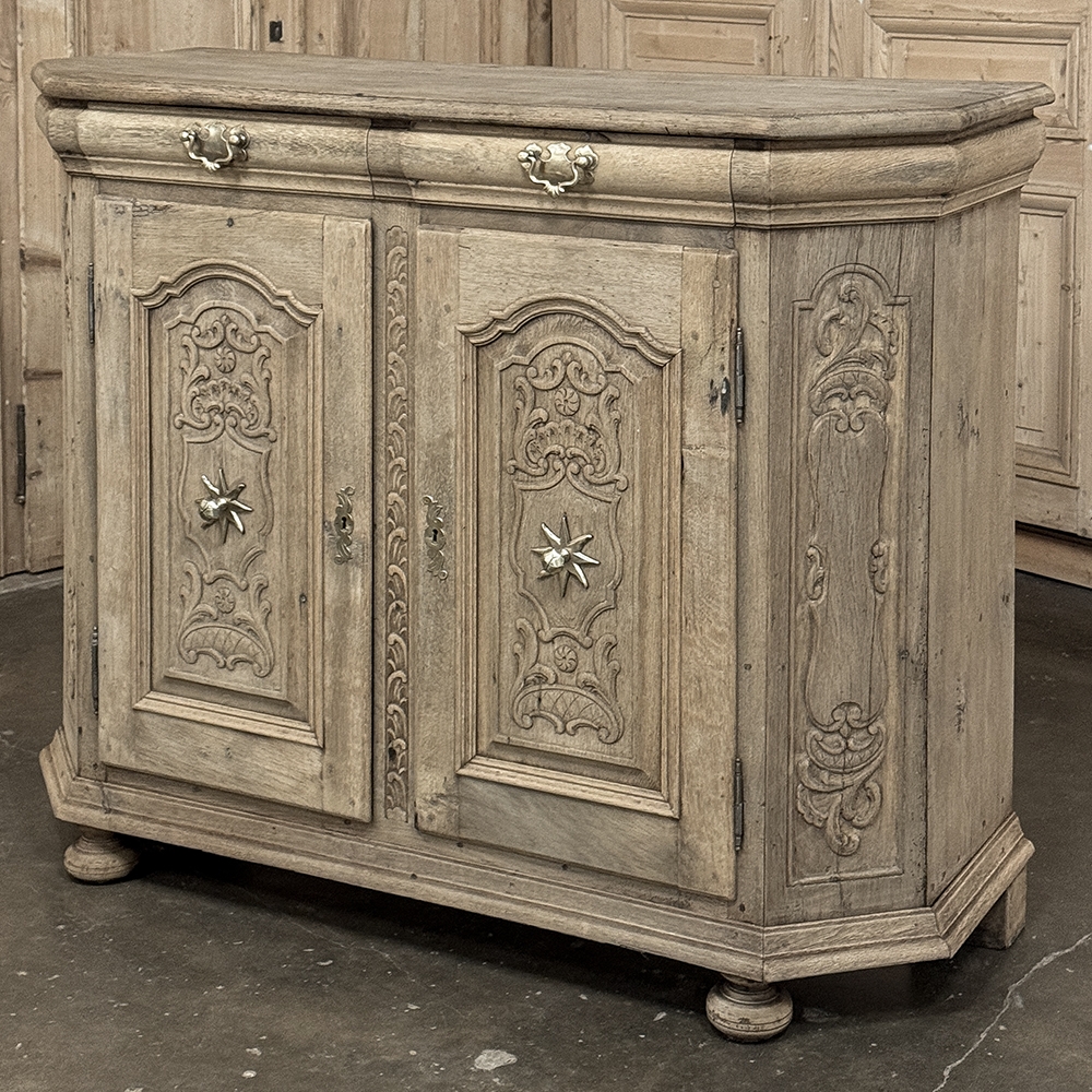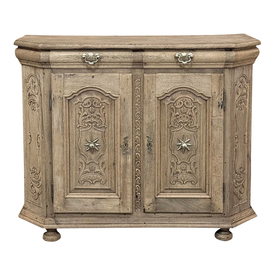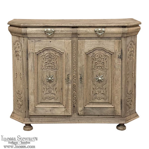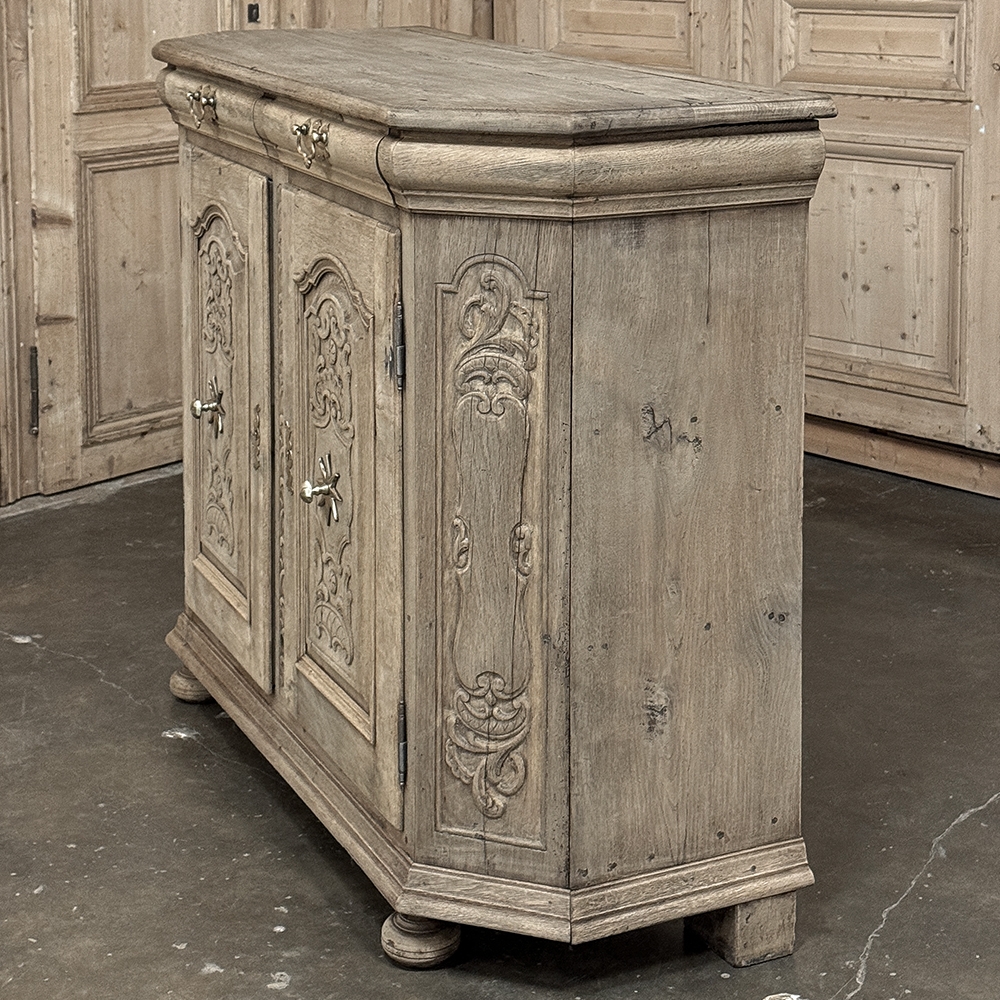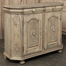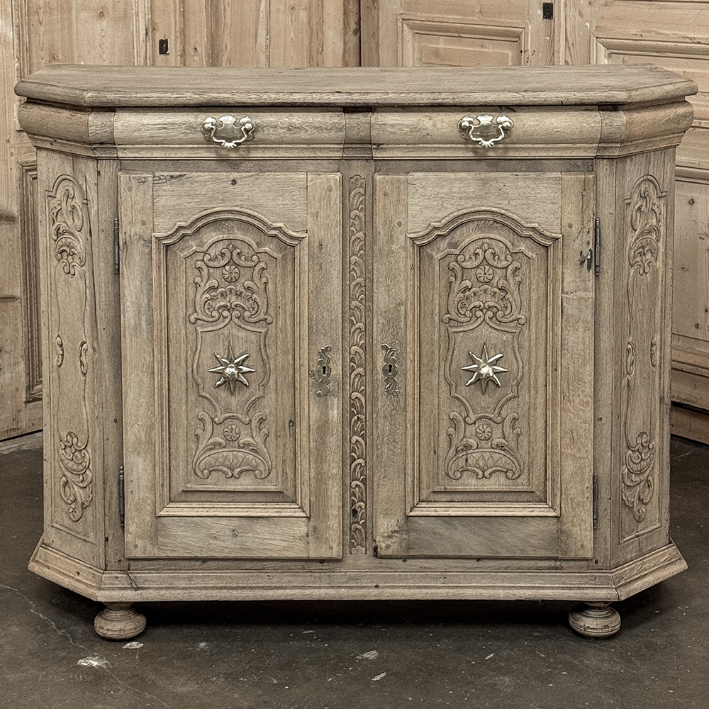 18th Century Liegoise Louis XIV Buffet ~ Cabinet is an exceptional example of the finest European craftsmanship that has come from the storied region around Liege nestled in what is today the southeast corner of Belgium. This example features boldly mitered corners, which eliminate sharp corners in the traffic area of the room, and provide a panel for the wood sculptor to produce elegant scrolls and stylized shell forms. Bold base molding wraps around the bottom with bun feet in front, while the top portion of the design projects outward to create a crown molding form that contains two spacious drawers. The cabinet doors under the drawers boast the most carved detail, with elaborately molded raised & recessed panels carved with designs matching the mitered panels, and fitted with starburst brass guards behind the knobs which complement the brass key guards and the drawer bale pulls with shield guards above. Doors and drawers open to reveal capacious storage, which only adds to the allure. Painstakingly stripped using our proprietary process that retains the patina and sheer natural beauty of the old wood, all performed by our expert in-house staff.