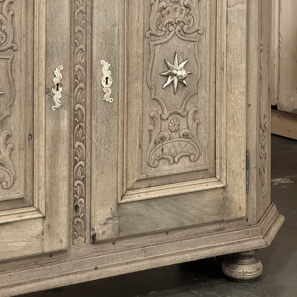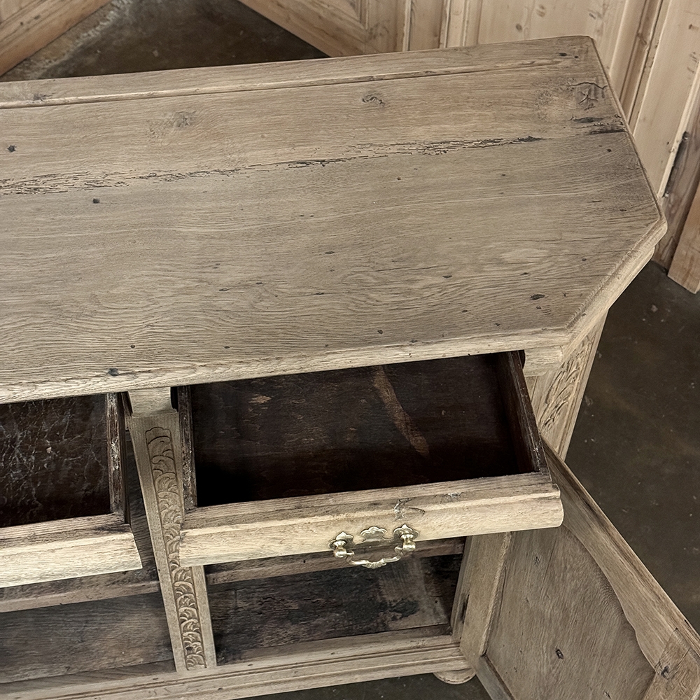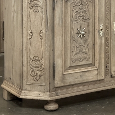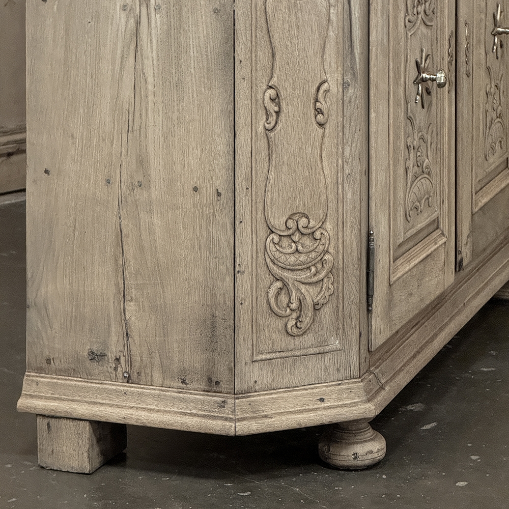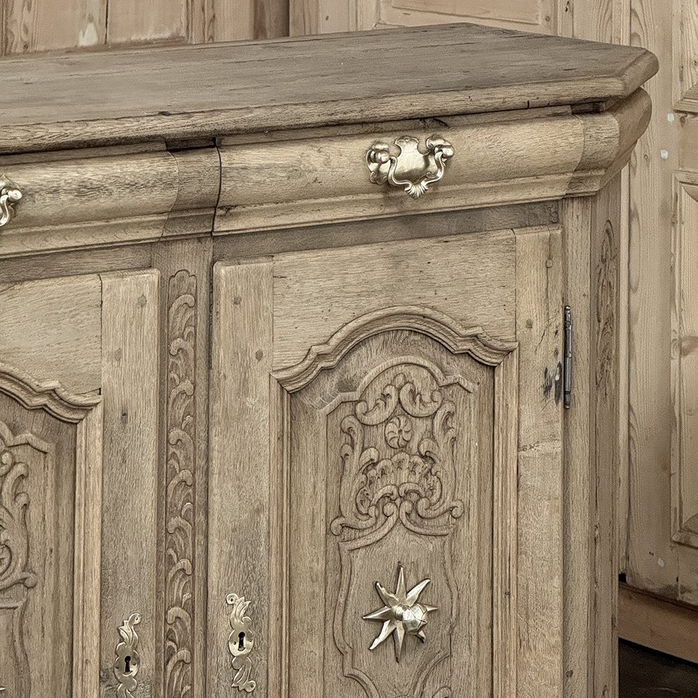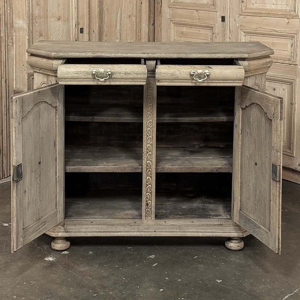 18th Century Liegoise Louis XIV Buffet ~ Cabinet is an exceptional example of the finest European craftsmanship that has come from the storied region around Liege nestled in what is today the southeast corner of Belgium. This example features boldly mitered corners, which eliminate sharp corners in the traffic area of the room, and provide a panel for the wood sculptor to produce elegant scrolls and stylized shell forms. Bold base molding wraps around the bottom with bun feet in front, while the top portion of the design projects outward to create a crown molding form that contains two spacious drawers. The cabinet doors under the drawers boast the most carved detail, with elaborately molded raised & recessed panels carved with designs matching the mitered panels, and fitted with starburst brass guards behind the knobs which complement the brass key guards and the drawer bale pulls with shield guards above. Doors and drawers open to reveal capacious storage, which only adds to the allure. Painstakingly stripped using our proprietary process that retains the patina and sheer natural beauty of the old wood, all performed by our expert in-house staff.