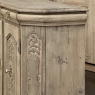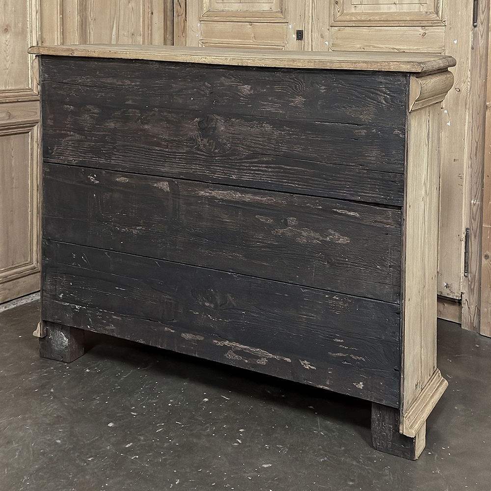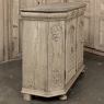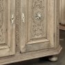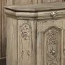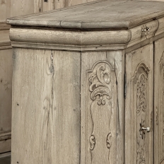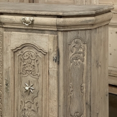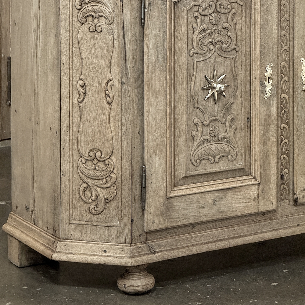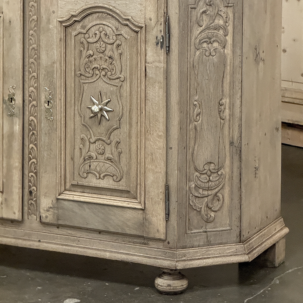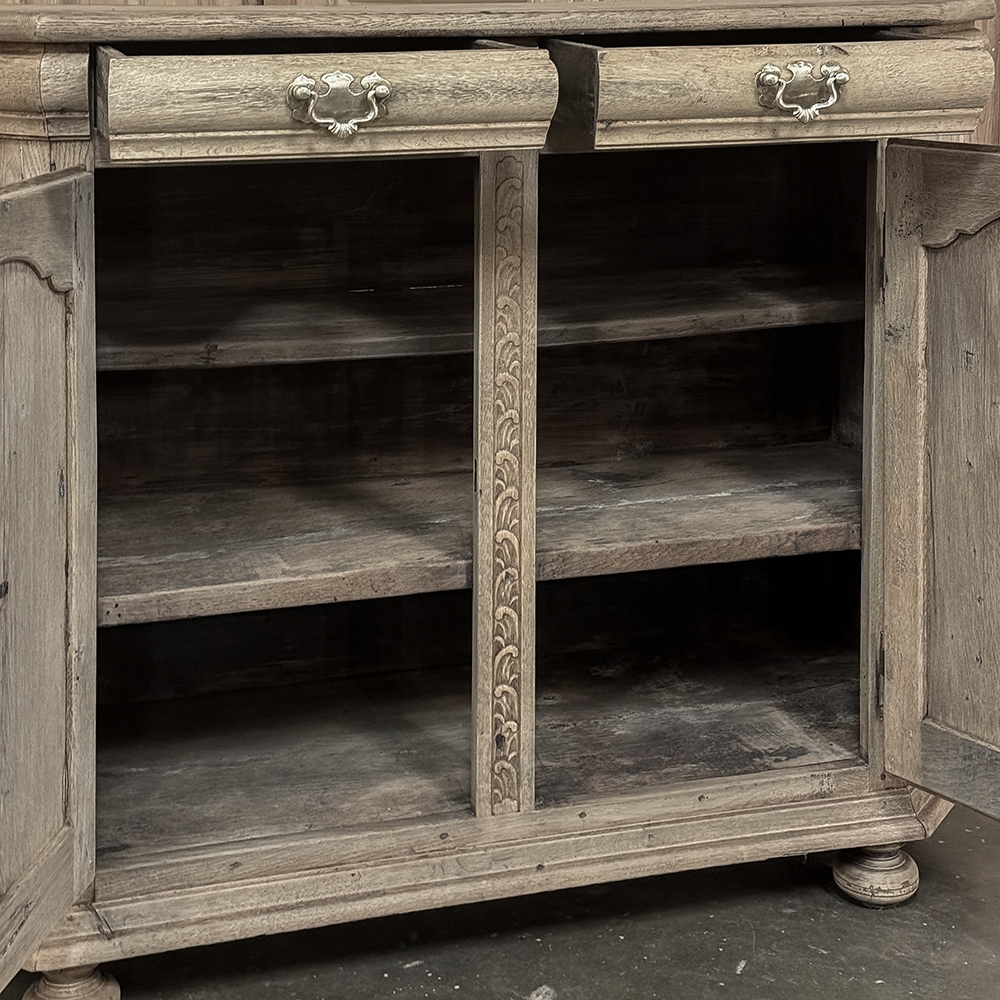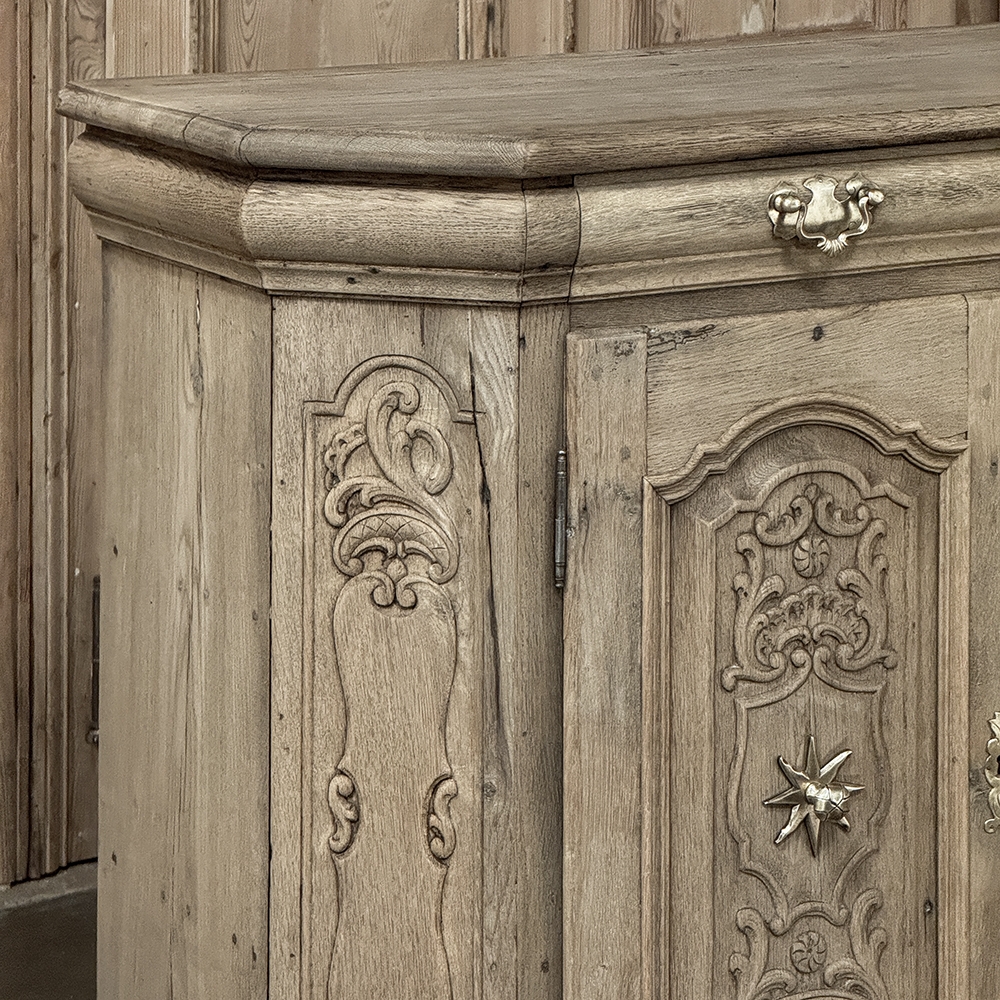 18th Century Liegoise Louis XIV Buffet ~ Cabinet is an exceptional example of the finest European craftsmanship that has come from the storied region around Liege nestled in what is today the southeast corner of Belgium. This example features boldly mitered corners, which eliminate sharp corners in the traffic area of the room, and provide a panel for the wood sculptor to produce elegant scrolls and stylized shell forms. Bold base molding wraps around the bottom with bun feet in front, while the top portion of the design projects outward to create a crown molding form that contains two spacious drawers. The cabinet doors under the drawers boast the most carved detail, with elaborately molded raised & recessed panels carved with designs matching the mitered panels, and fitted with starburst brass guards behind the knobs which complement the brass key guards and the drawer bale pulls with shield guards above. Doors and drawers open to reveal capacious storage, which only adds to the allure. Painstakingly stripped using our proprietary process that retains the patina and sheer natural beauty of the old wood, all performed by our expert in-house staff.