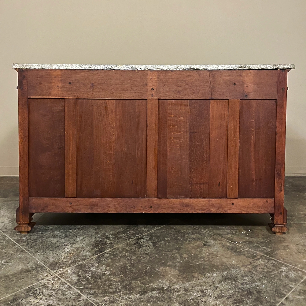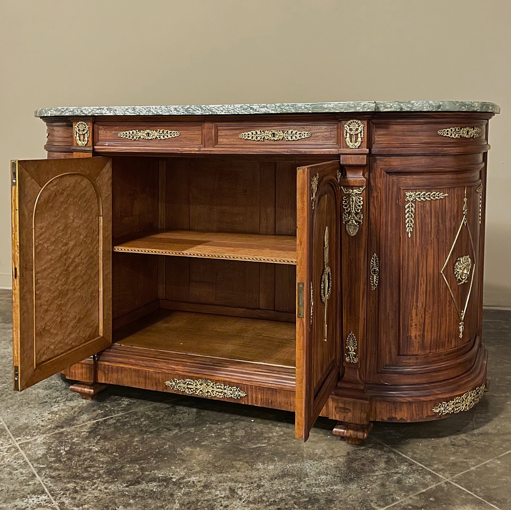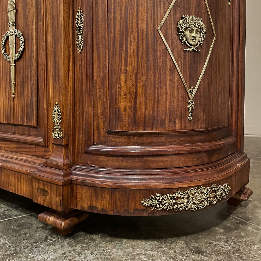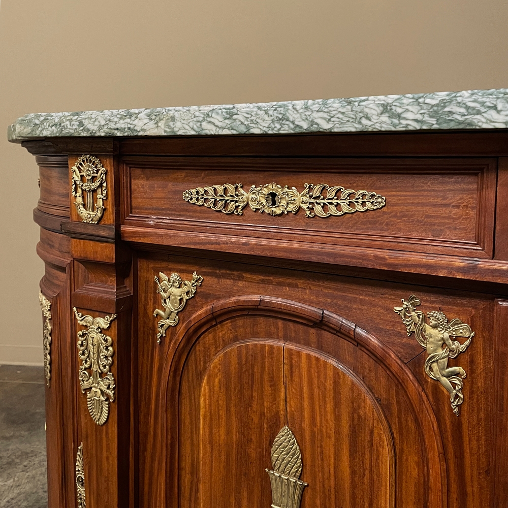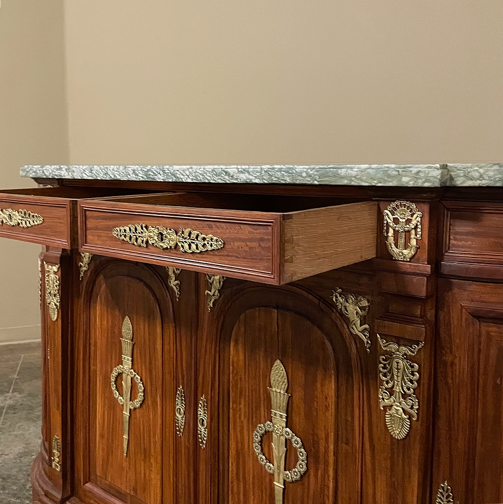 19th Century French Empire Mahogany Marble Top Buffet is a marvel of the cabinetmaker's art! First, exotic imported mahogany was employed to create a rich, beautiful background using tailored architectural styling. Then, intricate castings in solid bronze were applied with designs inspired by ancient Egyptian, Greek and Roman art. The bronze embellishments adorn the baseboard, pilasters, doors, and drawer tier, and include images of angels, scepters, wreaths, lyres, and the likeness of a goddess on the rounded side doors, all creating a timeless sense of elegance and opulence. The doors open to reveal special attention paid even to the interior, with inlaid bordering and fine veneering designed to please the owner, and the owner alone. Lastly, a particularly splendid slab of marble was selected for the top, contoured and beveled to follow the graceful contours of the casework below for the perfect finishing touch!