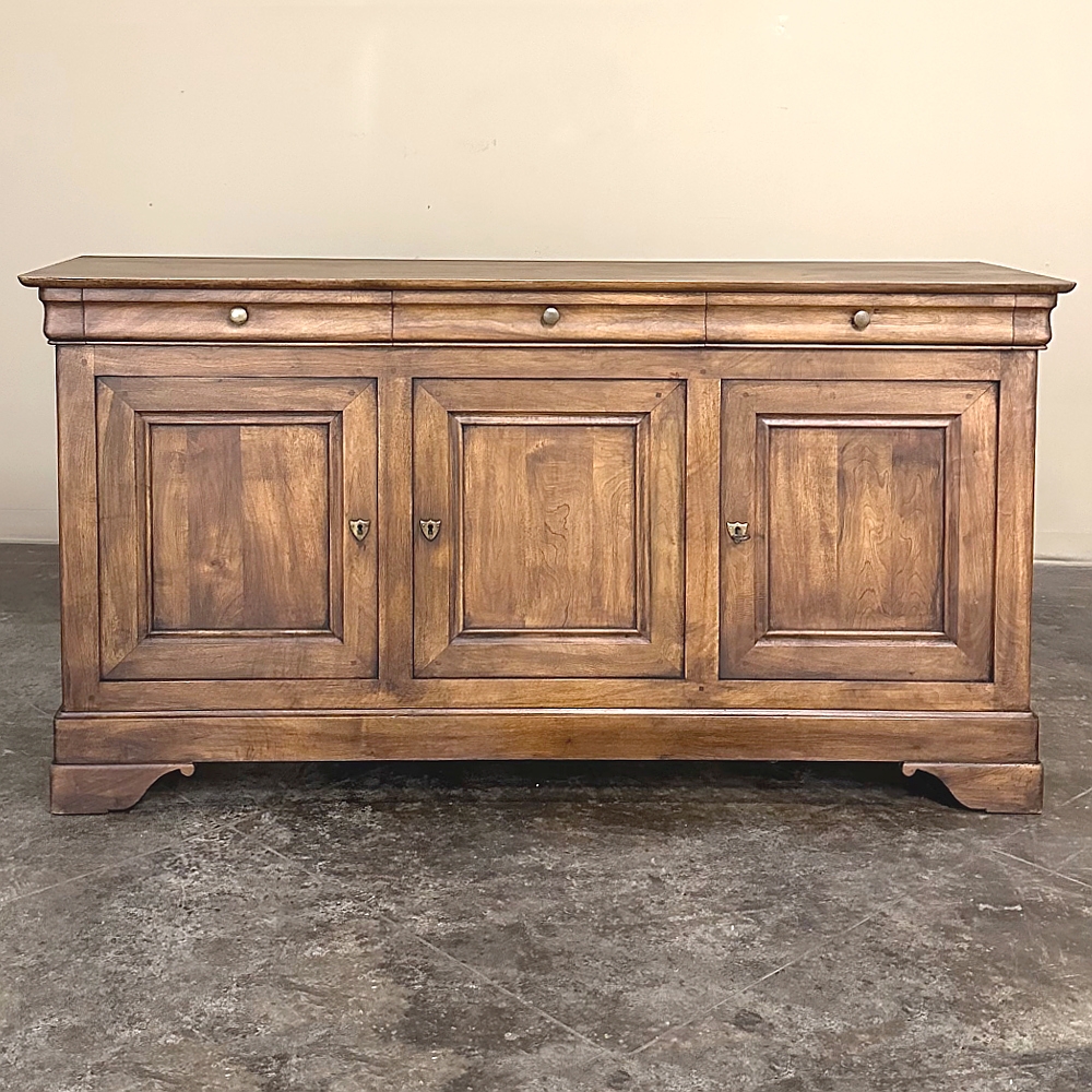 19th Century French Louis Philippe Period Walnut Buffet ~ Enfilade ~ Credenza was lovingly hand-crafted from sumptuous French walnut to last for centuries! Designed with a tailored architecture which is a hallmark of the era, it features a volute shaped upper tier which contains the three drawers, each hand-dovetailed and fitted with brass knobs. Simple but solid panels below grace the three cabinet doors which are fitted with signature brass shield shaped key guards, and which open to reveal substantial storage with a full width shelf. Pediment style feet complete the look. The size is great for almost any purpose you can imagine, for any room!