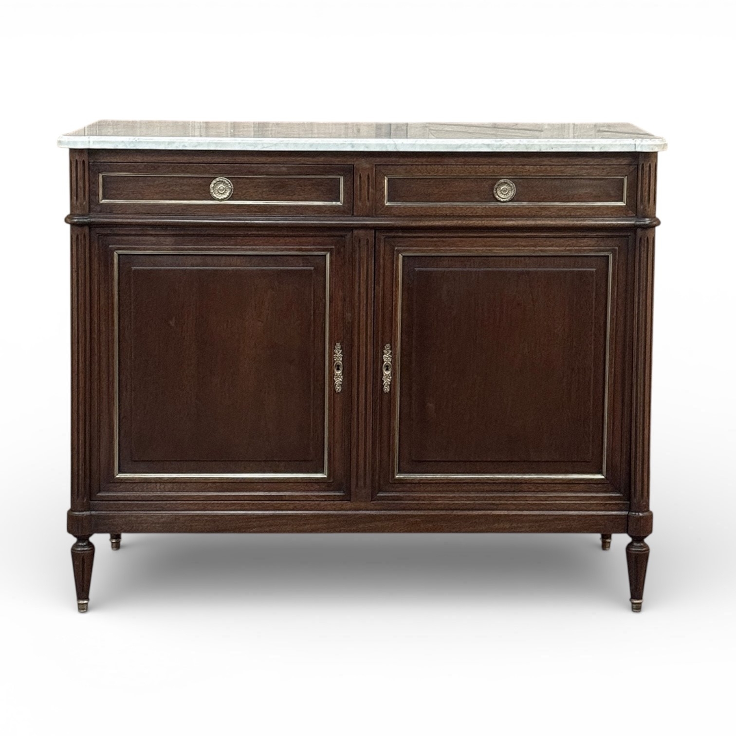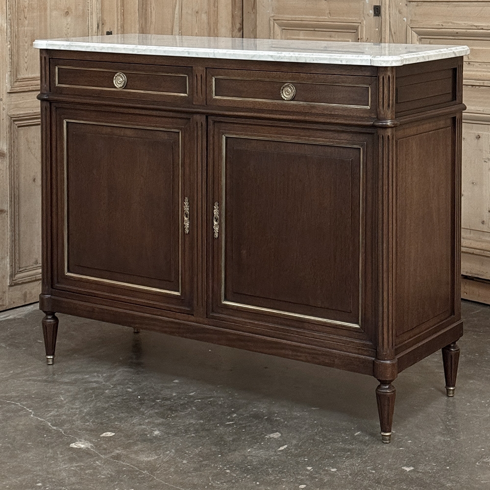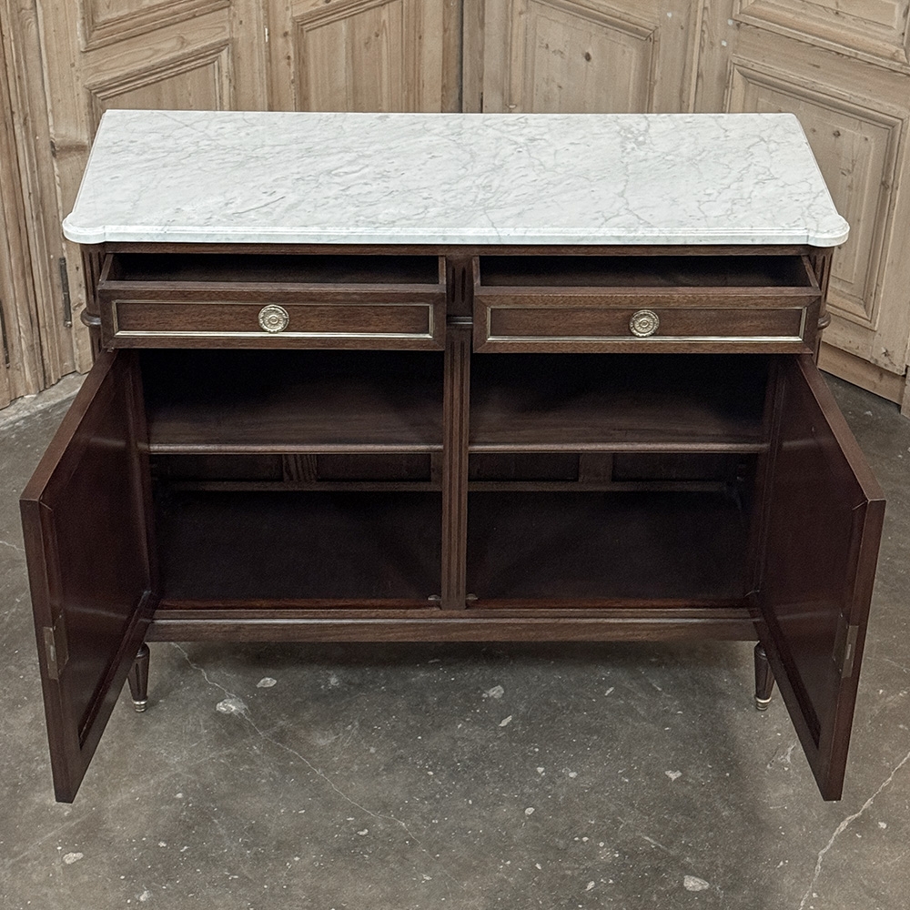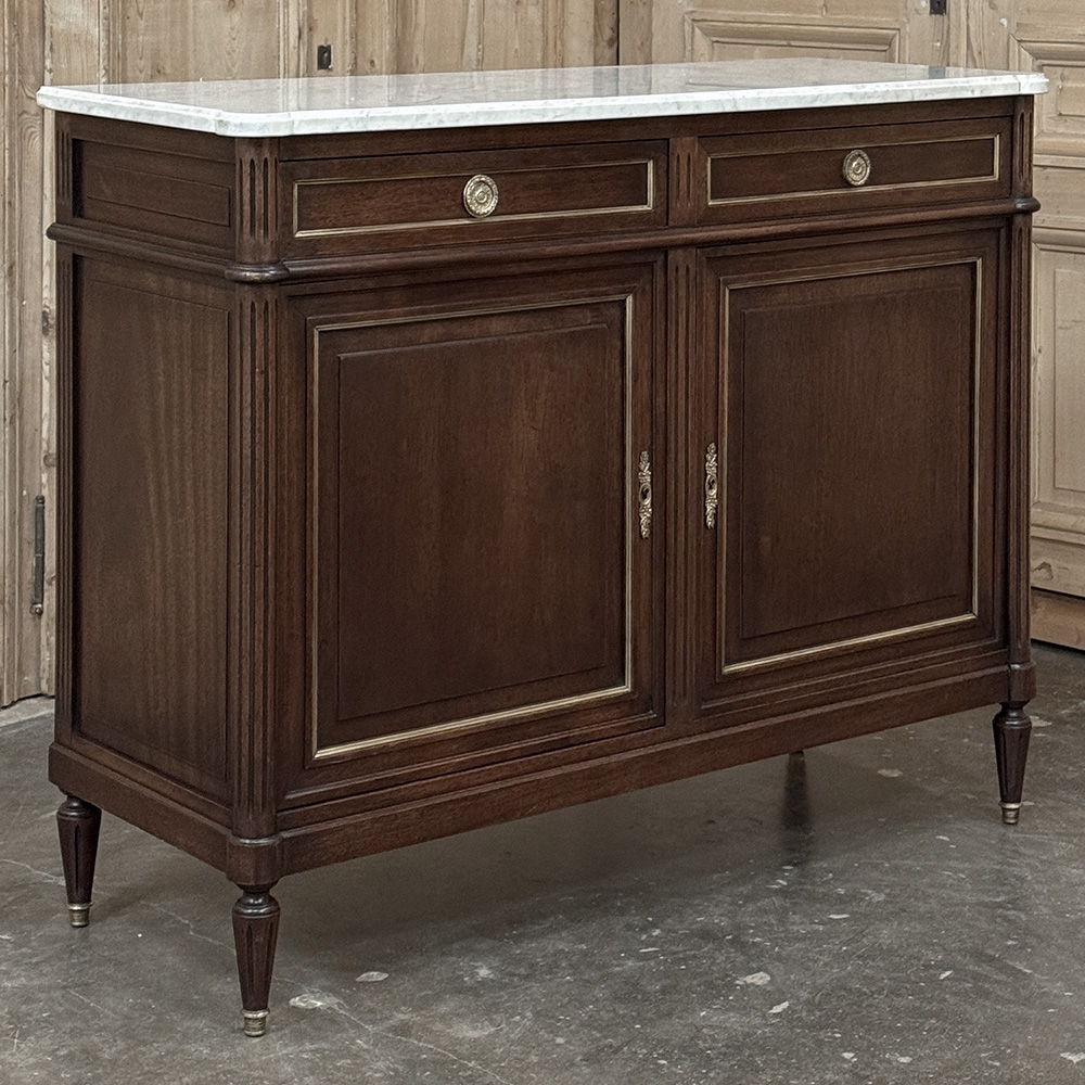 19th Century French Louis XVI Mahogany Buffet with Cararra Marble combines subtle elegance with functionality and performs it all in style! Crafted from exotic imported mahogany, it features a tailored architecture and surprisingly spacious interior. Four tapered and fluted legs with brass feet transition to the fluted corner posts above, which flank the cabinets and drawers trimmed in brass quarter-round. Brass ring pulls and key guards add a nice visual touch. Sumptuous Carrara marble has been contoured and beveled to follow the corners below, providing a carefree yet elegant finishing touch. Note the hand-hewn planks and mortise & tenon joinery on the back, signs of exceptional hand-craftsmanship!