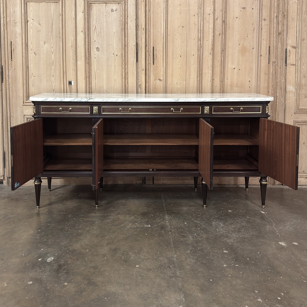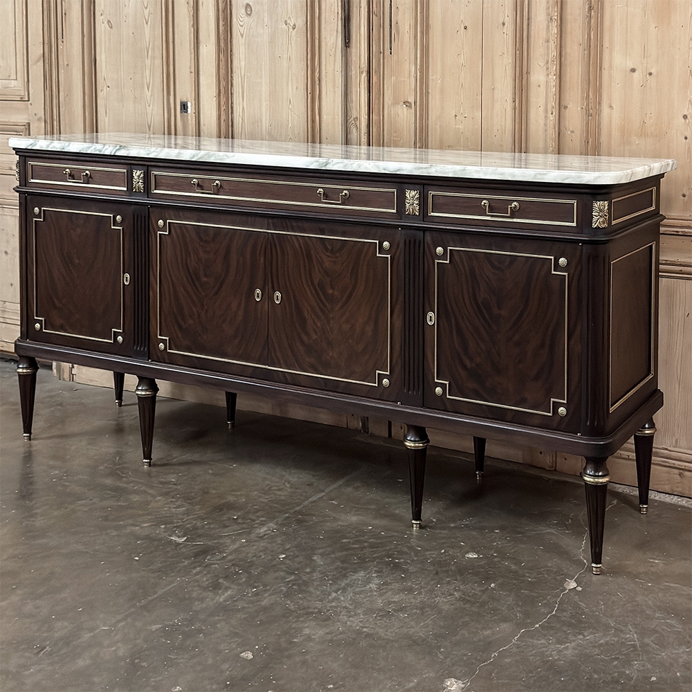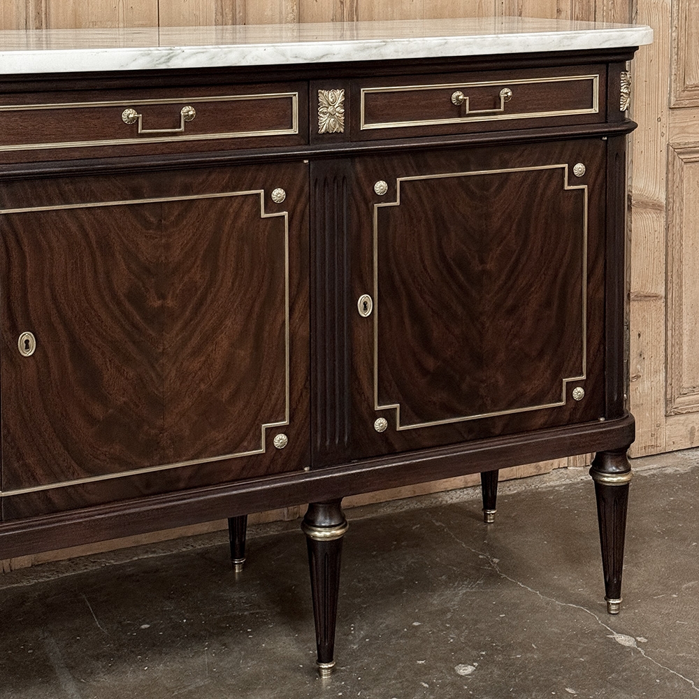 19th Century French Louis XVI Mahogany Buffet with Carrara Marble Top is a commanding and impressive work of the cabinetmaker's art, distinguished by the striking interplay of richly figured mahogany and luminous Carrara marble. The beautifully veined marble top stretches gracefully across the length of the piece, its soft tones and natural movement offering a refined contrast to the deep, glowing warmth of the mahogany below.