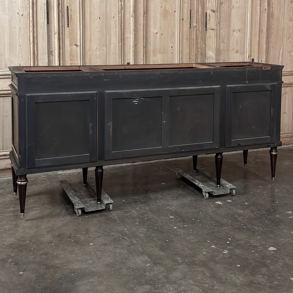 Above, a row of drawers is adorned with finely cast bronze pulls and decorative mounts, adding subtle ornament without interrupting the harmony of the design. The buffet is raised on tapered legs with brass sabots, lending an elegant lift and reinforcing the architectural clarity associated with the Louis XVI style.