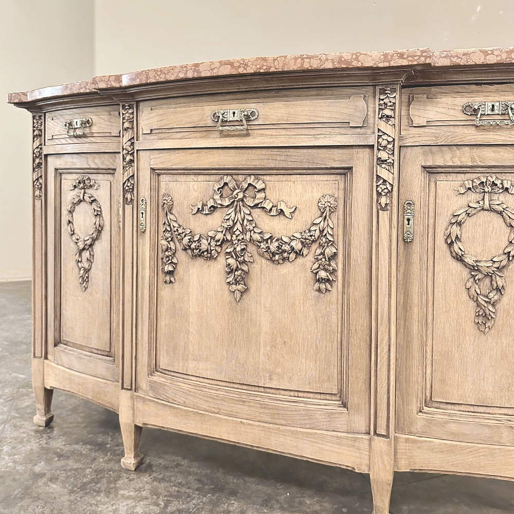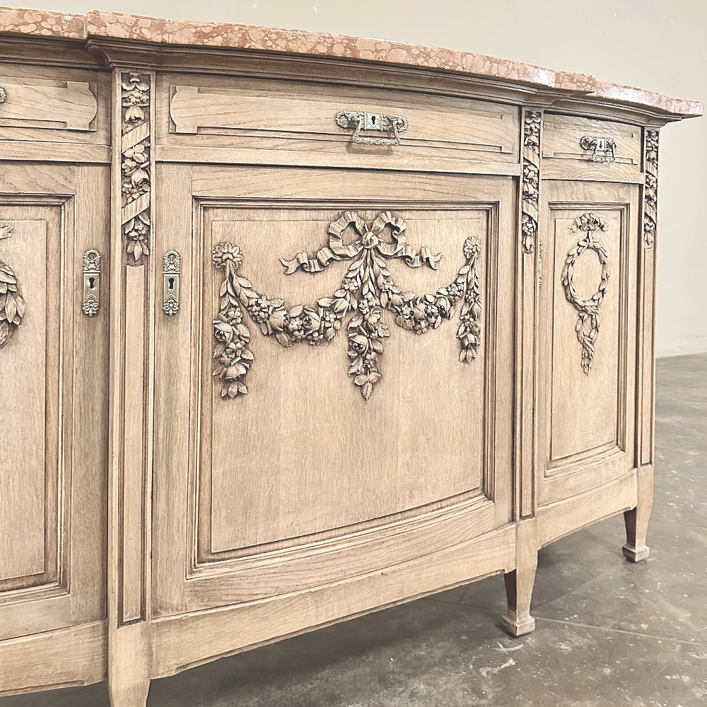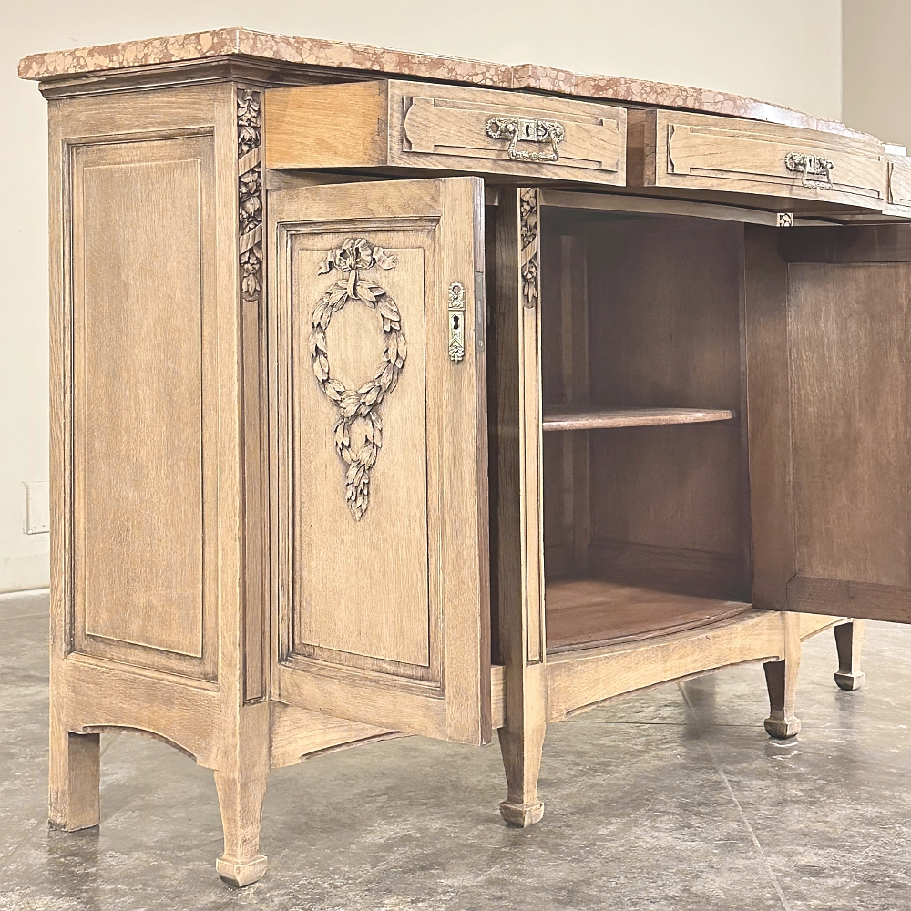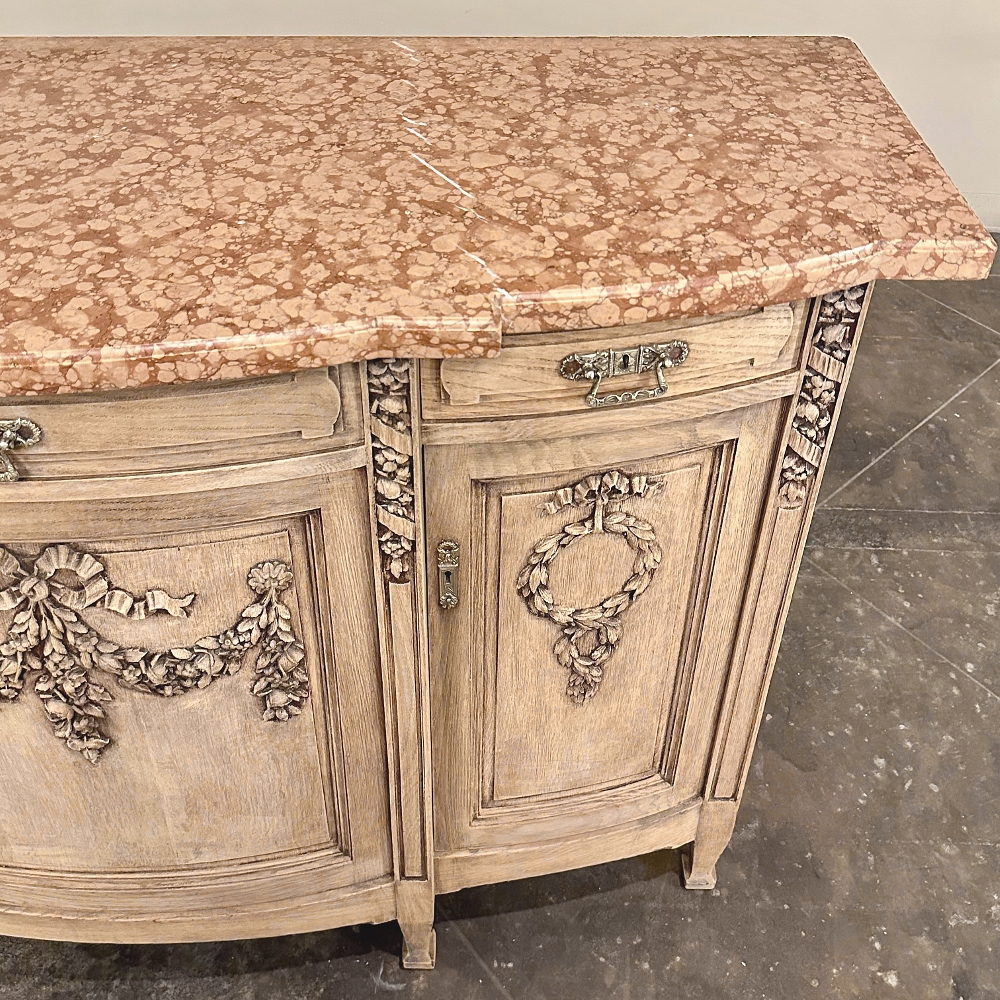 Sale19th Century French Louis XVI Marble Top Buffet in Stripped Oak is an intriguing design conceived during the early years of the Art Deco Period, with broad, arched aprons and tapered, faceted legs supporting the casework which features a broad, elegantly arched bow front design with step-front cabinet configuration under the rust colored marble top. Carved embellishments are indicative of neoclassicism, favored by Louis XVI and his court, with ribbon and floral garlands dominating the relief carving on the three door panels. Carvings on the pilasters complements the doors, and extends part of the way down from the top molding just under the marble. Cast brass bale pulls and key guards were avant-garde for their time, and add a luxurious touch. Doors and drawers open wide to reveal capacious storage, and the entire architecture of the design arches back towards the wall to make it very traffic friendly for any room. Painstakingly stripped using our proprietary process that retains the patina and sheer natural beauty of the old wood, all performed by our expert in-house staff.