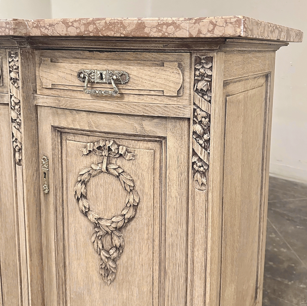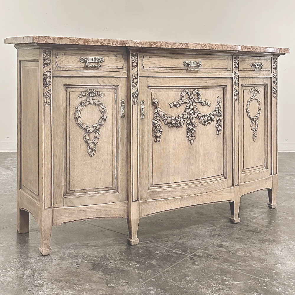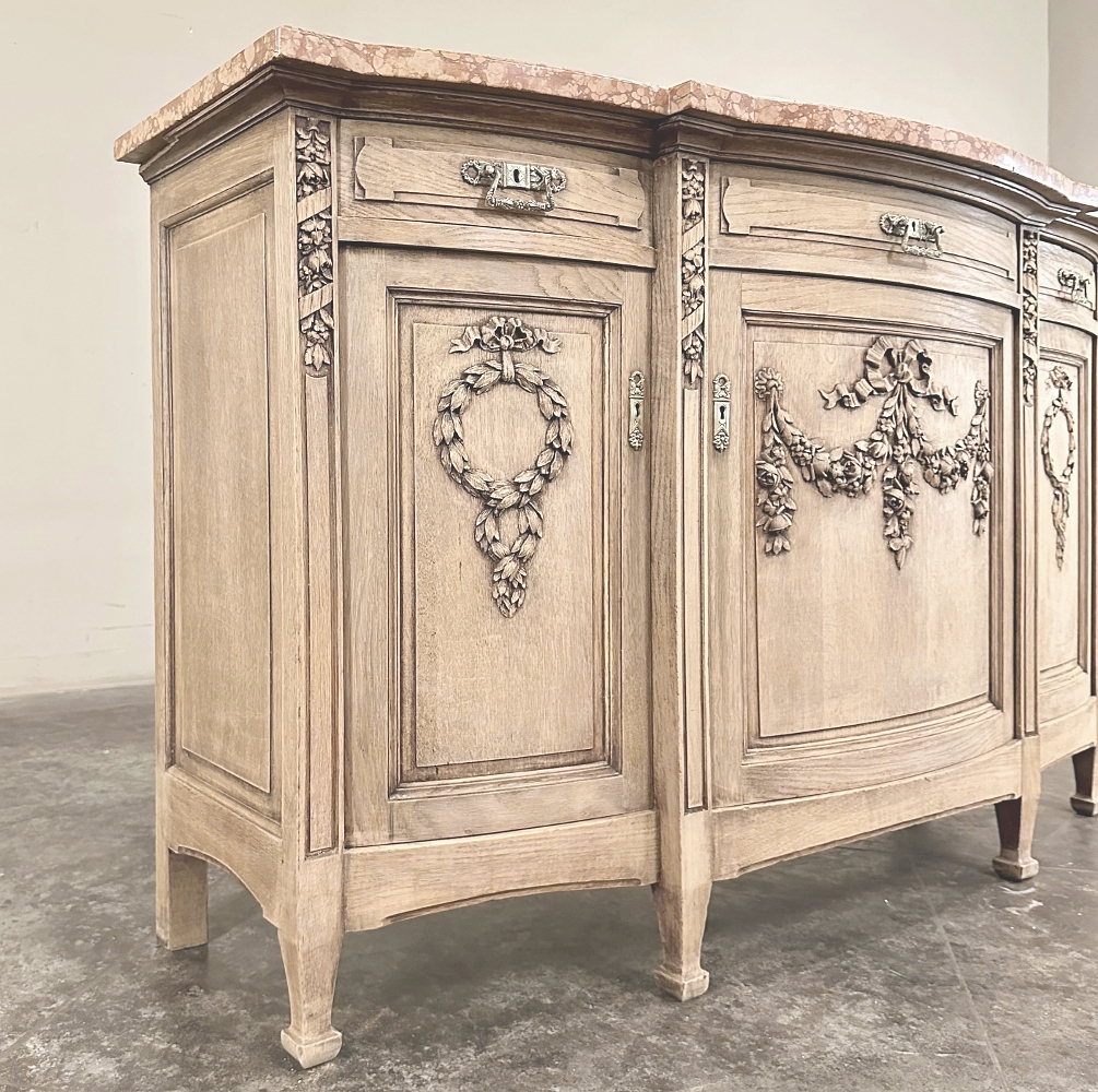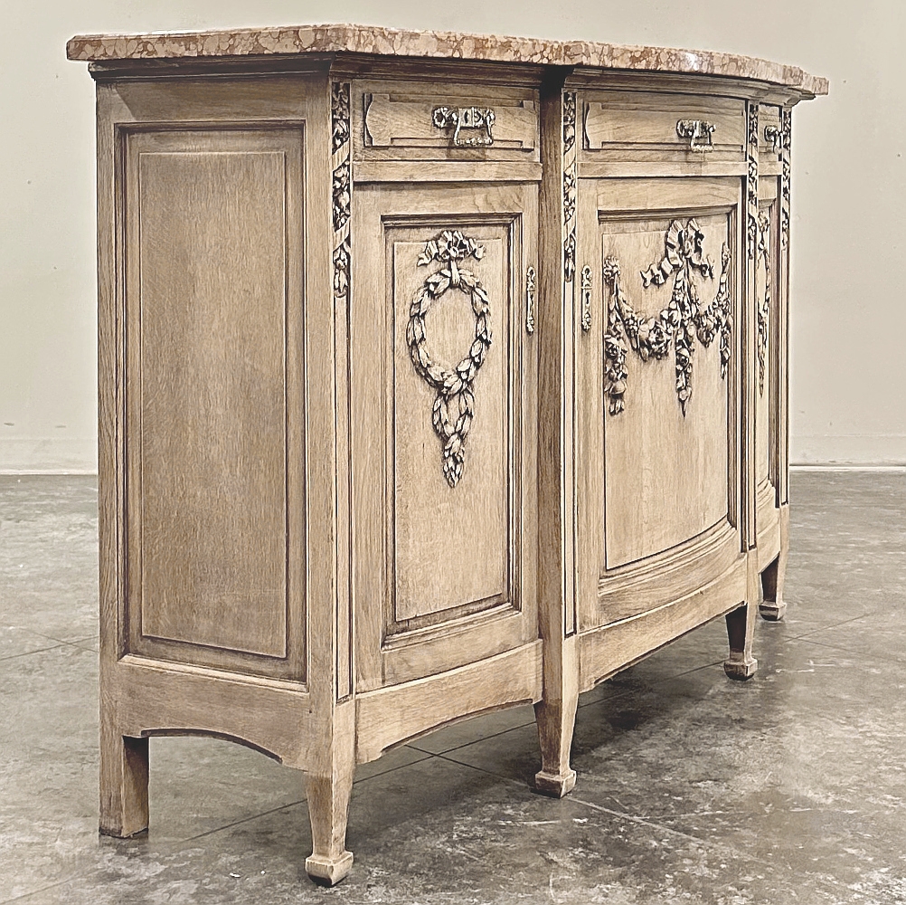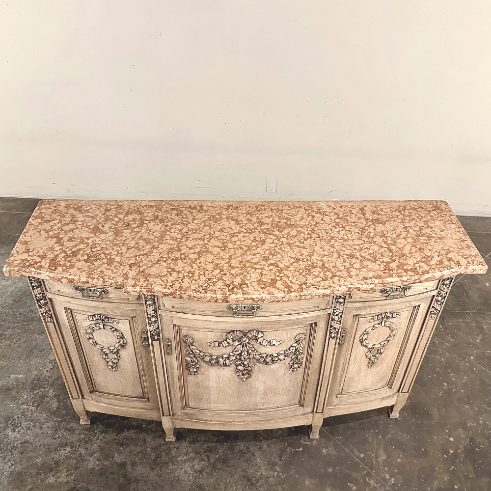 Sale19th Century French Louis XVI Marble Top Buffet in Stripped Oak is an intriguing design conceived during the early years of the Art Deco Period, with broad, arched aprons and tapered, faceted legs supporting the casework which features a broad, elegantly arched bow front design with step-front cabinet configuration under the rust colored marble top. Carved embellishments are indicative of neoclassicism, favored by Louis XVI and his court, with ribbon and floral garlands dominating the relief carving on the three door panels. Carvings on the pilasters complements the doors, and extends part of the way down from the top molding just under the marble. Cast brass bale pulls and key guards were avant-garde for their time, and add a luxurious touch. Doors and drawers open wide to reveal capacious storage, and the entire architecture of the design arches back towards the wall to make it very traffic friendly for any room. Painstakingly stripped using our proprietary process that retains the patina and sheer natural beauty of the old wood, all performed by our expert in-house staff.