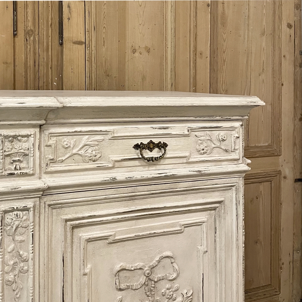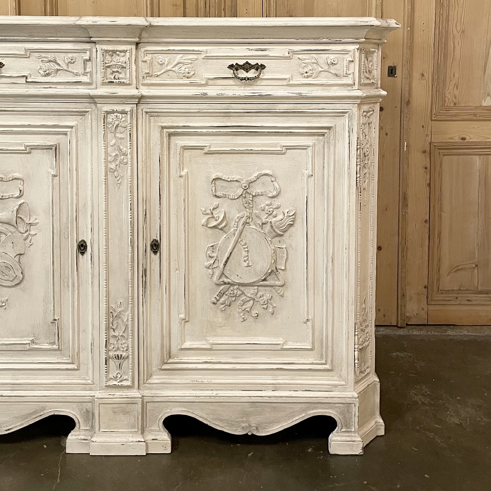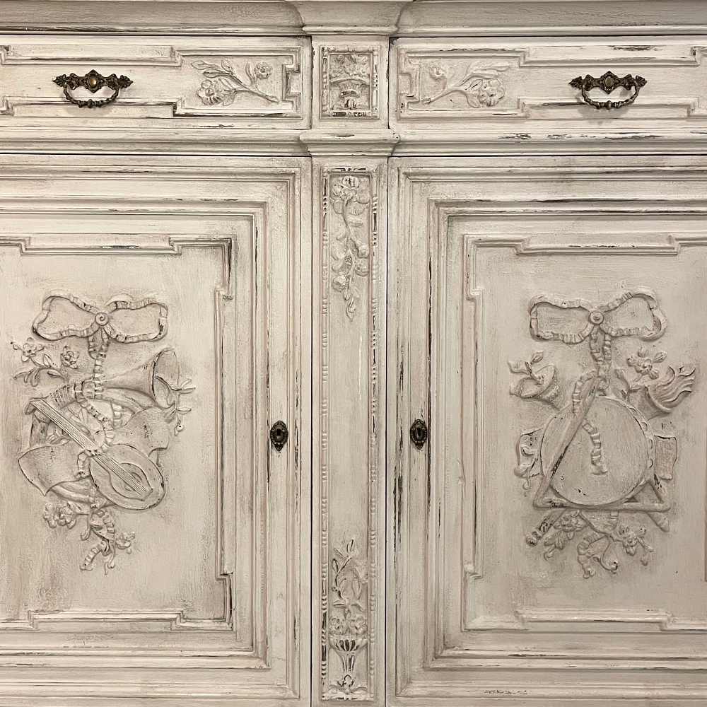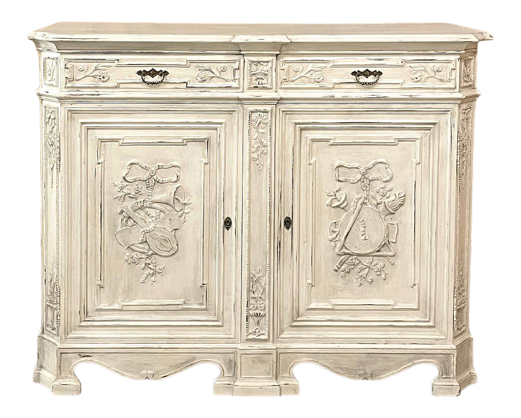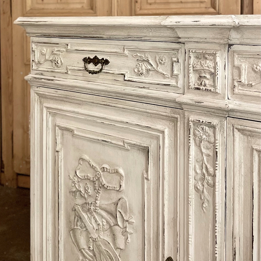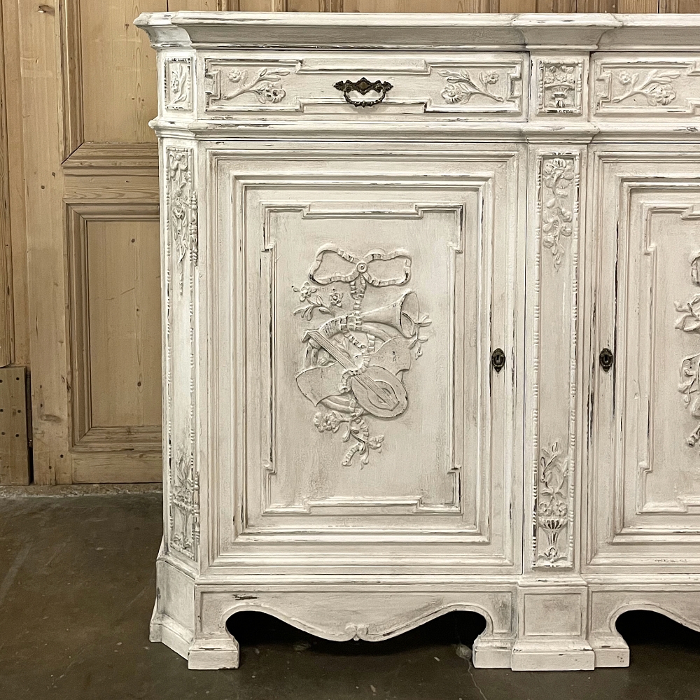 Sale19th Century French Louis XVI Painted Buffet is a splendid example of the neoclassical revival of the late 1800s, all rendered from solid old-growth white oak to beautify your home for centuries! Designed on an up-sized scale, it accommodates more storage capacity than normal two door buffets. The mitered corners soften the impact on the traffic pattern of the room. The solid base consists of flared feet and scrolled openings. What steals the show, however, is the astounding carved detail that appears from the top to the base! Wildflowers are framed by fine molded detail on the drawer facades, with a center plinth carved with a framed floral bouquet. The center stile under that plinth features complementary carvings that lead the eye down to the wonderfully crafted and embellished base. On the way, notice the exquisite relief sculpture of musical instruments on each door, with a different study on each, glorifying French traditional culture and the magic of music. All of the carved detail is enhanced by the patinaed painted finish which provides stunning highlights and softens the overall visual impact. Brass keyguards and drawer pulls complete the look.