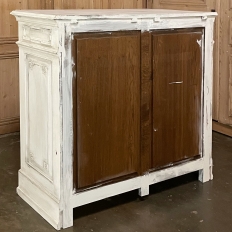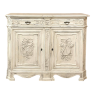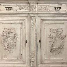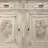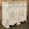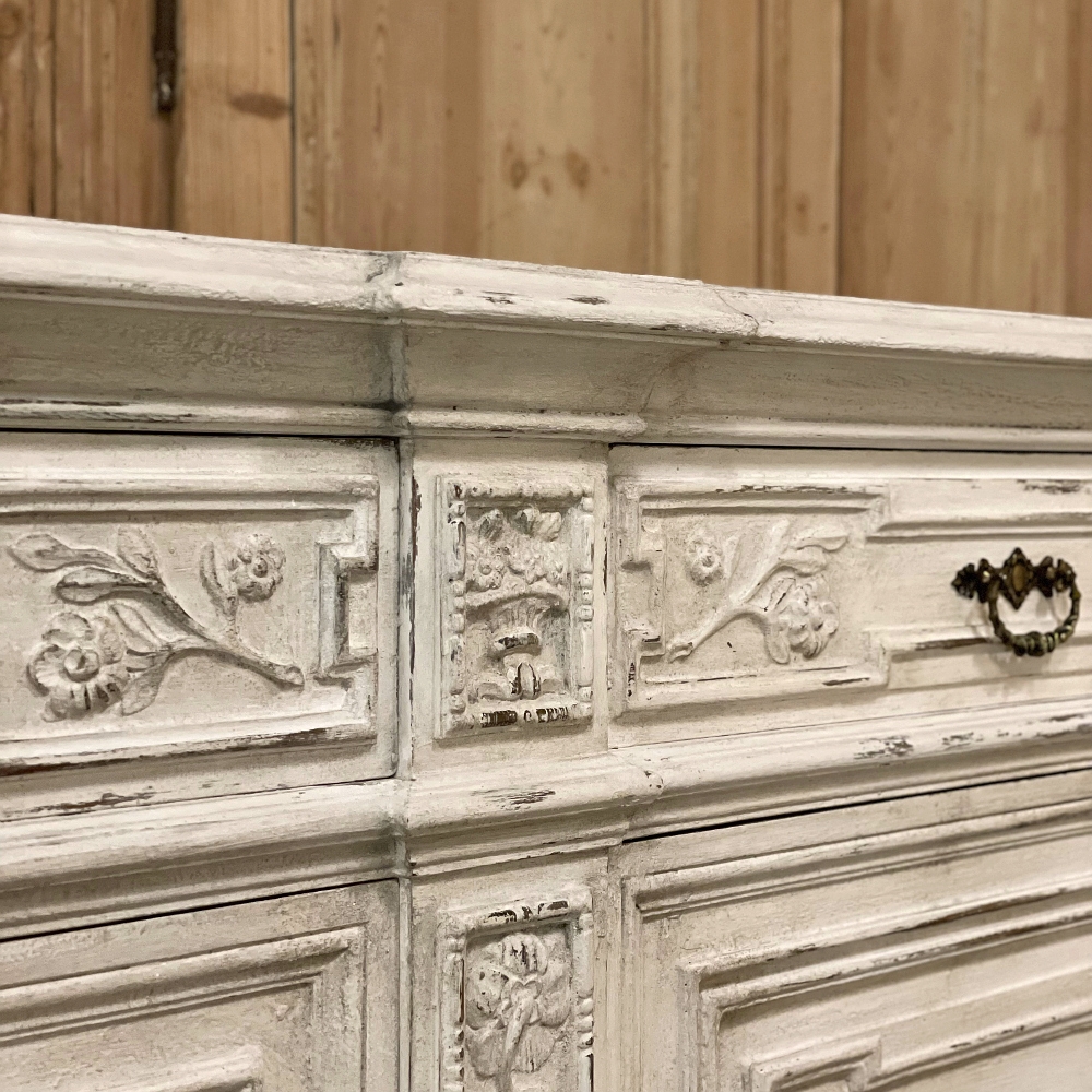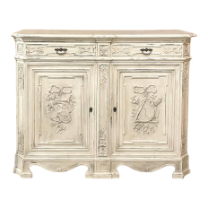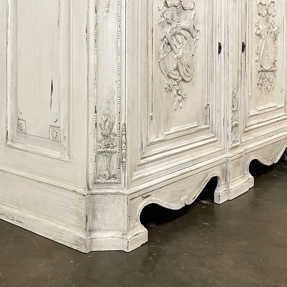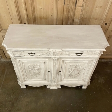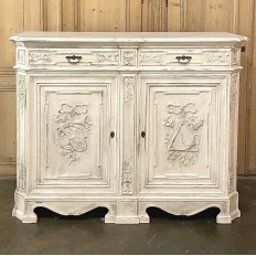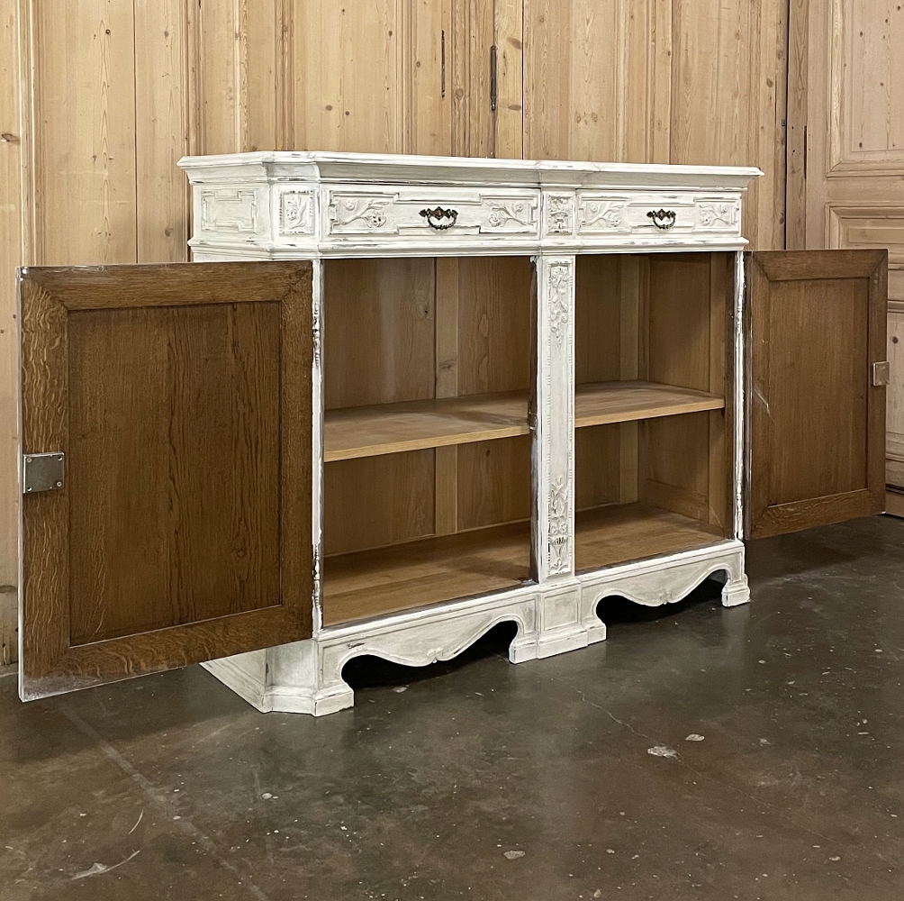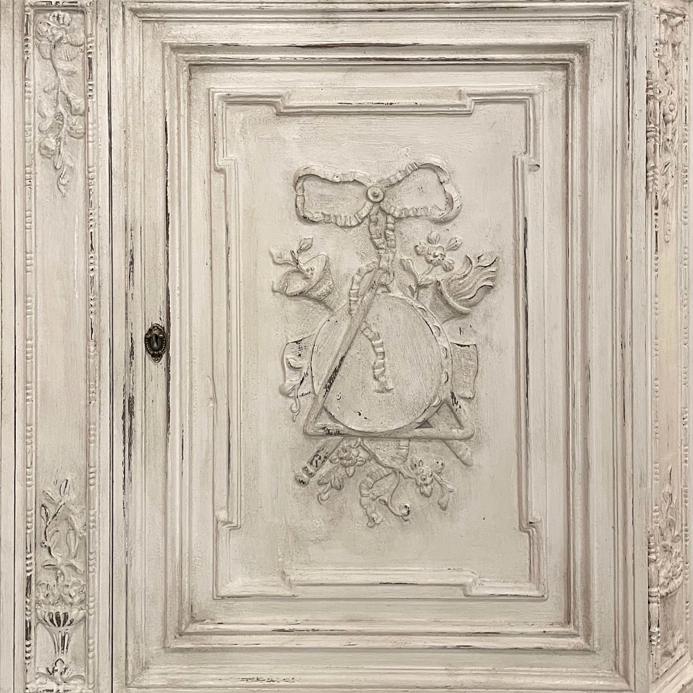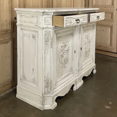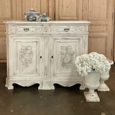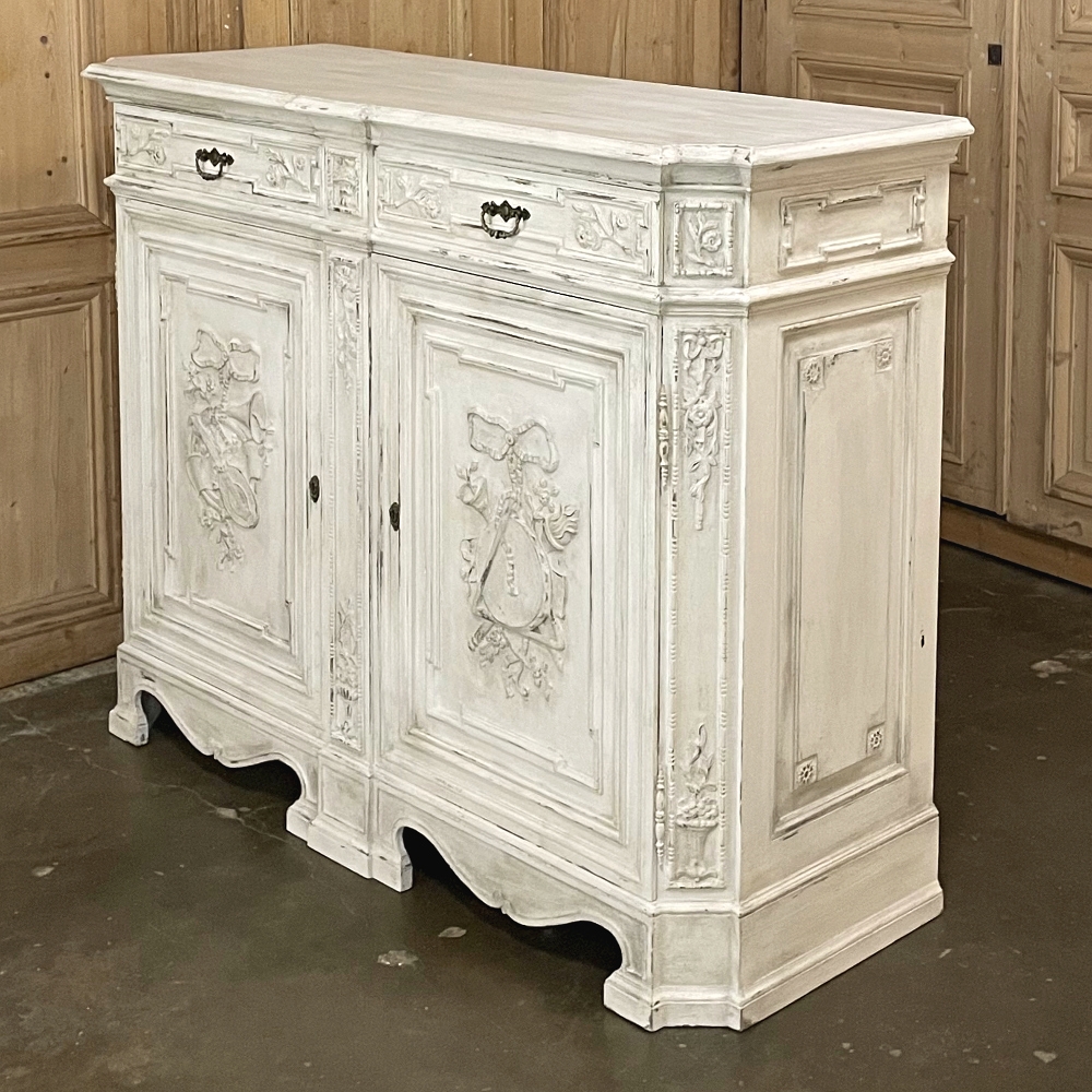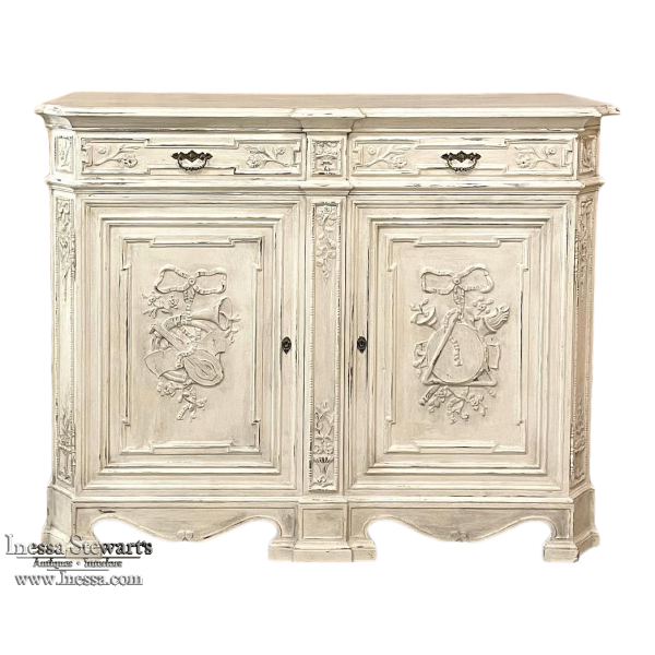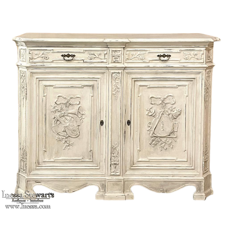 Sale19th Century French Louis XVI Painted Buffet is a splendid example of the neoclassical revival of the late 1800s, all rendered from solid old-growth white oak to beautify your home for centuries! Designed on an up-sized scale, it accommodates more storage capacity than normal two door buffets. The mitered corners soften the impact on the traffic pattern of the room. The solid base consists of flared feet and scrolled openings. What steals the show, however, is the astounding carved detail that appears from the top to the base! Wildflowers are framed by fine molded detail on the drawer facades, with a center plinth carved with a framed floral bouquet. The center stile under that plinth features complementary carvings that lead the eye down to the wonderfully crafted and embellished base. On the way, notice the exquisite relief sculpture of musical instruments on each door, with a different study on each, glorifying French traditional culture and the magic of music. All of the carved detail is enhanced by the patinaed painted finish which provides stunning highlights and softens the overall visual impact. Brass keyguards and drawer pulls complete the look.