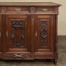 19th Century French Louis XVI Walnut Buffet is a glorious testament to the artistic talents of the sculptors who created such visual magnificence out of sumptuous French walnut! Set upon a classically-inspired architectural form, the piece features tapered and carved columns on each corner that provide a framework for the full relief sculptures of the beauty and bounty of the earth expressed in floral wreaths hung with ribbon and vines, as well as a torchere serving as an urn at the center. The three doors are separated by laurel leaf overlay on the stiles. Above the stiles and corner posts appear rosettes which also separate the three fluted drawers. Fluting also appears on the apron below, which is centered with a pair of crossed torcheres atop olive branches. Beautifully cast bronze key guards and drawer pulls complete the look.