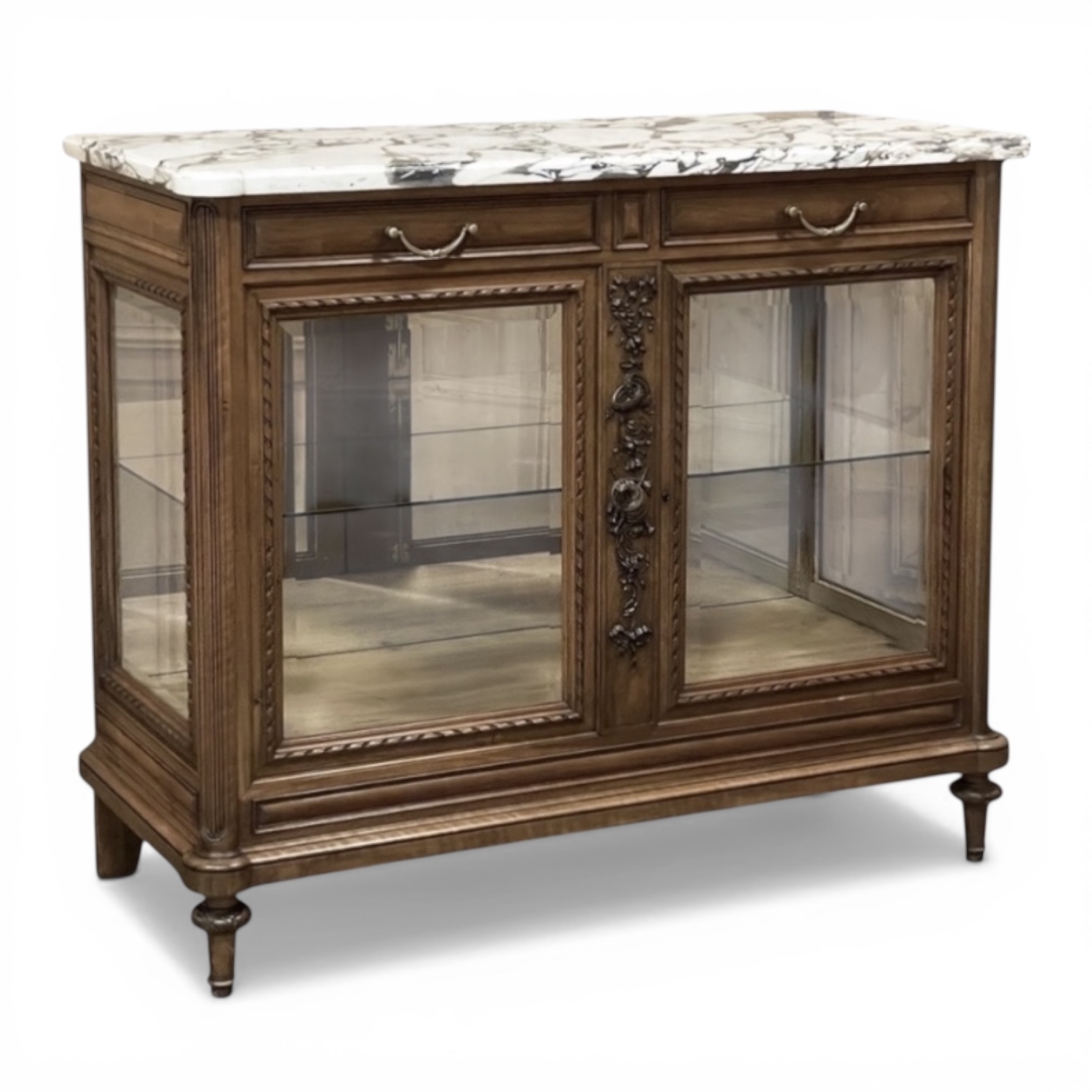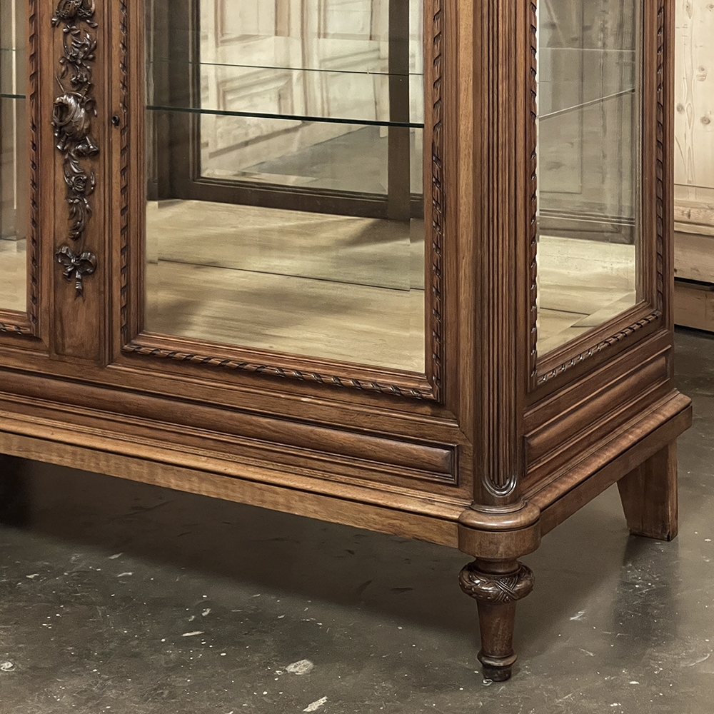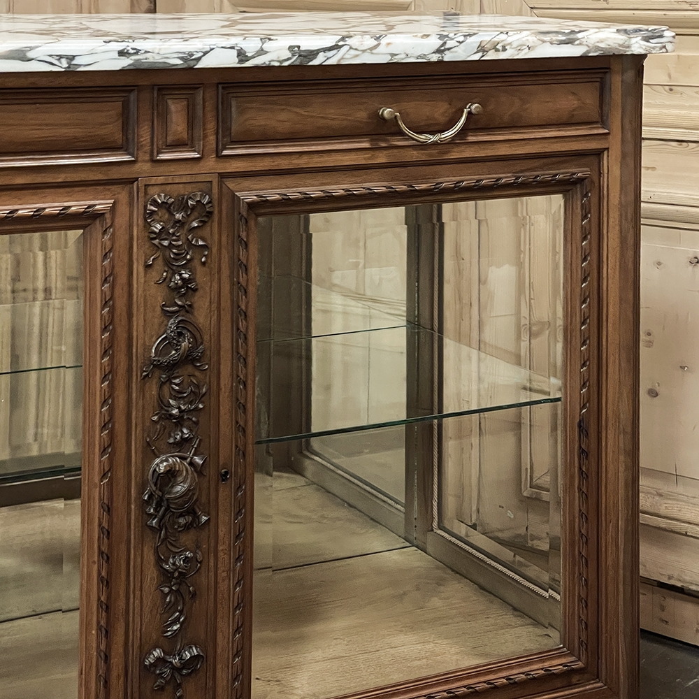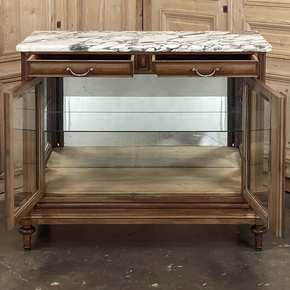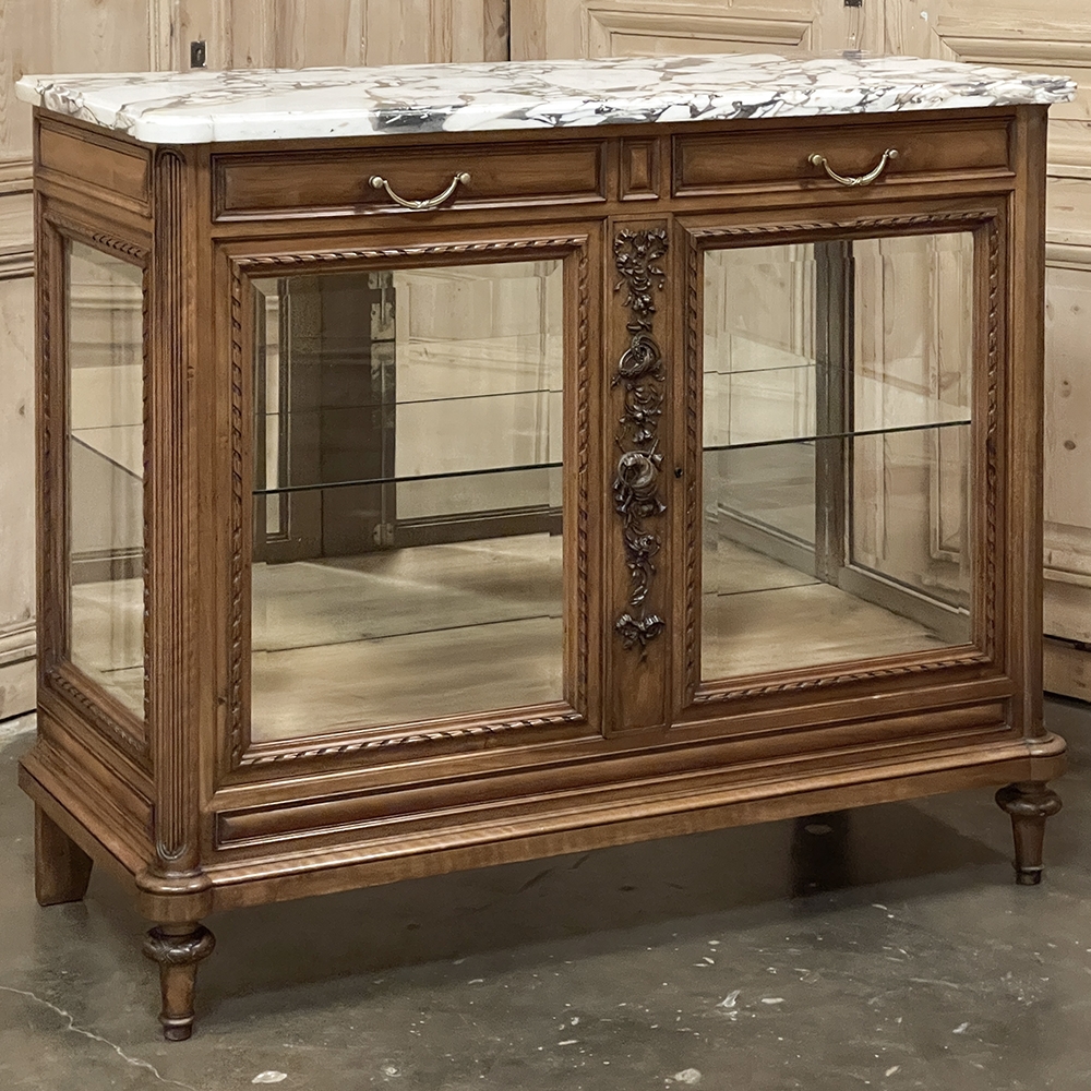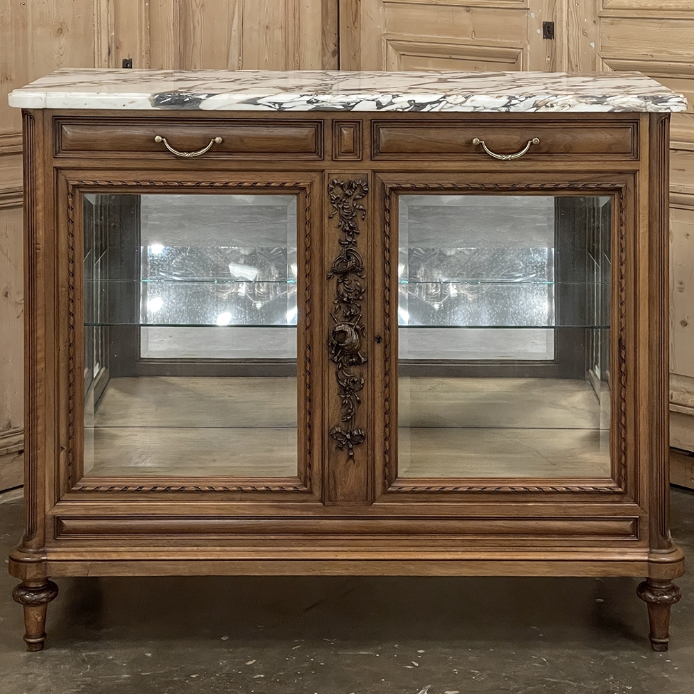 Found in Paris, this 19th century French buffet was crafted in walnut in a beautifully revived Louis XVI style, drawing inspiration from the refined taste and romantic decorative vocabulary associated with the Marie Antoinette era. Topped with richly veined marble, the cabinet is enclosed with original beveled glass on the front and sides, allowing light to move gracefully across the surface while offering an elegant presentation for china, silver, and cherished collections within. The façade is richly but delicately detailed, with ribbon-twist molding framing each pane, fluted corner posts, and original Louis XVI drawer hardware lending an unmistakable French character. Most captivating is the carved central stile, adorned with floral garlands, intertwined rings, and a charming pastoral motif that appears to evoke the shepherding themes so beloved in Louis XVI decorative arts. Romantic yet restrained, graceful yet tailored, the piece captures the poetry, elegance, and neoclassical balance of 19th century French design inspired by the world of Marie Antoinette.