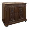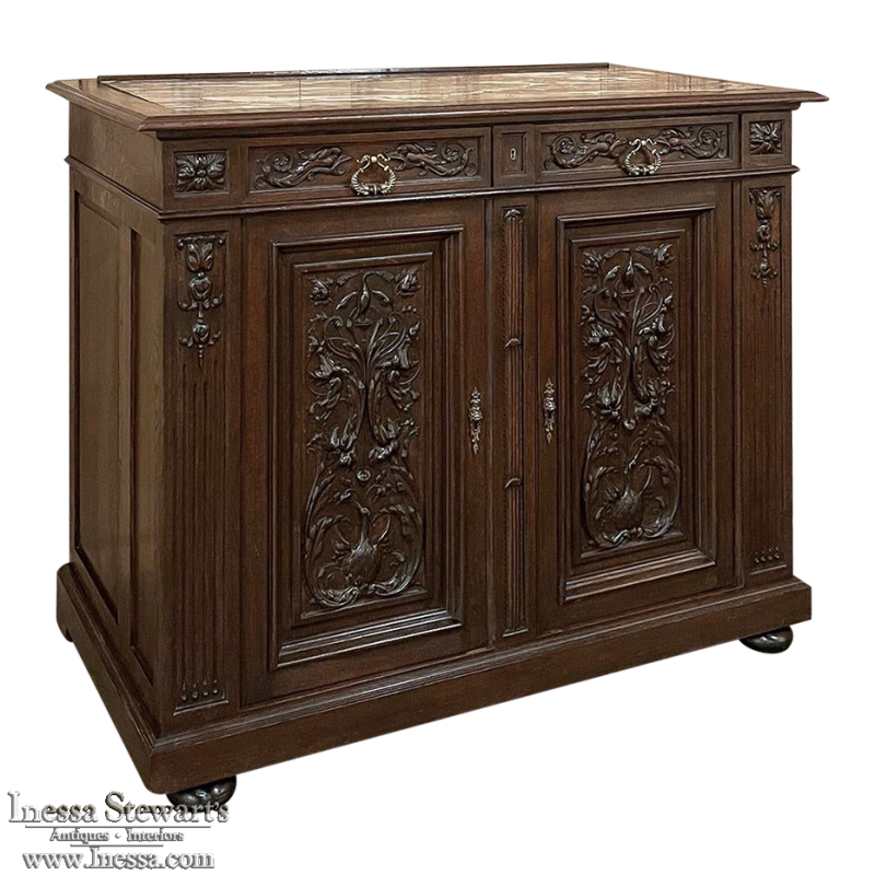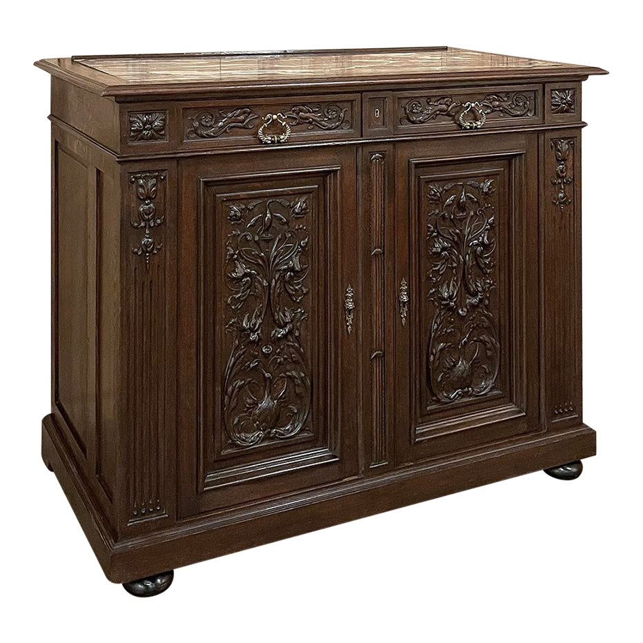 Sale19th Century French Louis XVI Walnut Marble Top Buffet is a marvelous example of the furniture maker's craft! Stately, tailored lines are framed by bold molding above and below, just over the bun feet. In between, evidence of a master wood sculptor appears on each large cabinet door. Stylized Renaissance-inspired motifs are intertwined in a stunning full relief work featuring naturalistic forms of flora and fauna. Above, two fierce sea creatures face off on either side of the cast bronze pulls, themselves made to depict dolphins. Cast bronze key guards also adorn the cabinet doors, which are framed by carved pilasters topped above with rosettes. Rouge marble has been inset into the top for a carefree elegant serving and display surface, while the drawers and cabinets open to reveal surprising storage!