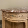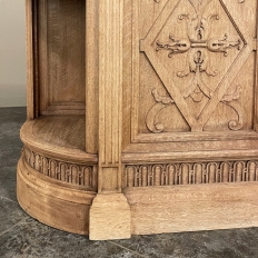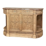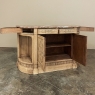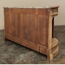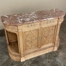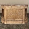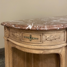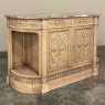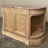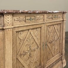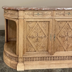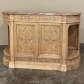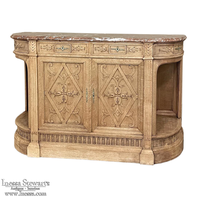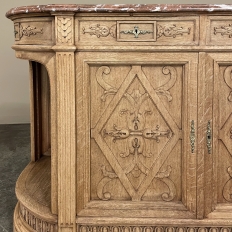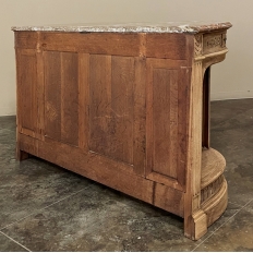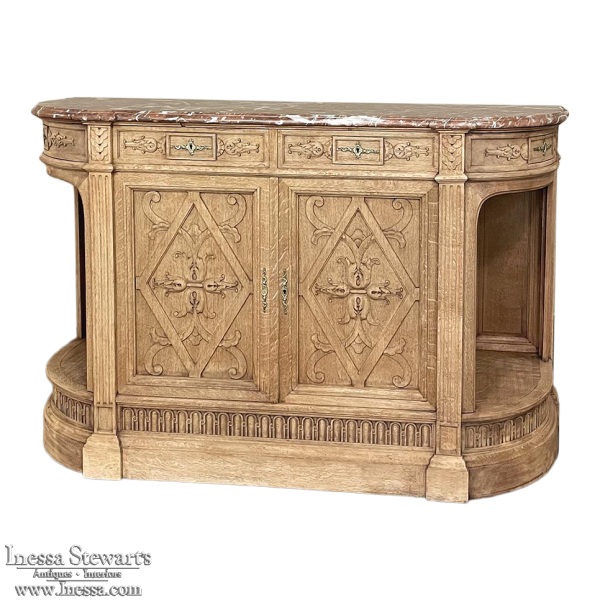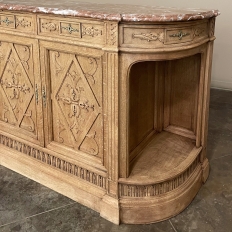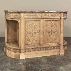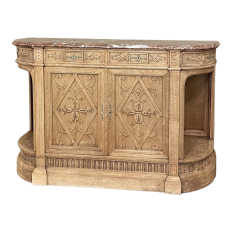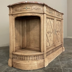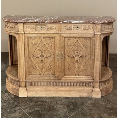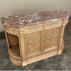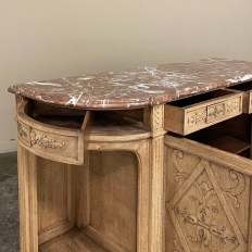 Sale19th Century French Neoclassical Marble Top Buffet combines elegance with a soft, casual visual presence making it compatible with a wide variety of interior styles! The rounded sides belie the measurements, making it more space-friendly than the dimensions would indicate. Topped with luxuriously veined marble that has been meticulously beveled and contoured to follow the lines of the casework below, it features a four drawer upper tier that is remarkable. The side doors pivot out in elongated pie-shaped forms, with rosettes on the back side of the frame and quatrefoil overlay on the front to frame the arc of the curvature. Foliates and shells carved in fine relief accentuate the drawers, centered with a rectangular framework that accents the jewelry-quality cast bronze key guard. Not to be outdone, the two front-facing drawers although flat on the surface, still boast the same fine carved detail and bronze keyguards. The bold cabinet doors below immediately capture one's attention, with diamond forms accentuated with carved foliates that complement the drawers above but on a larger scale. The doors are framed by fluted pilasters that defined the facade, and are positioned to frame the openings on each side that are fully paneled and designed to display objets d'art, sculptures, vases, or other keepsakes. The bold base molding is of two tiers, with the upper tier an exaggerated linked Greek coin in a colonnade effect, with impressive baseboard appearing underneath to complete the look.