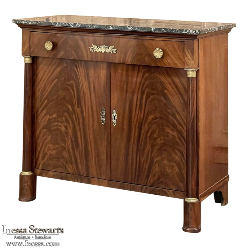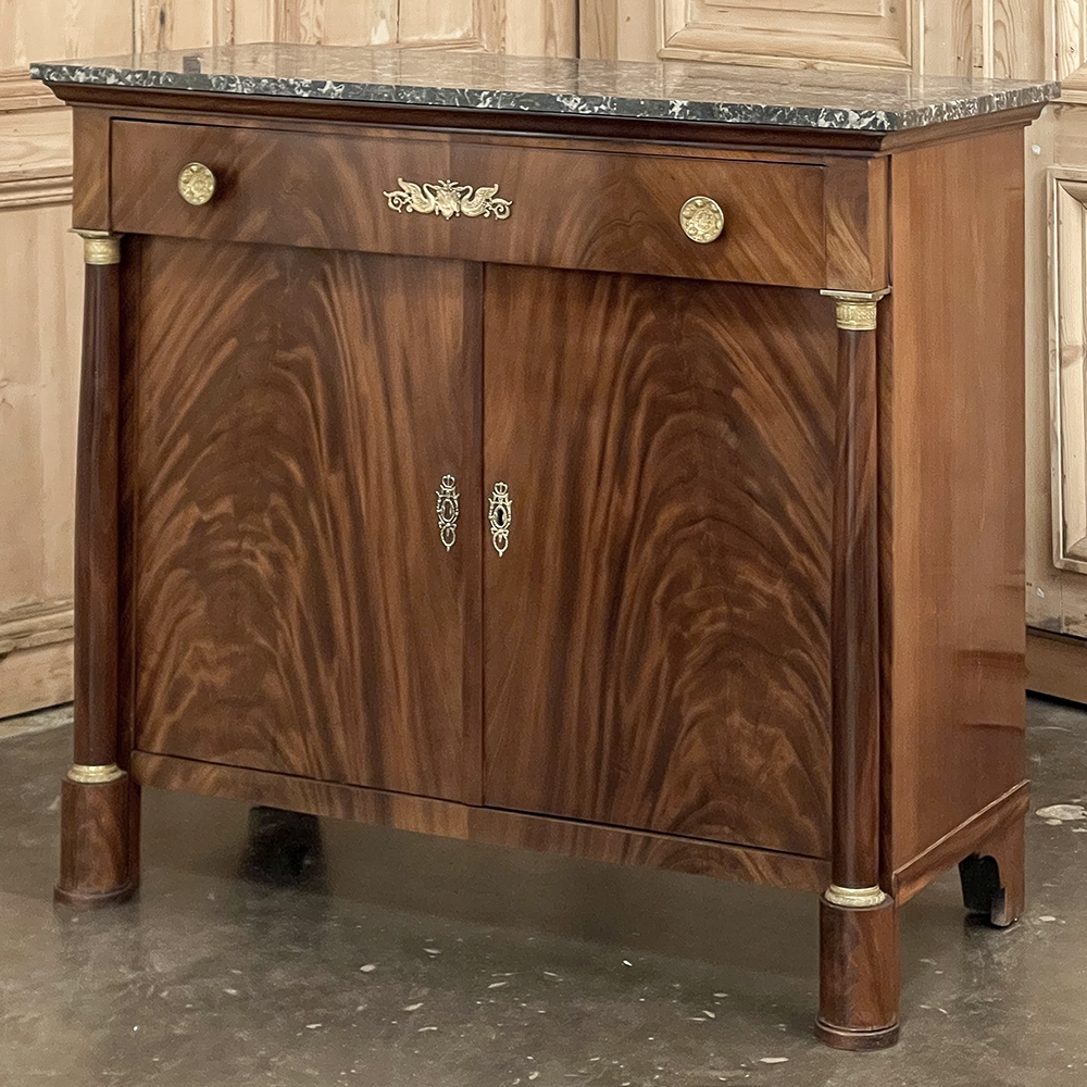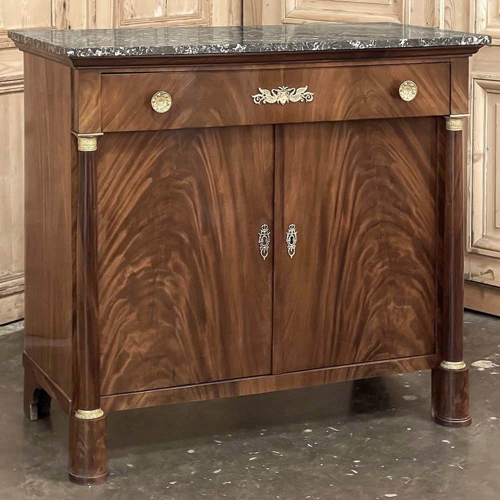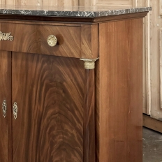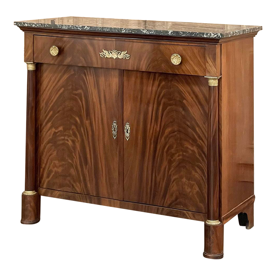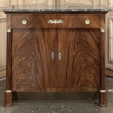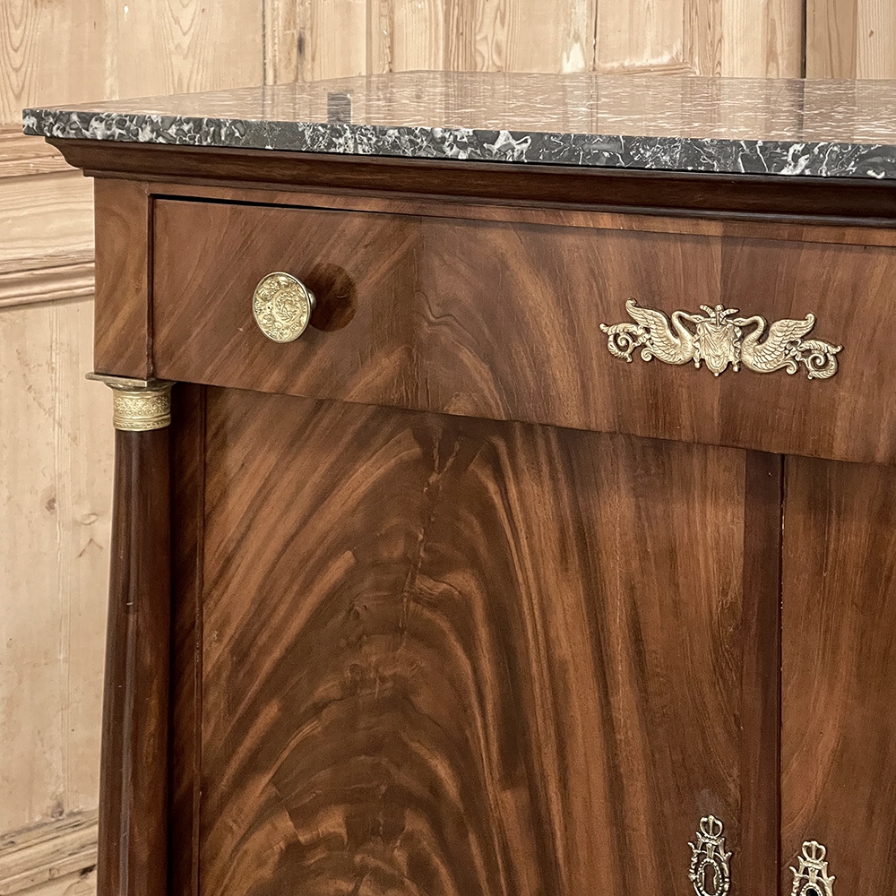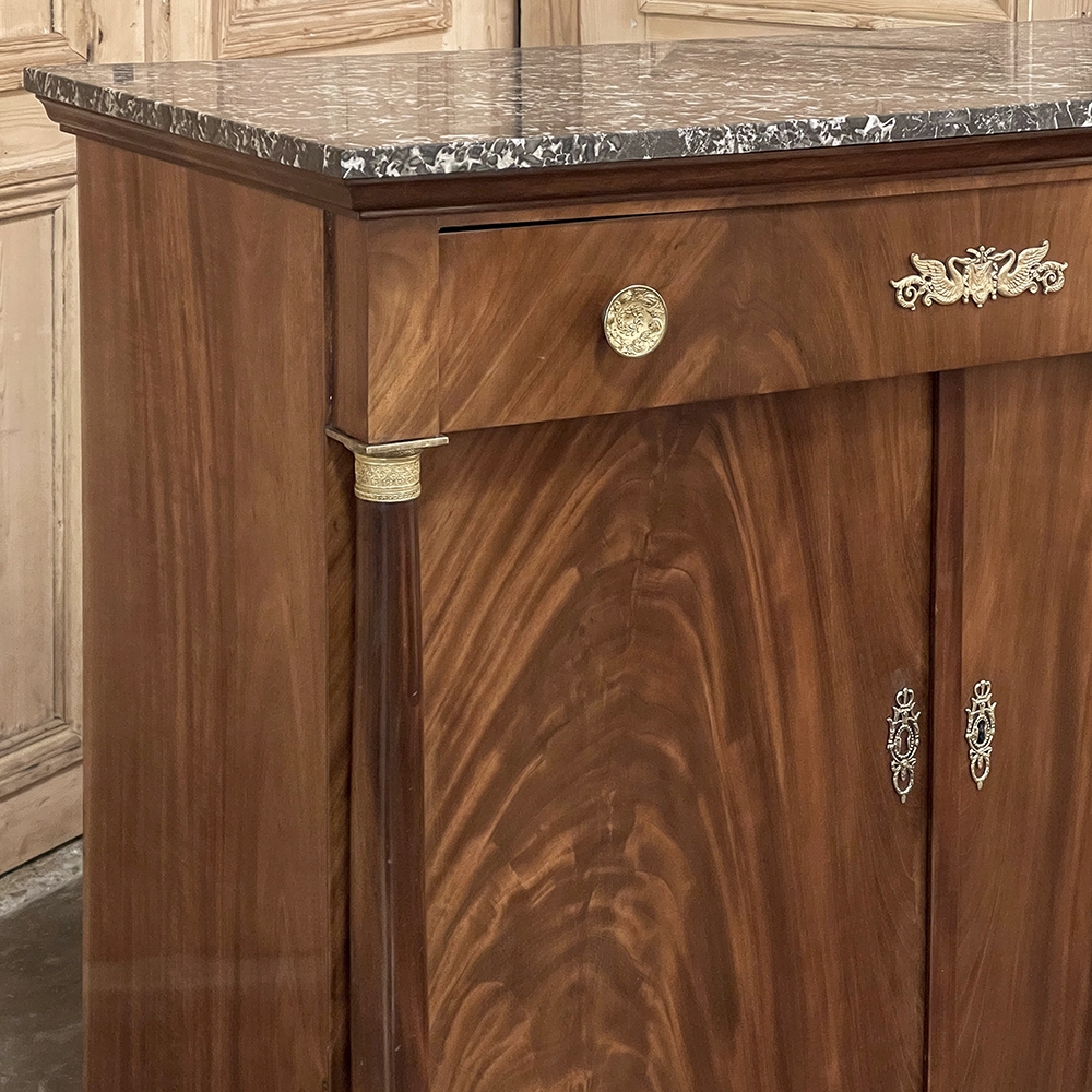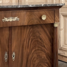 Sale19th Century French Second Empire Period Marble Top Buffet is a timeless example of the magnificent furnishings that emanated from France during the reign of Napoleon III. Using exotic imported mahogany, flame pattern veneering adorns the entire front facade, accented with cast bronze decoration on the drawer with finely detailed pulls, both above and below on the columns that flank the doors, and lastly the key guards. The stately elegance of the design cannot be denied, drawing its architecture from inspiration provided by the ancient Greek and Roman masters. A slab of intricately veined dark gray marble with white veins provides the perfect carefree surface. Doors open wide to reveal capacious storage, augmented by the deep, full width drawer above!