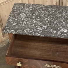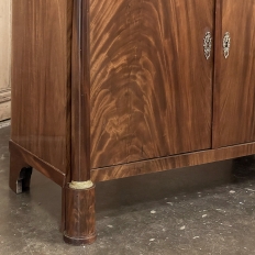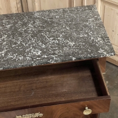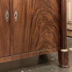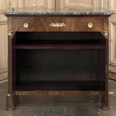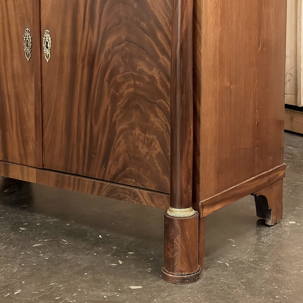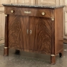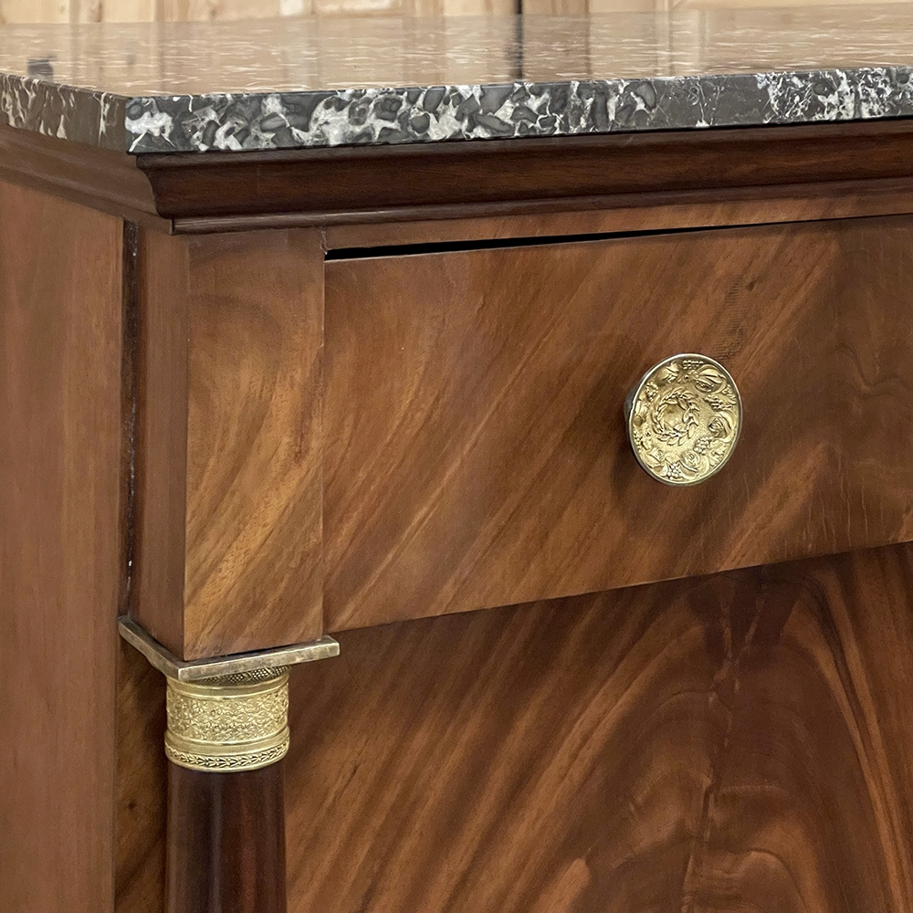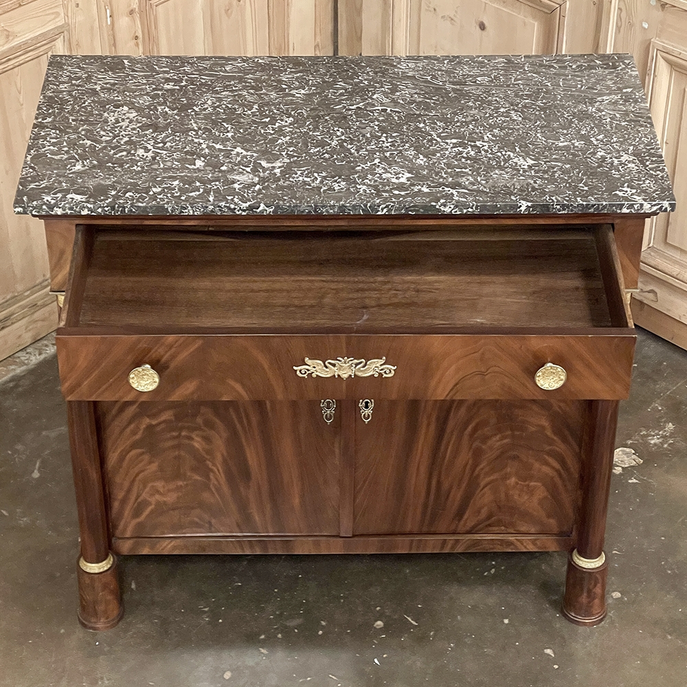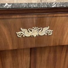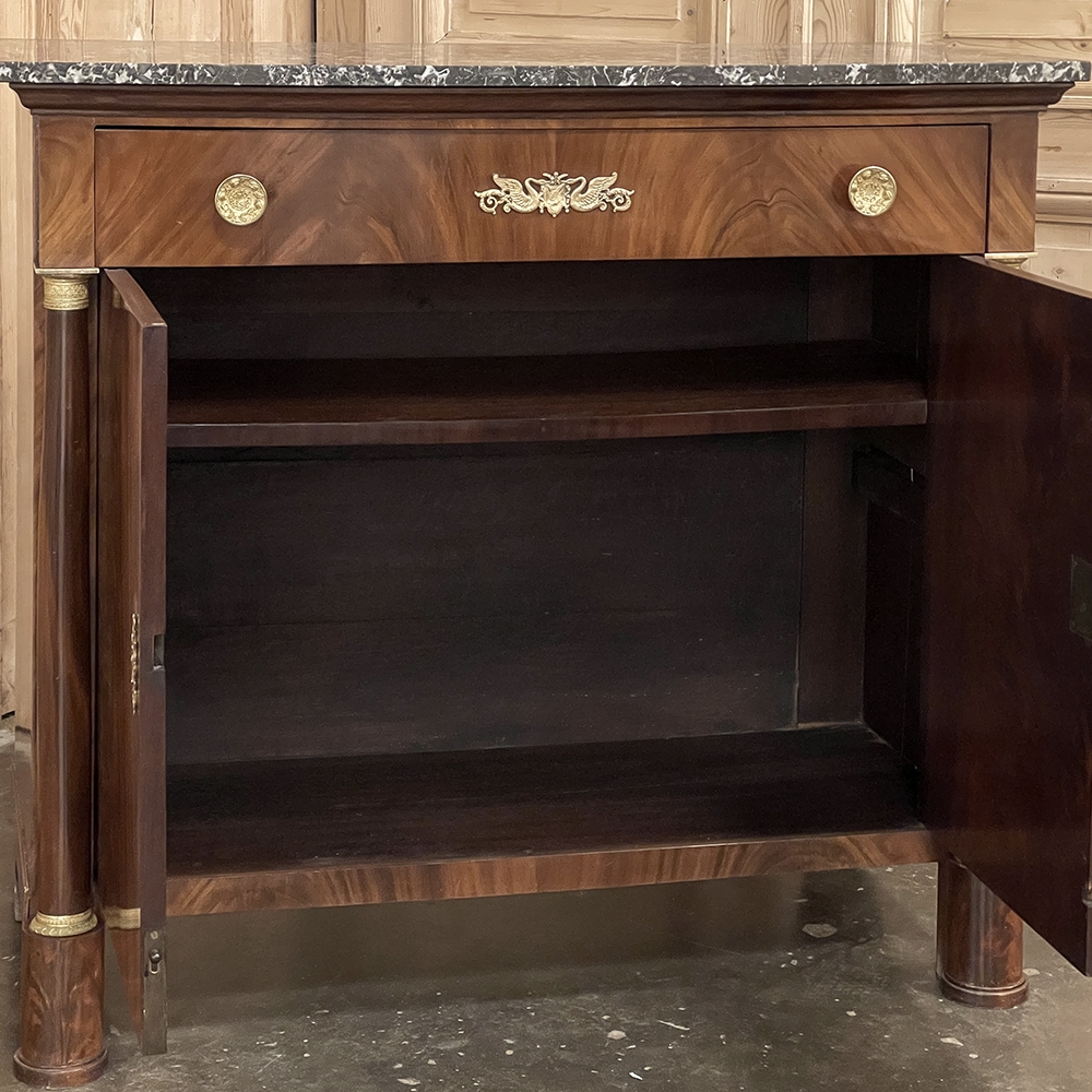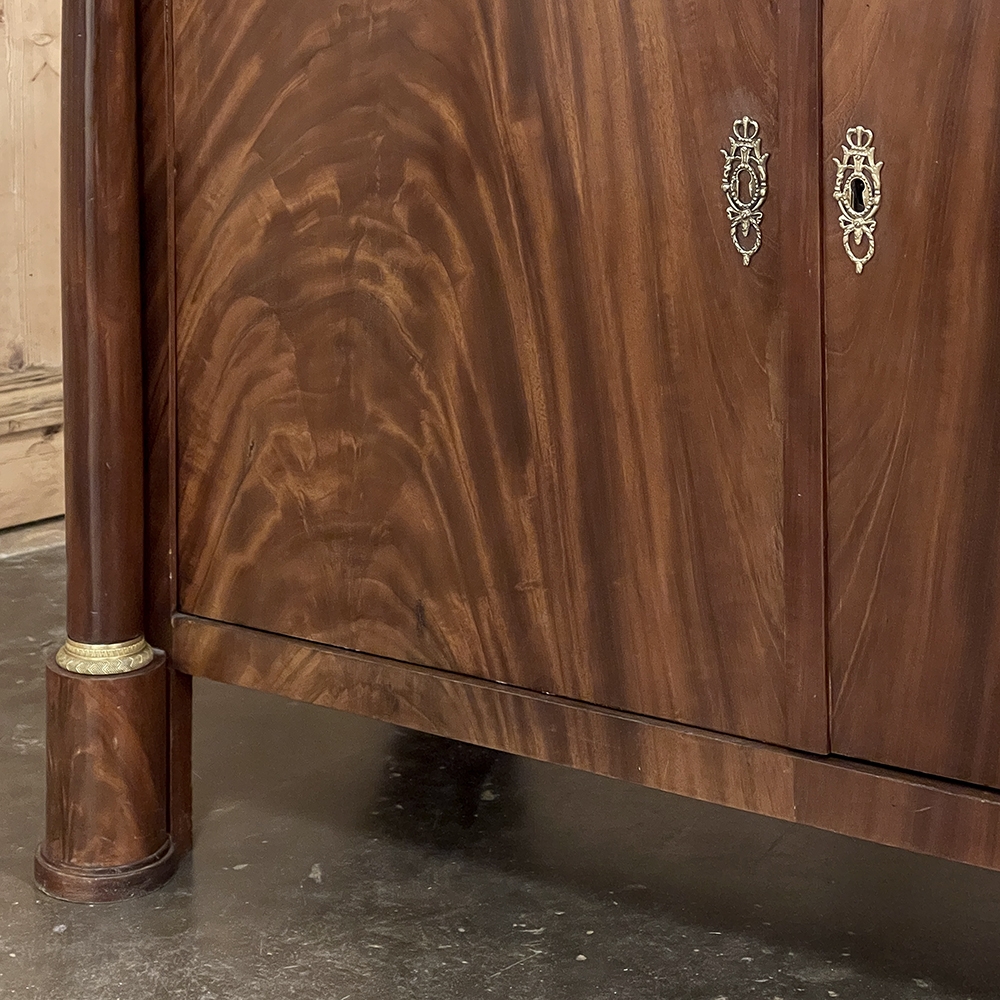 Sale19th Century French Second Empire Period Marble Top Buffet is a timeless example of the magnificent furnishings that emanated from France during the reign of Napoleon III. Using exotic imported mahogany, flame pattern veneering adorns the entire front facade, accented with cast bronze decoration on the drawer with finely detailed pulls, both above and below on the columns that flank the doors, and lastly the key guards. The stately elegance of the design cannot be denied, drawing its architecture from inspiration provided by the ancient Greek and Roman masters. A slab of intricately veined dark gray marble with white veins provides the perfect carefree surface. Doors open wide to reveal capacious storage, augmented by the deep, full width drawer above!