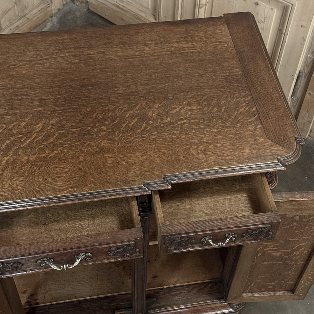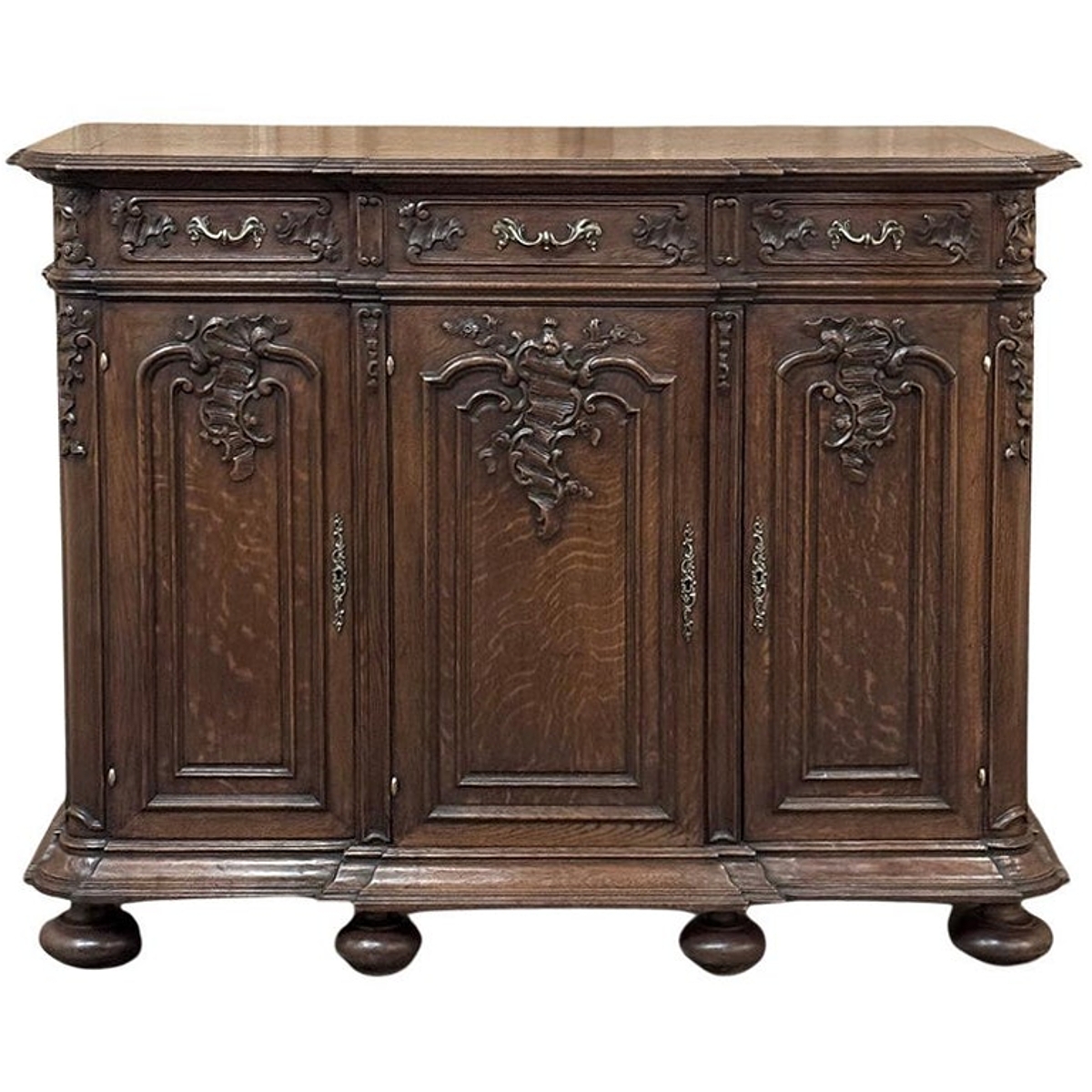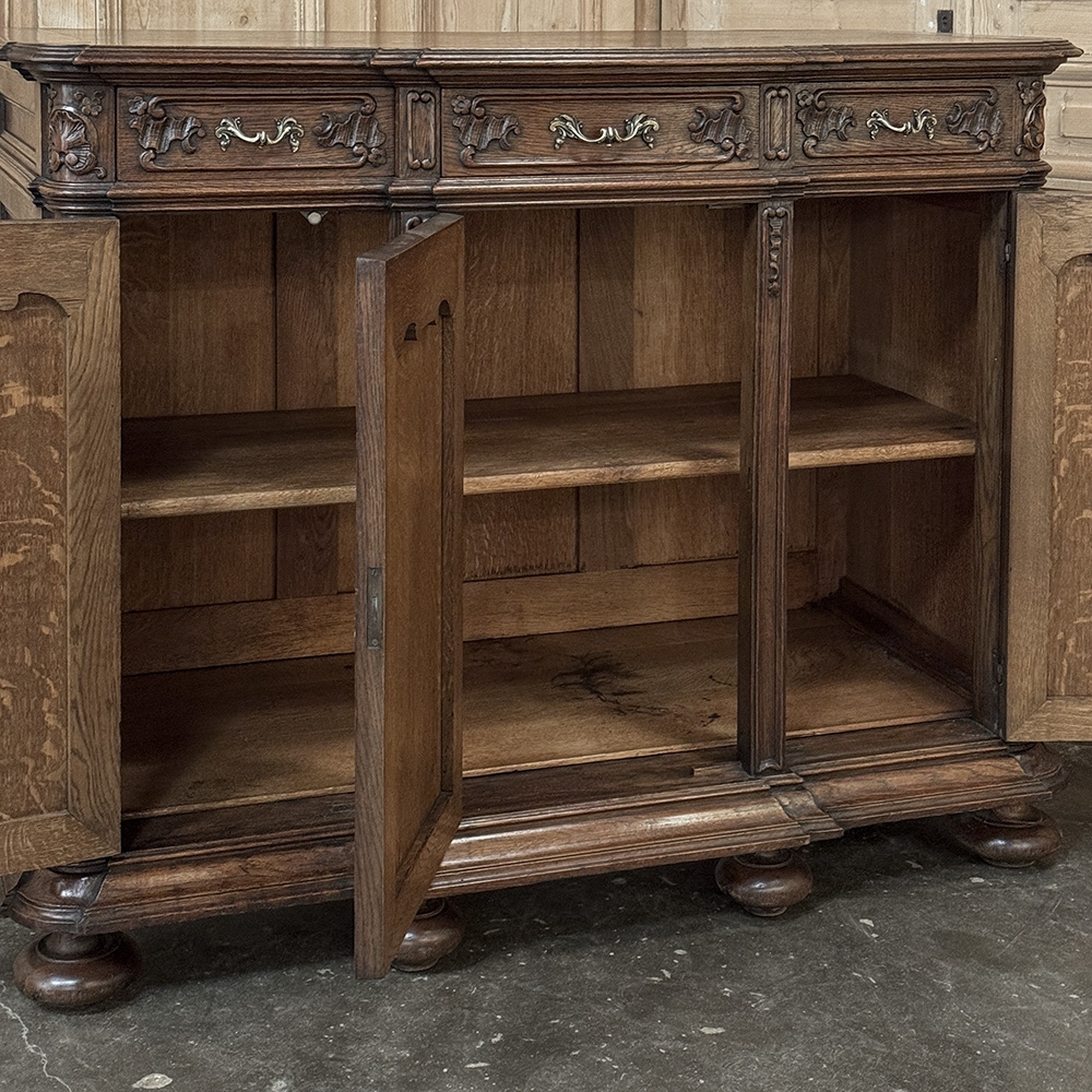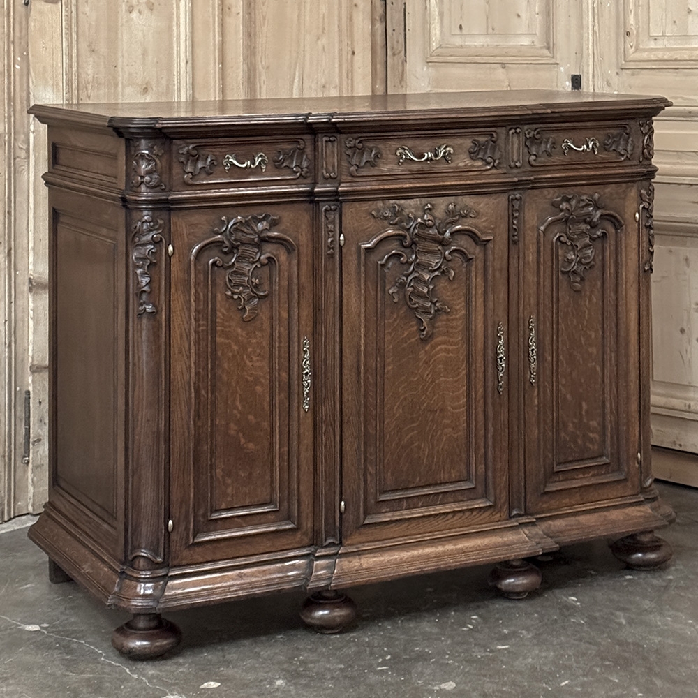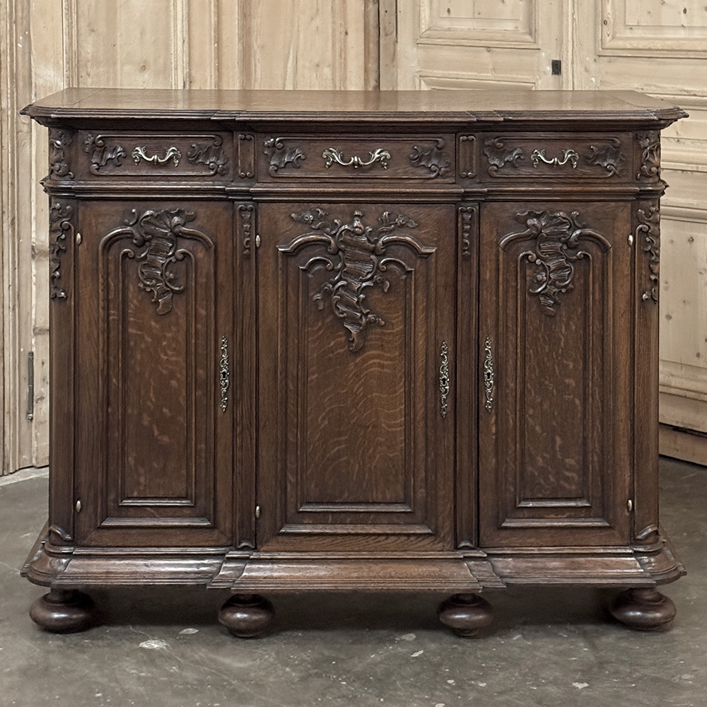 19th Century Liegoise Louis XIV Three Door Buffet is a classic example of the master craftsmanship of the artisans of Liege, a storied region located in the heart of northern Europe famed for its industry and traditions dating back centuries. This example features timeless Louis XIV styling with an intricately contoured and molded casework with a step-front architectural feature. Three drawers and as many cabinet doors are all hand-carved with elegant foliate and stylized shell motifs, with complementary carvings on the mitered corners which is a trademark design feature from the region. Cast brass drawer pulls and key guards add a nice visual accent. Hand-crafted from solid oak, it exudes quality and promises to provide enjoyment to you and your family for generations to come.