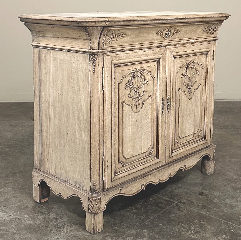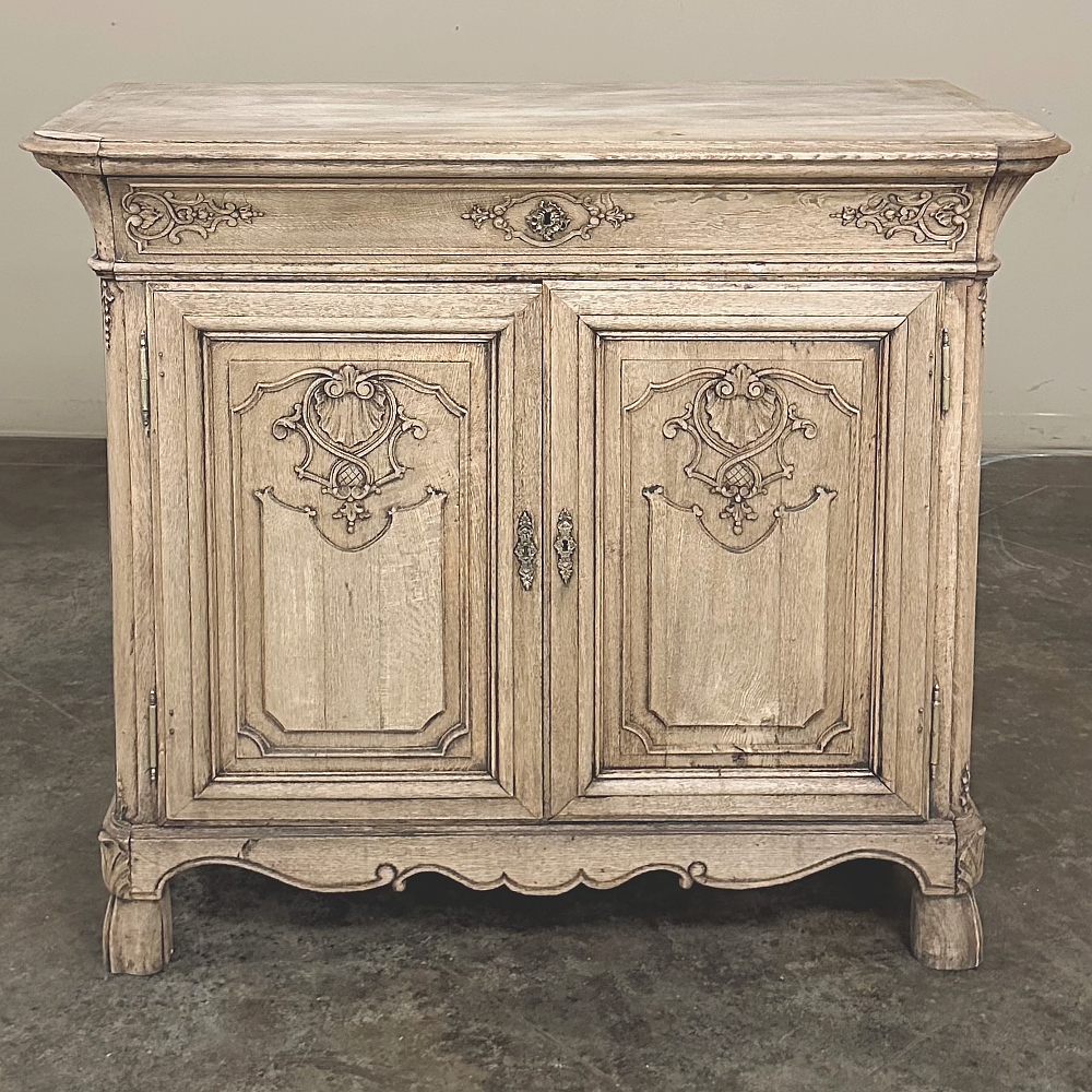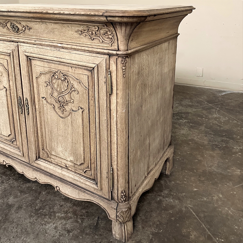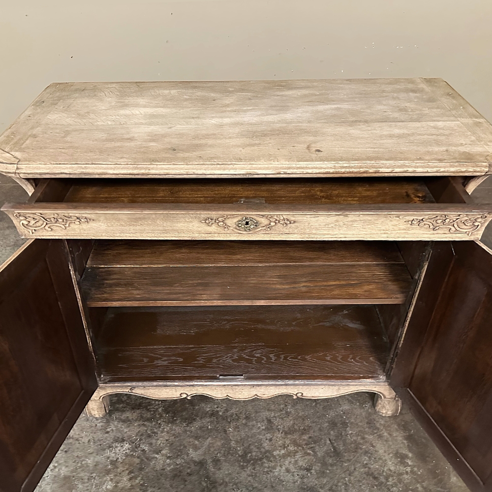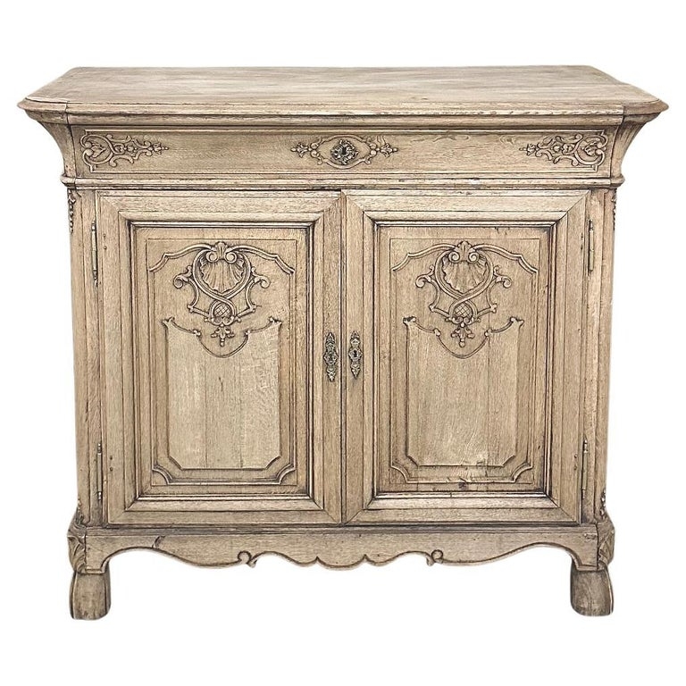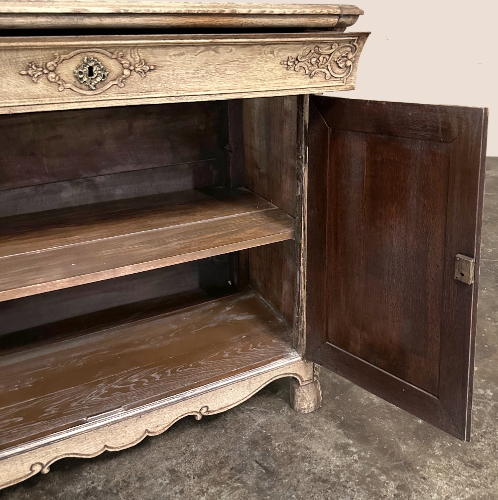 19th Century Louis XIV Buffet is a handsome piece that will add just the right amount of storage and display surface to any room! Hand-crafted from solid planks of old-growth oak, it features a concave curvature of the upper tier which became popular starting at the beginning of the Louis Philippe period, and in this case embellished with carvings on the corners and fitted with a concave drawer facade the full width of the piece, embellished with refined scrollwork, floral and foliate carvings in bas relief, centered with a cast brass key guard. Cast brass keyguards and brass barrel hinges also adorn the lower cabinet doors, which meet in the middle without a stile, providing unfettered access to the surprising amount of storage within. Carved with shell, foliate and fine molding details, the doors lead the eye down to the tastefully scrolled apron with cloven hoof feet.