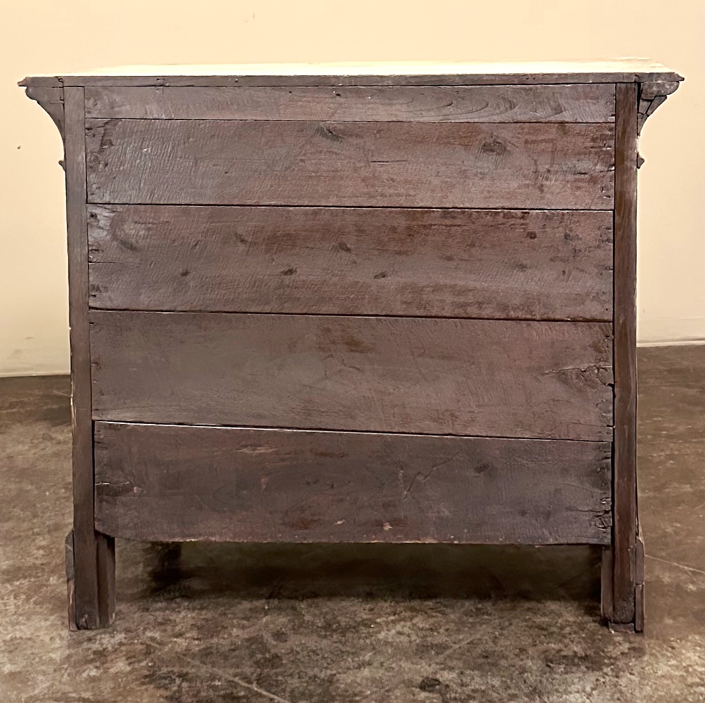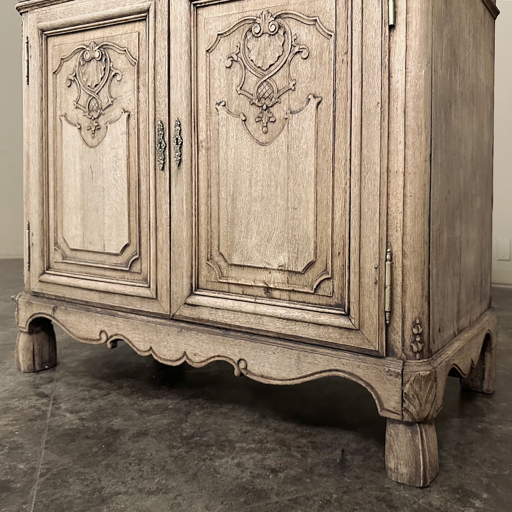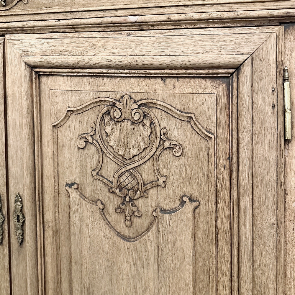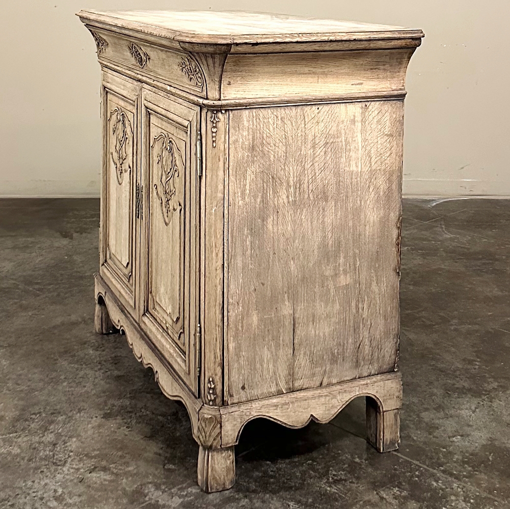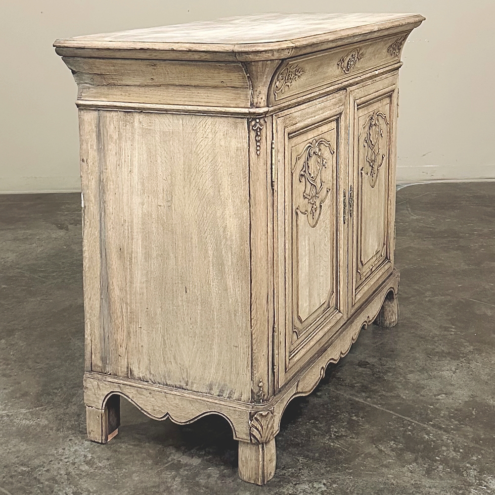 19th Century Louis XIV Buffet is a handsome piece that will add just the right amount of storage and display surface to any room! Hand-crafted from solid planks of old-growth oak, it features a concave curvature of the upper tier which became popular starting at the beginning of the Louis Philippe period, and in this case embellished with carvings on the corners and fitted with a concave drawer facade the full width of the piece, embellished with refined scrollwork, floral and foliate carvings in bas relief, centered with a cast brass key guard. Cast brass keyguards and brass barrel hinges also adorn the lower cabinet doors, which meet in the middle without a stile, providing unfettered access to the surprising amount of storage within. Carved with shell, foliate and fine molding details, the doors lead the eye down to the tastefully scrolled apron with cloven hoof feet.