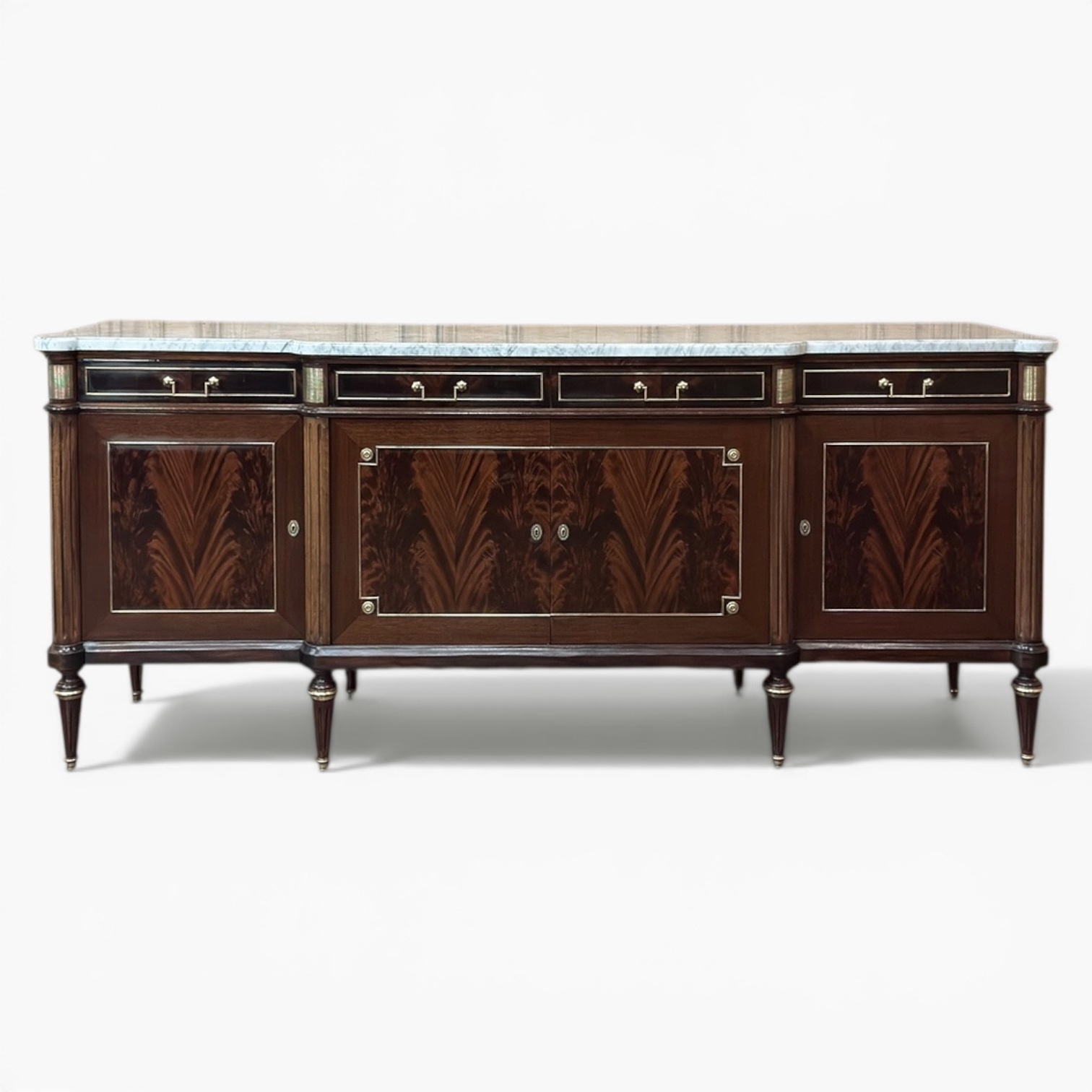 Antique Directoire Style French Mahogany Buffet with Carrara Marble Top is a striking and elegantly proportioned piece, distinguished by its richly figured veneer and refined, architectural presence. The façade is beautifully composed with bookmatched panels, creating a dramatic, flame-like movement across the doors, while the clean lines and subtle projections give the piece a confident, composed stance.
