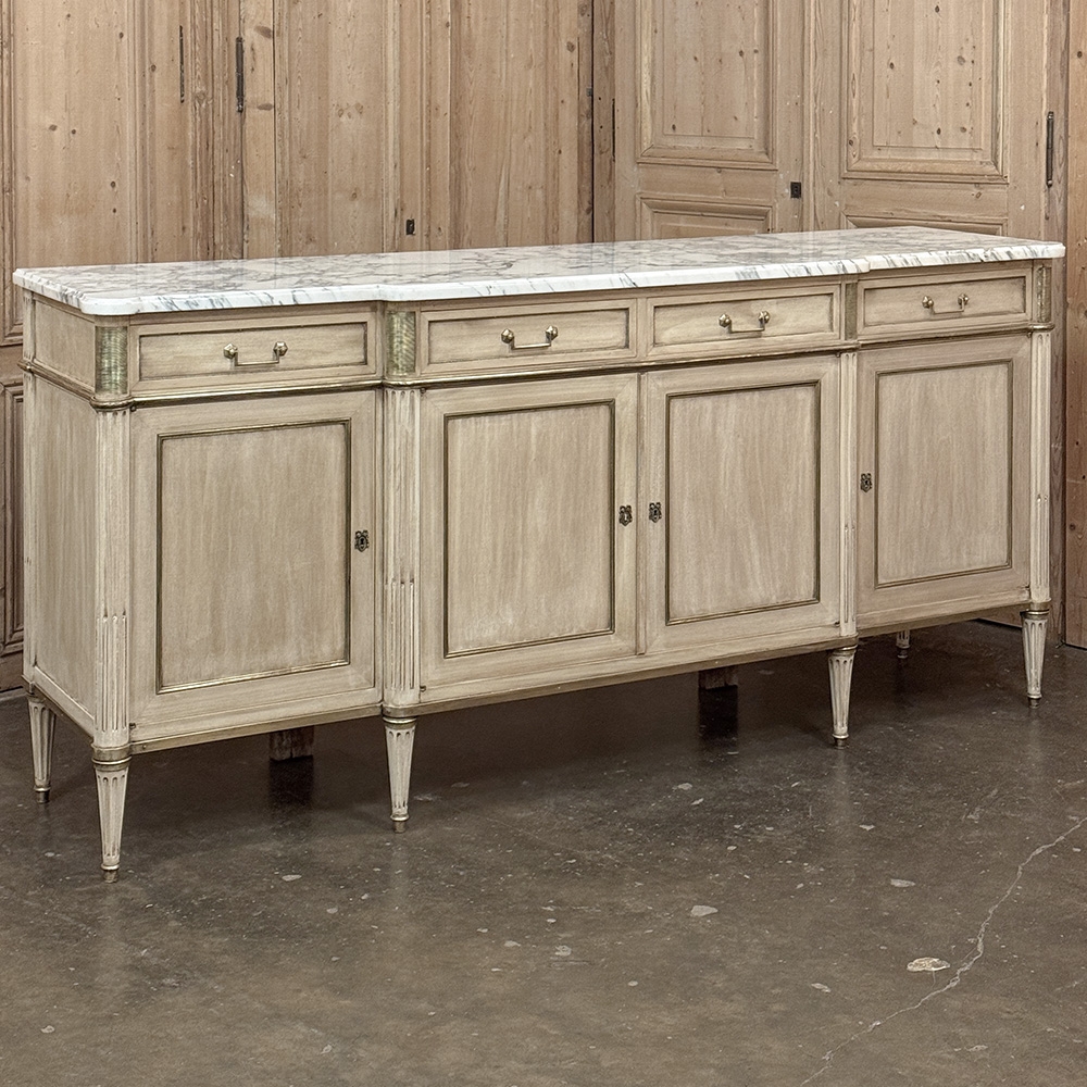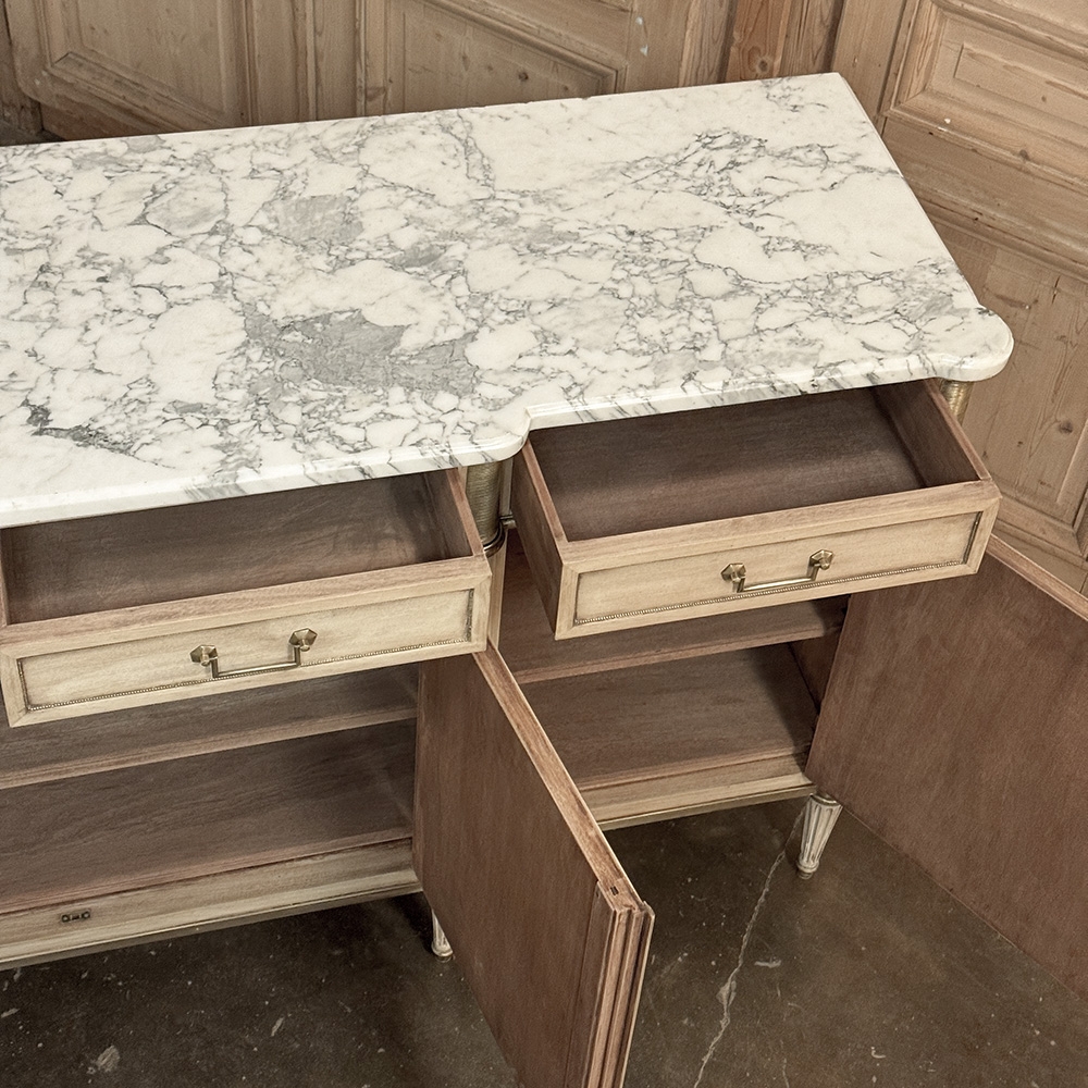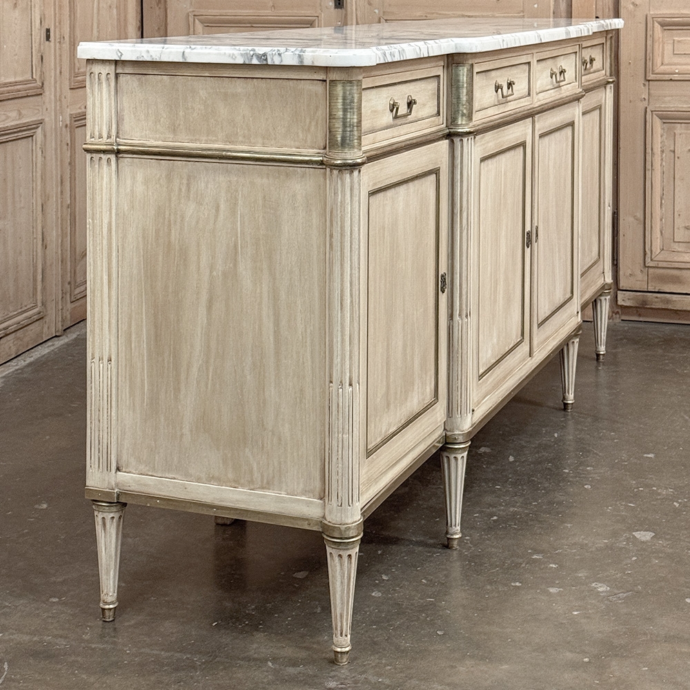 Antique French Directoire Stripped Buffet with Carrara Marble Top is of superb scale and proportion, yet adds a lighter toned visual presence to the room, thanks to our proprietary stripped finish and the luxuriously veined Cararra marble on top! The marble is beveled and contoured to follow the step-front center section. Four drawers and four cabinet doors open to reveal truly cavernous storage within, with each drawer and door trimmed in quarter-round brass molding. Tailored rectangular brass bale pulls and brass jalouses on the cornerposts add a nice flair, with fluting and reeding on the columns continued down to the tapered legs below. Perfect for making an understated elegance statement!