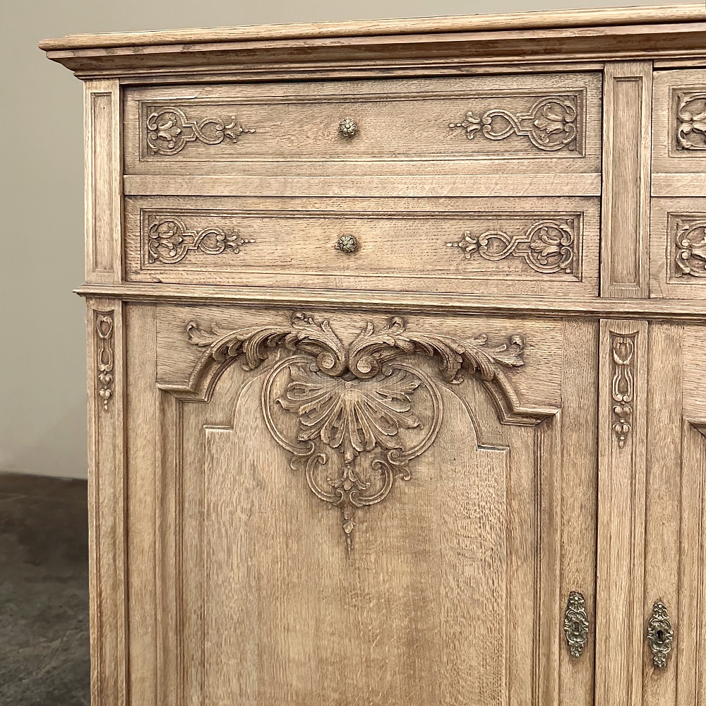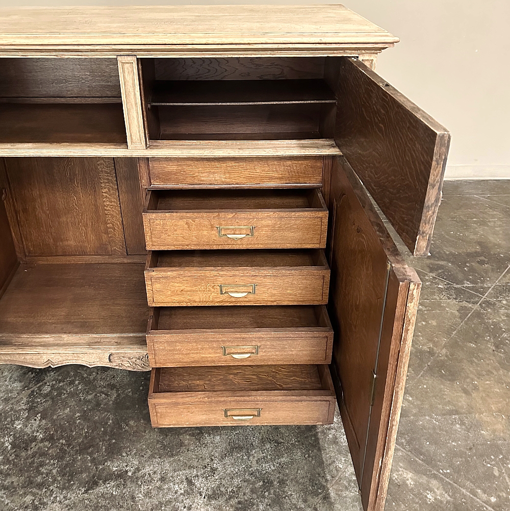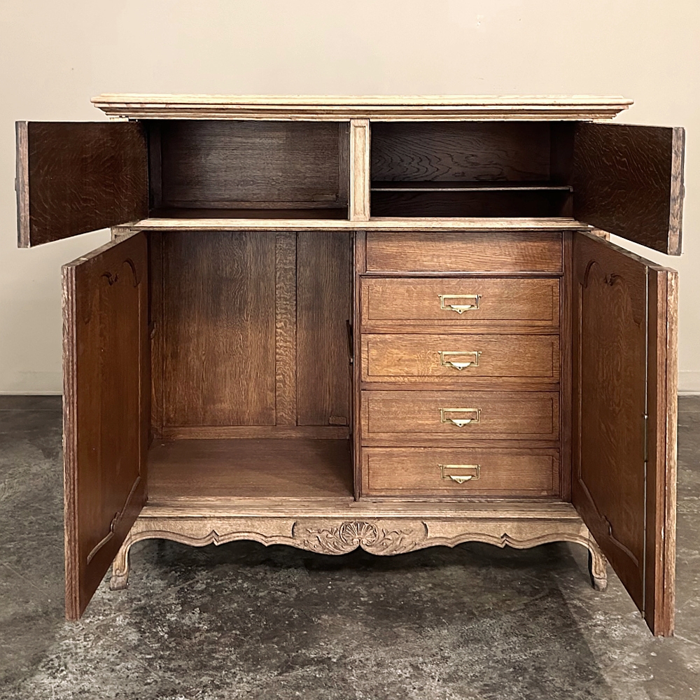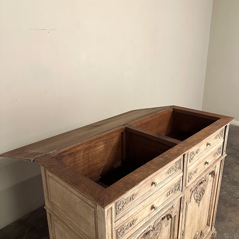 Antique French Louis XIV Buffet ~ Silver Chest ~ Cabinet is a remarkably crafted piece designed to keep dining room appurtenances organized and at the ready! Four faux drawers appear at the top, which are actually two doors that open to the divided compartment, which is also accessible with a trunk-like lid that is the entire top of the piece! The two large lower doors open in the traditional buffet style to allow access to a large storage space on the left, and a stack of interior drawers on the right, perfect for keeping silverware, linens, or other items handy and organized. The entire piece was crafted from solid oak, then adorned with Louis XIV-inspired carved detail including the classic shell, floral and foliate motifs. Scrolled frameworks, apron and legs only add to the elegance. Painstakingly stripped using our proprietary process that retains the patina and sheer natural beauty of the old wood, all performed by our expert in-house staff.