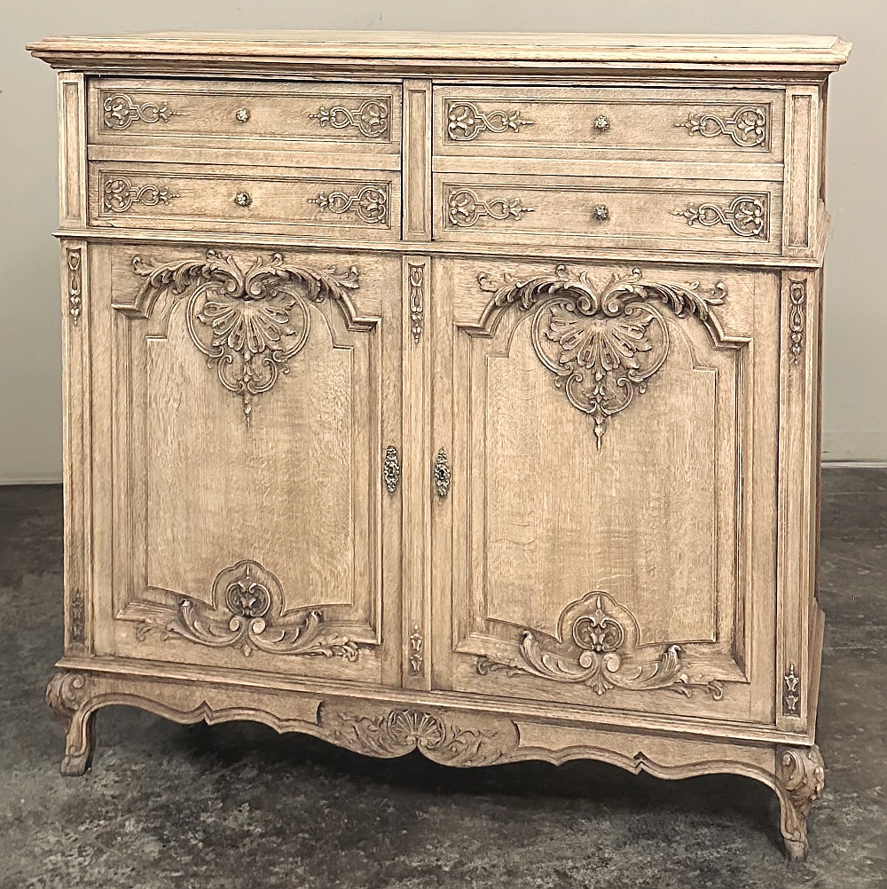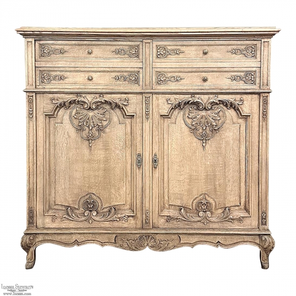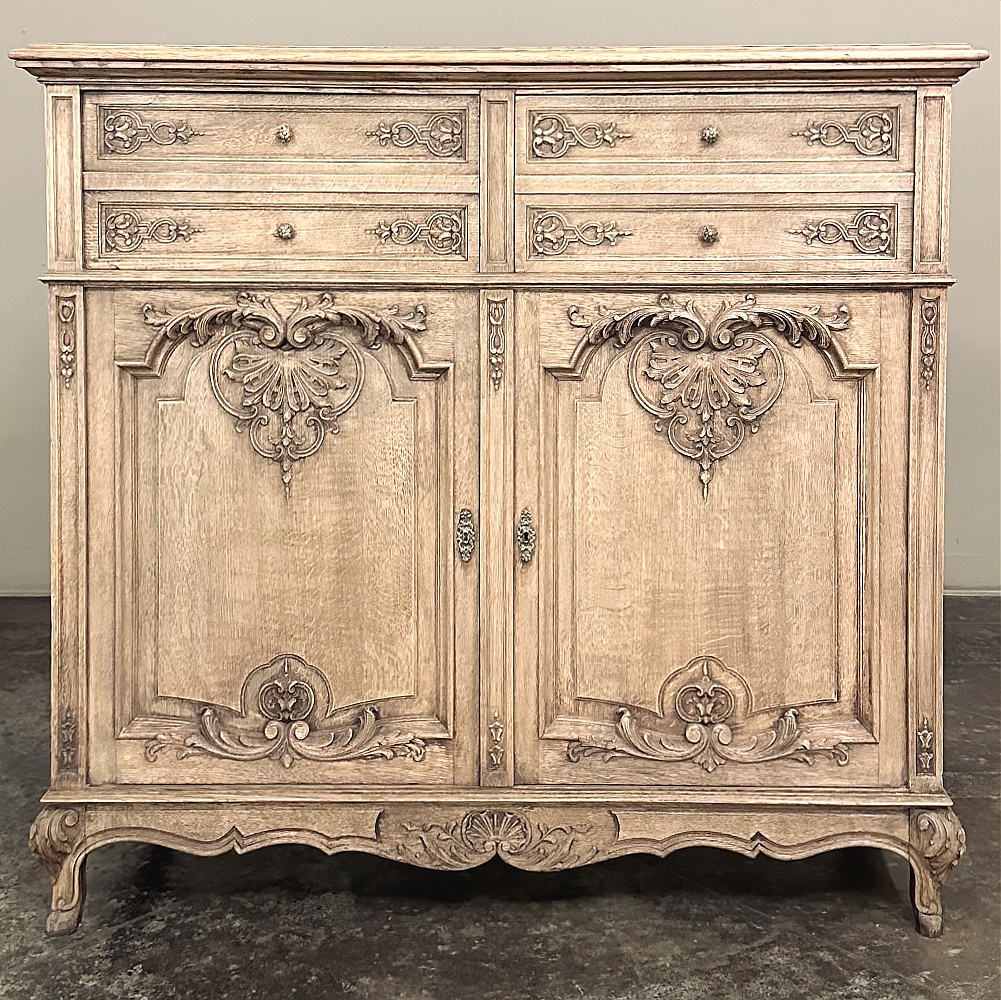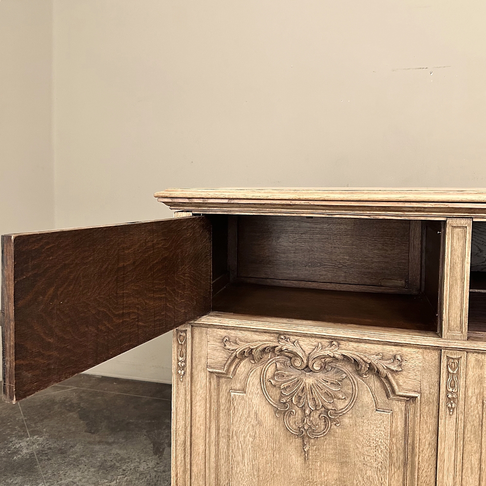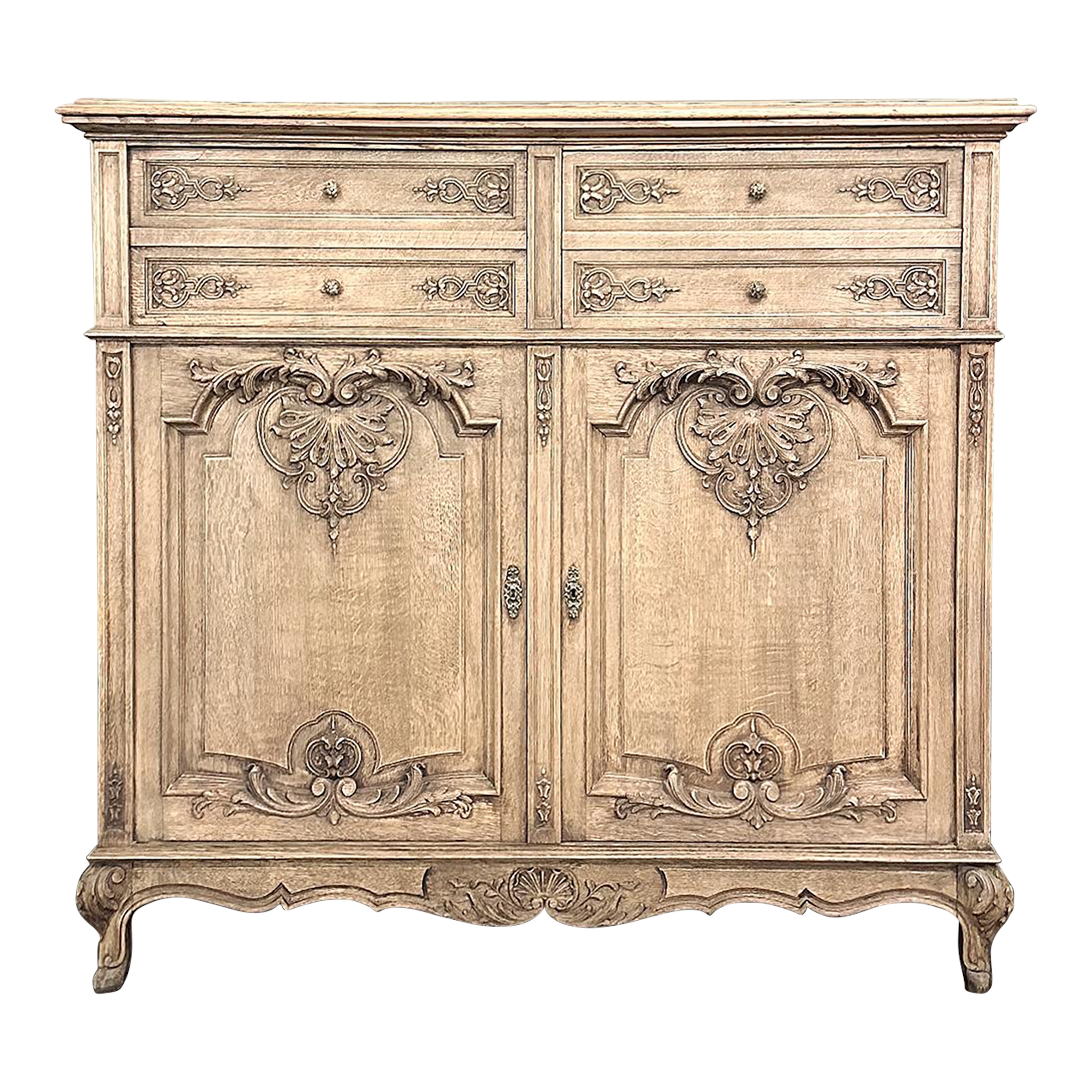 Antique French Louis XIV Buffet ~ Silver Chest ~ Cabinet is a remarkably crafted piece designed to keep dining room appurtenances organized and at the ready! Four faux drawers appear at the top, which are actually two doors that open to the divided compartment, which is also accessible with a trunk-like lid that is the entire top of the piece! The two large lower doors open in the traditional buffet style to allow access to a large storage space on the left, and a stack of interior drawers on the right, perfect for keeping silverware, linens, or other items handy and organized. The entire piece was crafted from solid oak, then adorned with Louis XIV-inspired carved detail including the classic shell, floral and foliate motifs. Scrolled frameworks, apron and legs only add to the elegance. Painstakingly stripped using our proprietary process that retains the patina and sheer natural beauty of the old wood, all performed by our expert in-house staff.