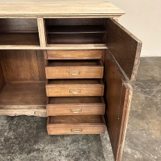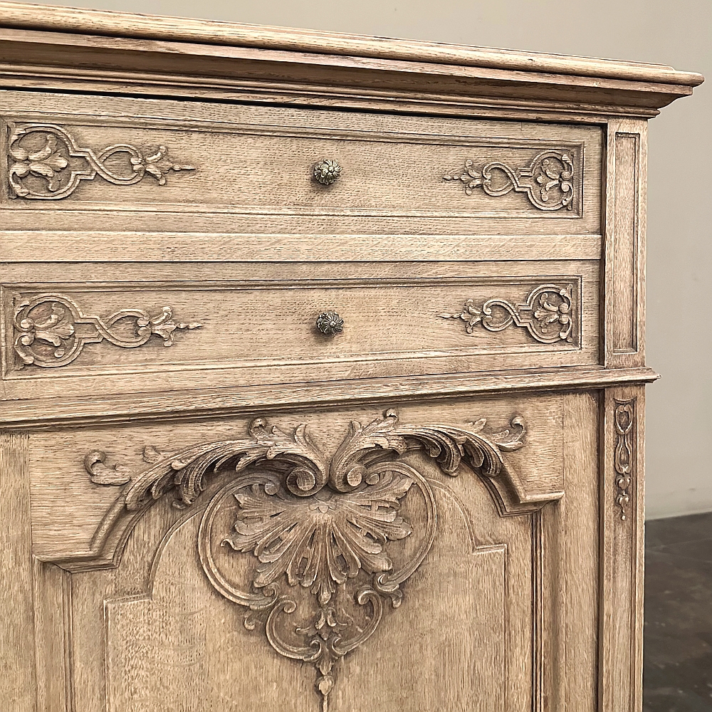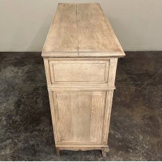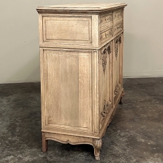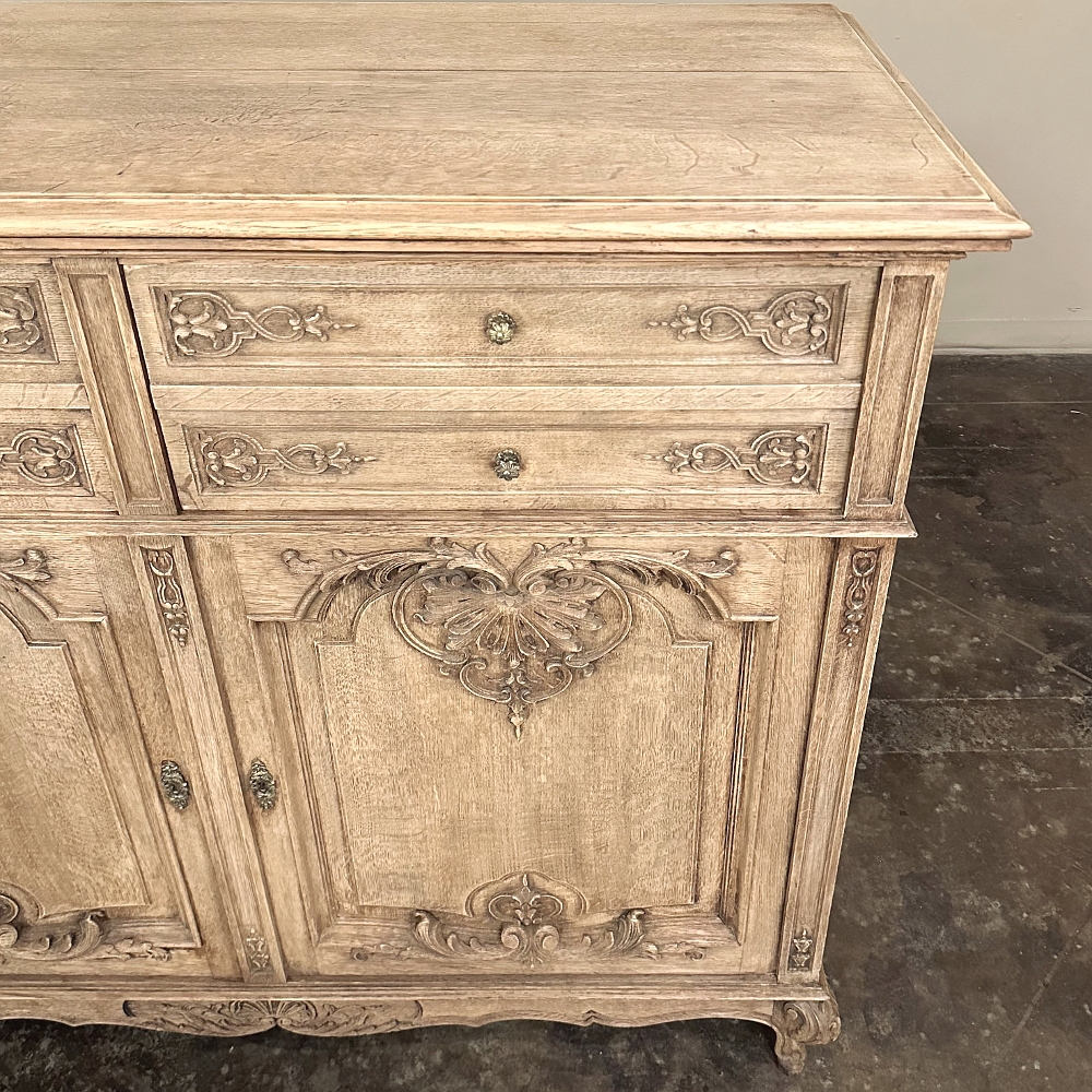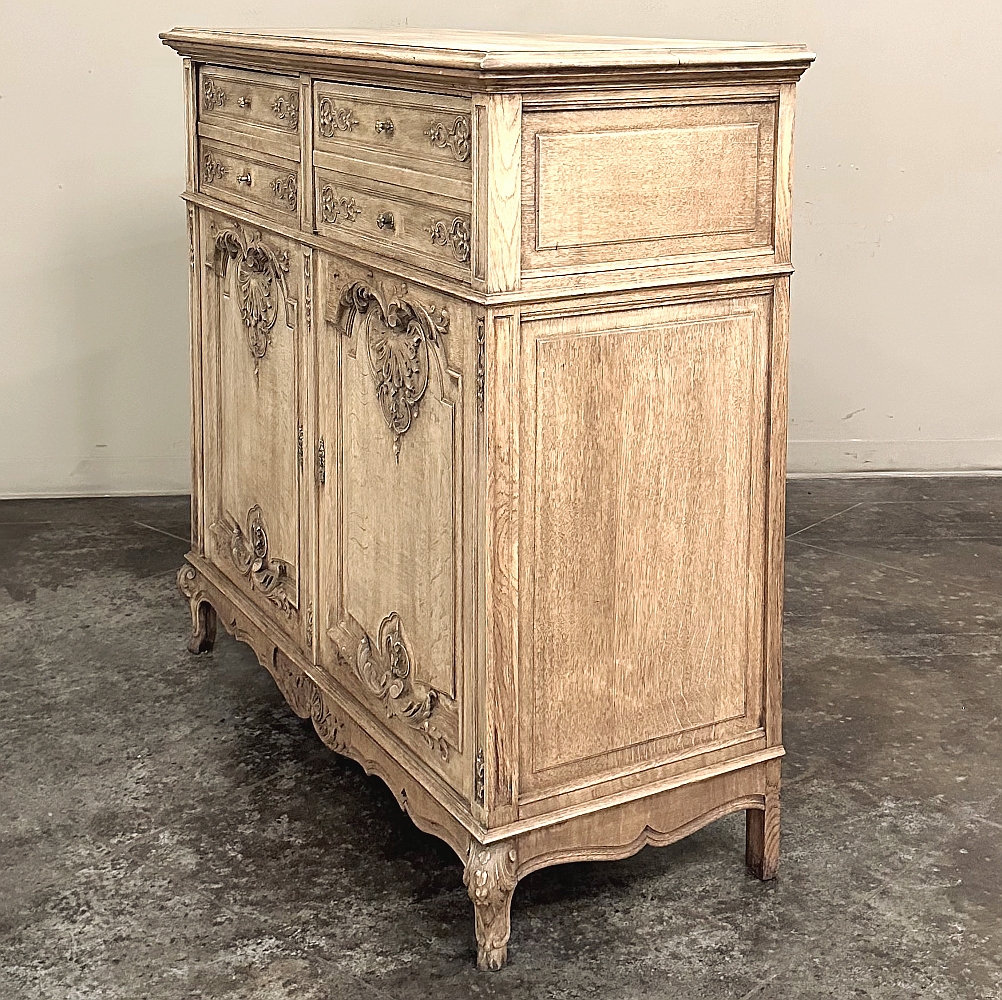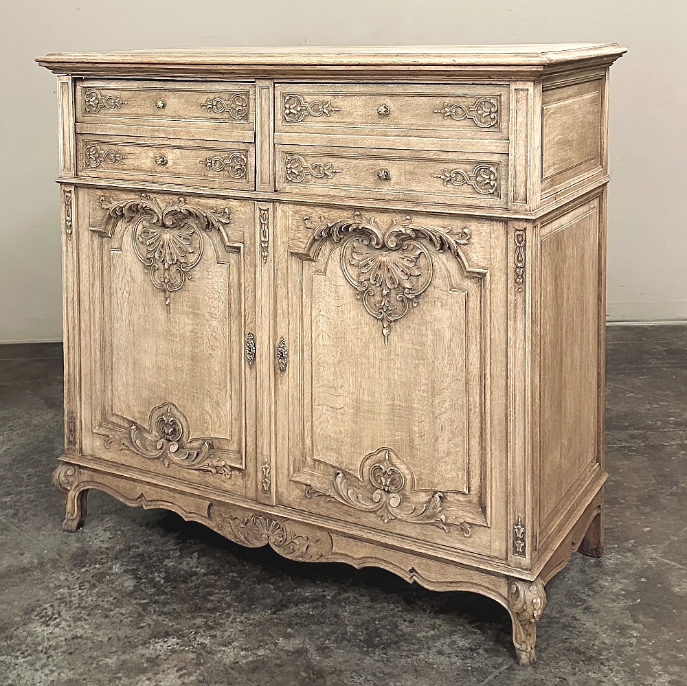 Antique French Louis XIV Buffet ~ Silver Chest ~ Cabinet is a remarkably crafted piece designed to keep dining room appurtenances organized and at the ready! Four faux drawers appear at the top, which are actually two doors that open to the divided compartment, which is also accessible with a trunk-like lid that is the entire top of the piece! The two large lower doors open in the traditional buffet style to allow access to a large storage space on the left, and a stack of interior drawers on the right, perfect for keeping silverware, linens, or other items handy and organized. The entire piece was crafted from solid oak, then adorned with Louis XIV-inspired carved detail including the classic shell, floral and foliate motifs. Scrolled frameworks, apron and legs only add to the elegance. Painstakingly stripped using our proprietary process that retains the patina and sheer natural beauty of the old wood, all performed by our expert in-house staff.