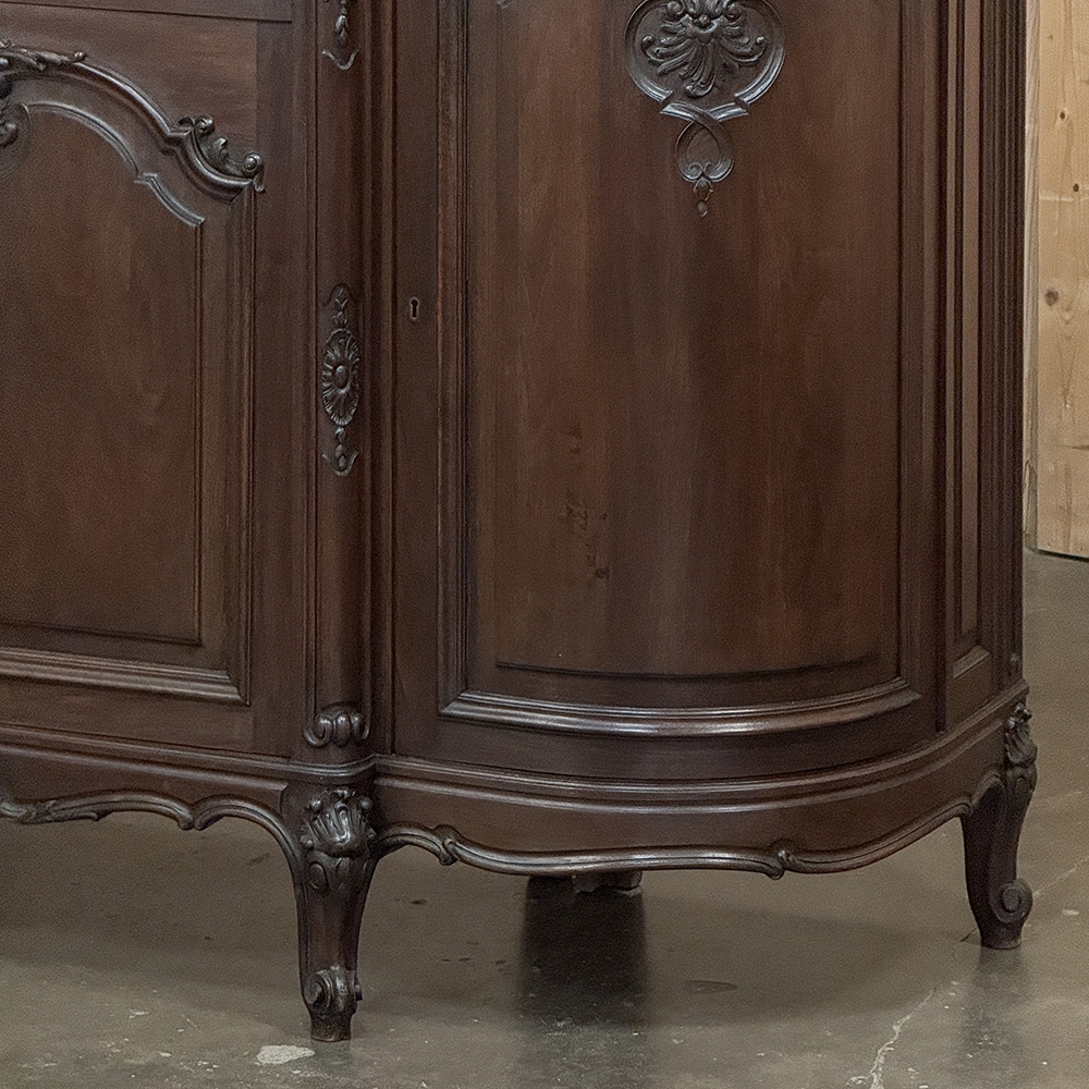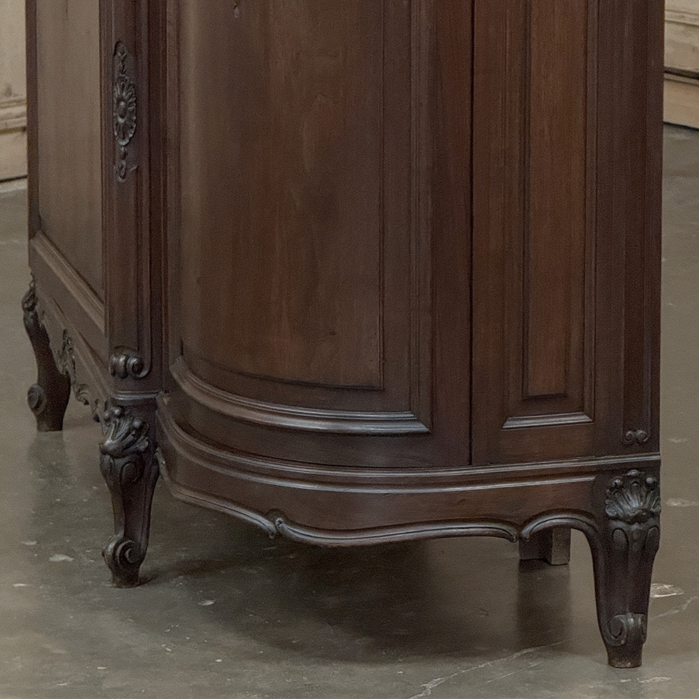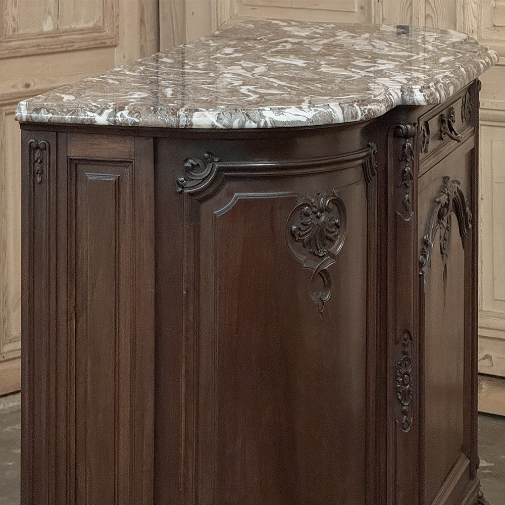 Antique French Louis XIV Marble Top Walnut Buffet with Rounded Sides is the combination of style, elegance and efficiency, crafted by master artisans from sumptuous indigenous French walnut. The design features a subtle step front cabinet front and center, flanked by rounded sides which also open to reveal surprising storage while creating a traffic-friendly form ideal for busy families and passageways. Four elegantly carved and scrolled legs provide support to the subtly scrolled apron. Carved detail of shell and foliates adorns the cabinet doors, with shells on the single drawer at the center as well, centered with a cast brass pull. On top, luxuriously veined marble provides the ultimate carefree and elegant serving and display surface, meticulously contoured and beveled to follow the contours of the casework below.