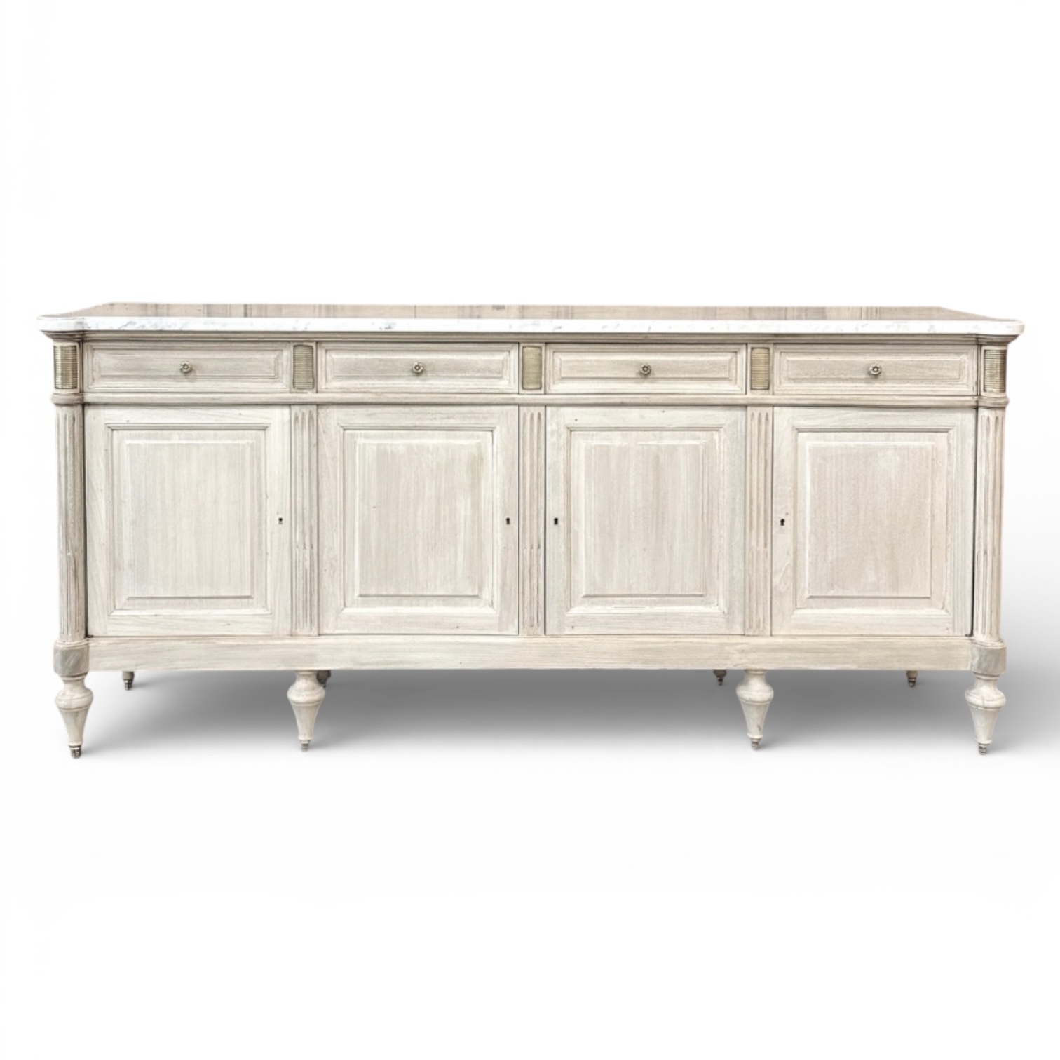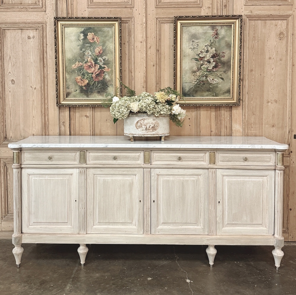 This elegant French buffet is early-century in date yet firmly rooted in Louis XVI neoclassical style, with its crisp symmetry, clean lines, and restrained architectural detailing. Crafted in mahogany and professionally stripped, it showcases a beautiful natural grain with a soft, timeworn patina that feels both sophisticated and inviting. A Carrara marble top adds a classic finishing touch—cool, luminous, and wonderfully practical for everyday use or entertaining. Paneled doors offer generous concealed storage, complemented by a row of shallow drawers above for linens, serving pieces, or essentials. A timeless, well-proportioned statement piece that brings enduring French refinement to a dining room, entry, or long wall in a living space.