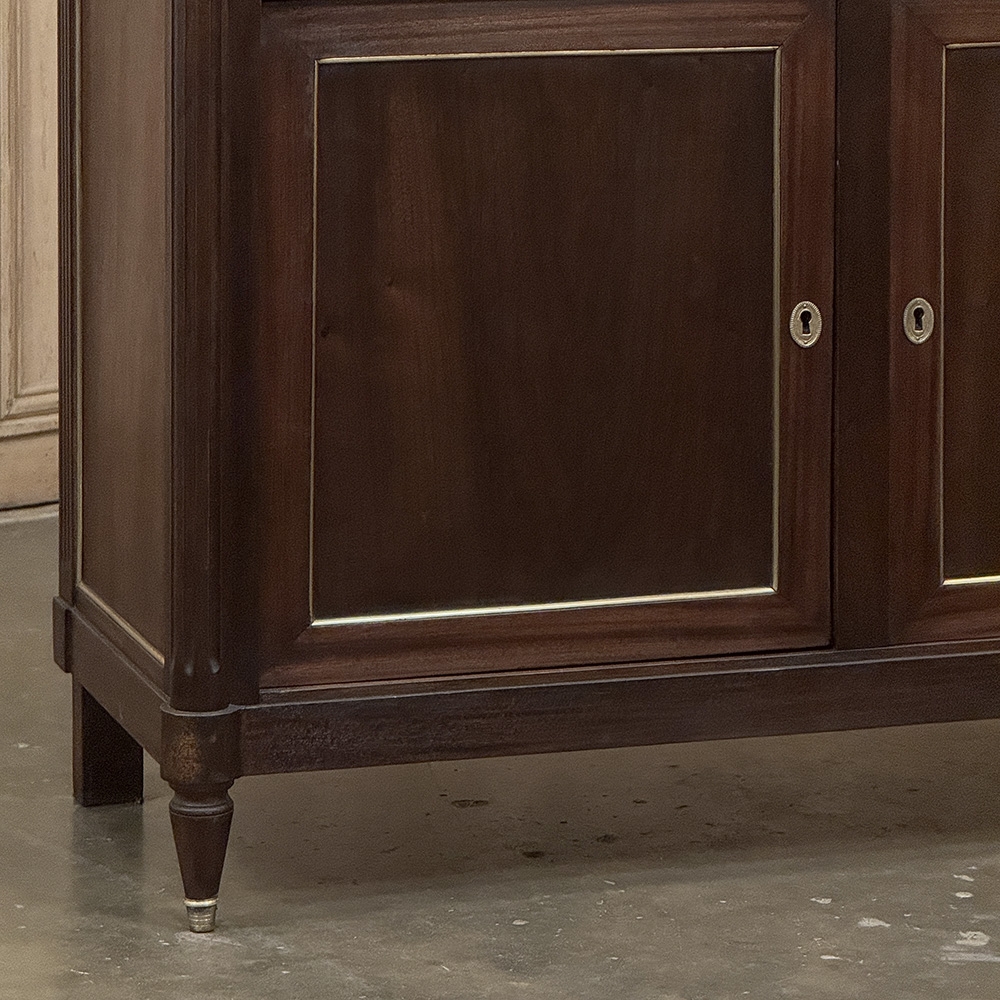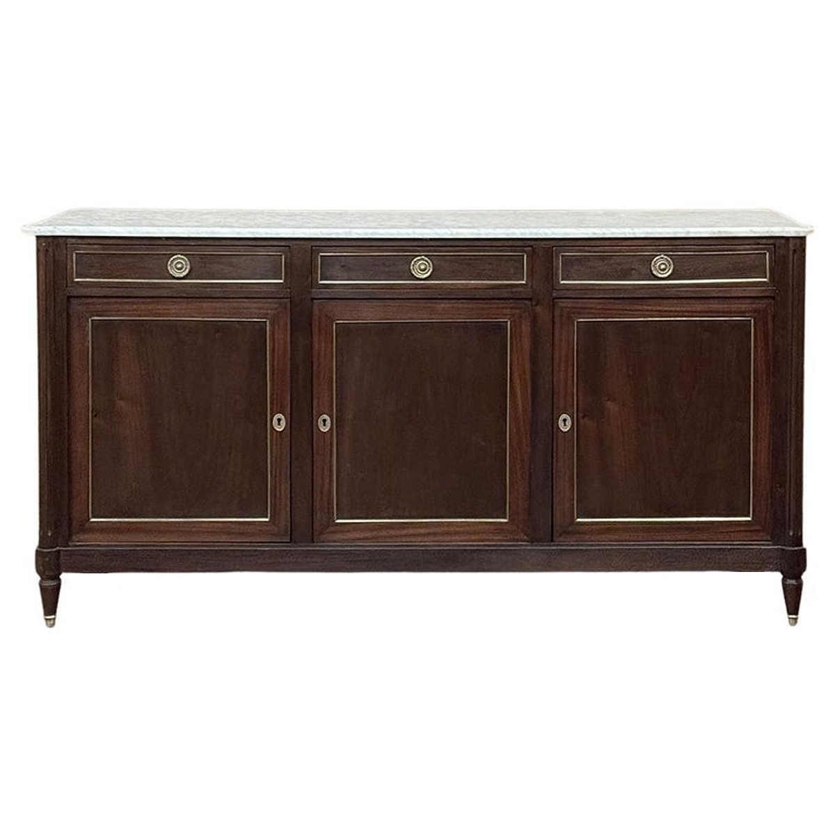 Antique French Louis XVI Mahogany Buffet ~ Credenza with Carrara Marble will make a handsome addition to any room! The tailored, rectilinear architecture has its roots in the glory days of ancient Greece & Rome, with subtle touches that exude a French flair. Brass molding trim outlines the drawers and cabinet doors and side panels, with the drawers further accented with cast brass ring pulls with brass guards and elegant cast brass key guards. The front corners protrude out slightly forming fluted columns which draw the eye down to the tapered legs tipped with brass feet. The luxurious Carrara marble top features a cove bevel and follows the contours of the corner posts below. Doors open wide for voluminous storage.