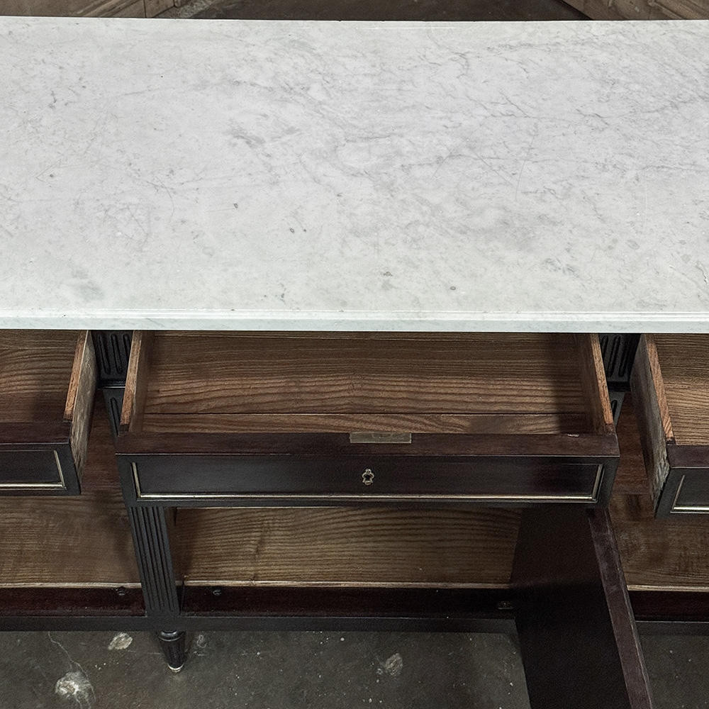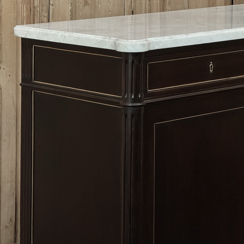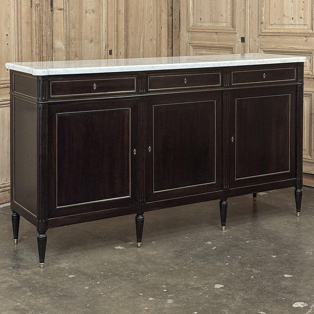 Antique French Louis XVI Mahogany Buffet with Carrara Marble will make a handsome addition to any room! The tailored, rectilinear architecture has its roots in the glory days of ancient Greece & Rome, with subtle touches that exude a French flair. Brass molding trim outlines the drawers and cabinet doors, further accented with ring pulls with brass guards and lively cast brass key guards. Fluted pilasters appear between the drawers and cabinet doors. The front corners protrude out slightly forming fluted columns which draw the eye down to the tapered & fluted legs tipped with brass feet. The luxurious Carrara marble top features a cove bevel and follows the contours of the corner posts below and contrasts beautifully with the dark mahogany below. Doors open wide for access to capacious storage.