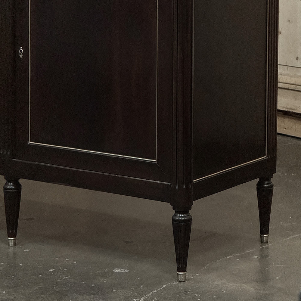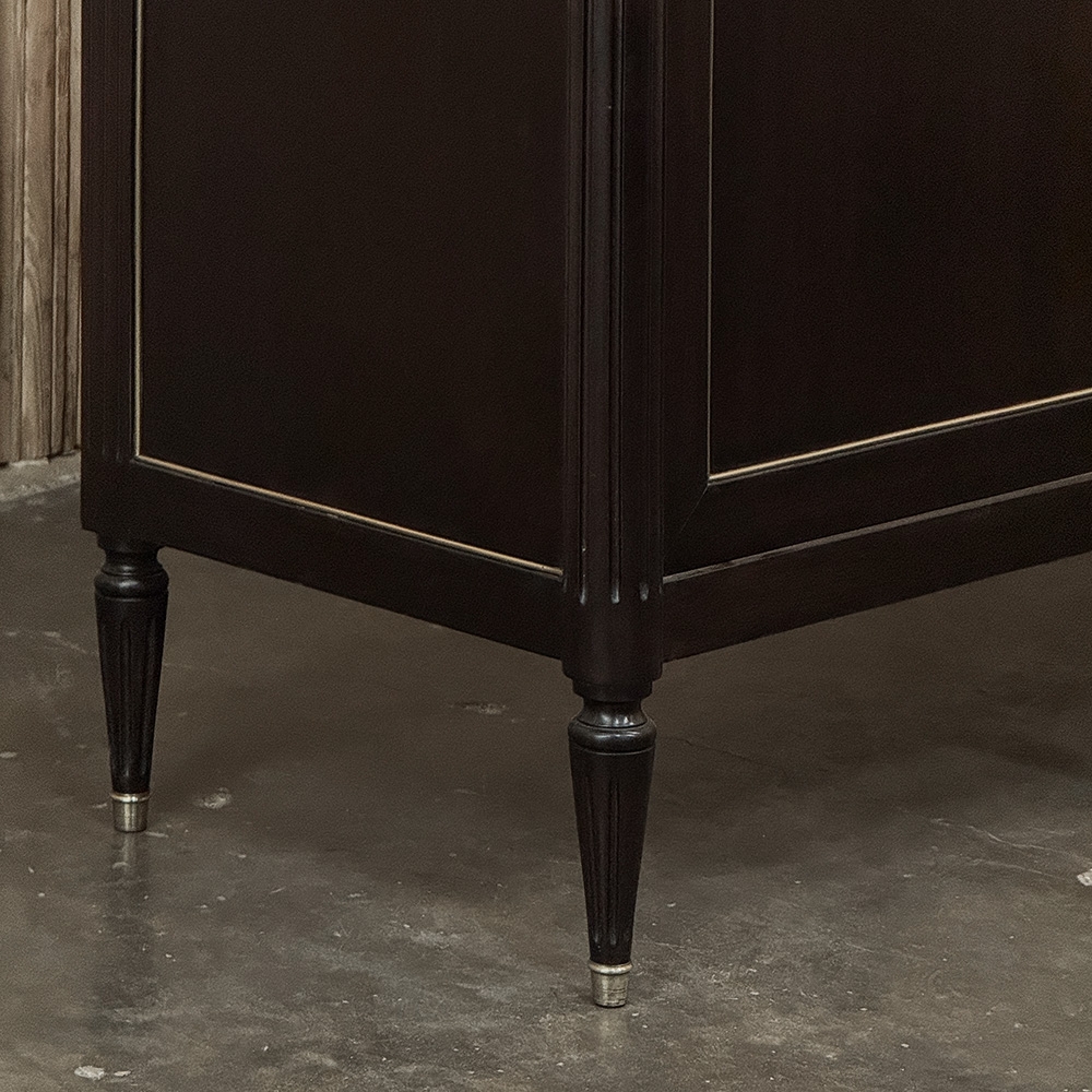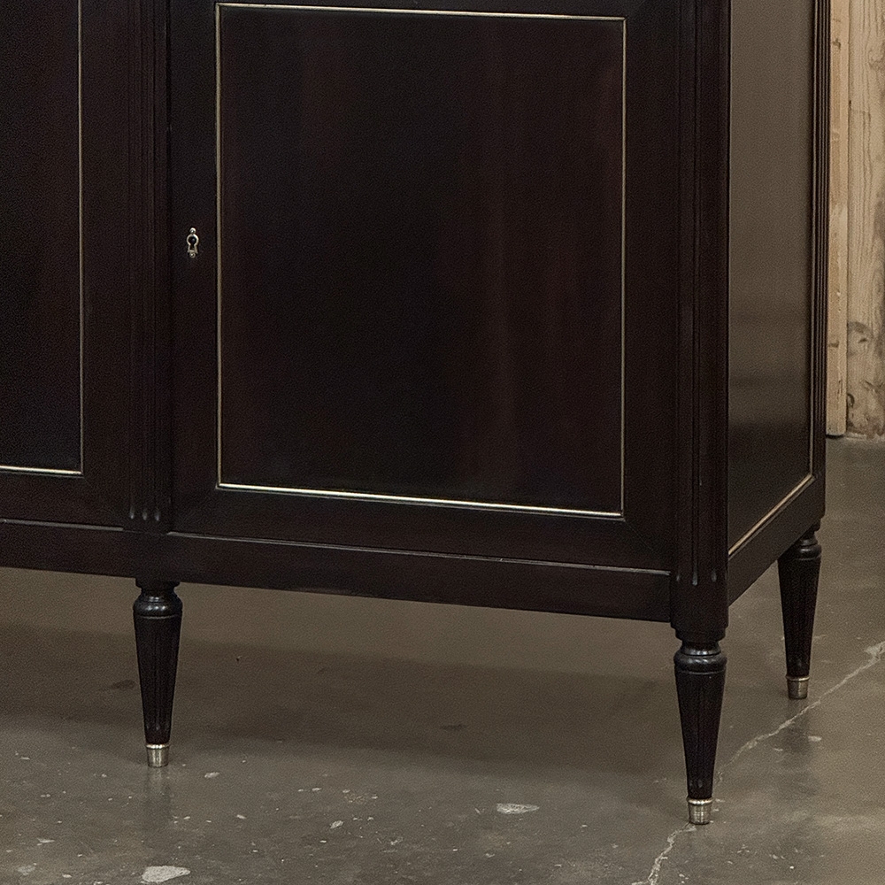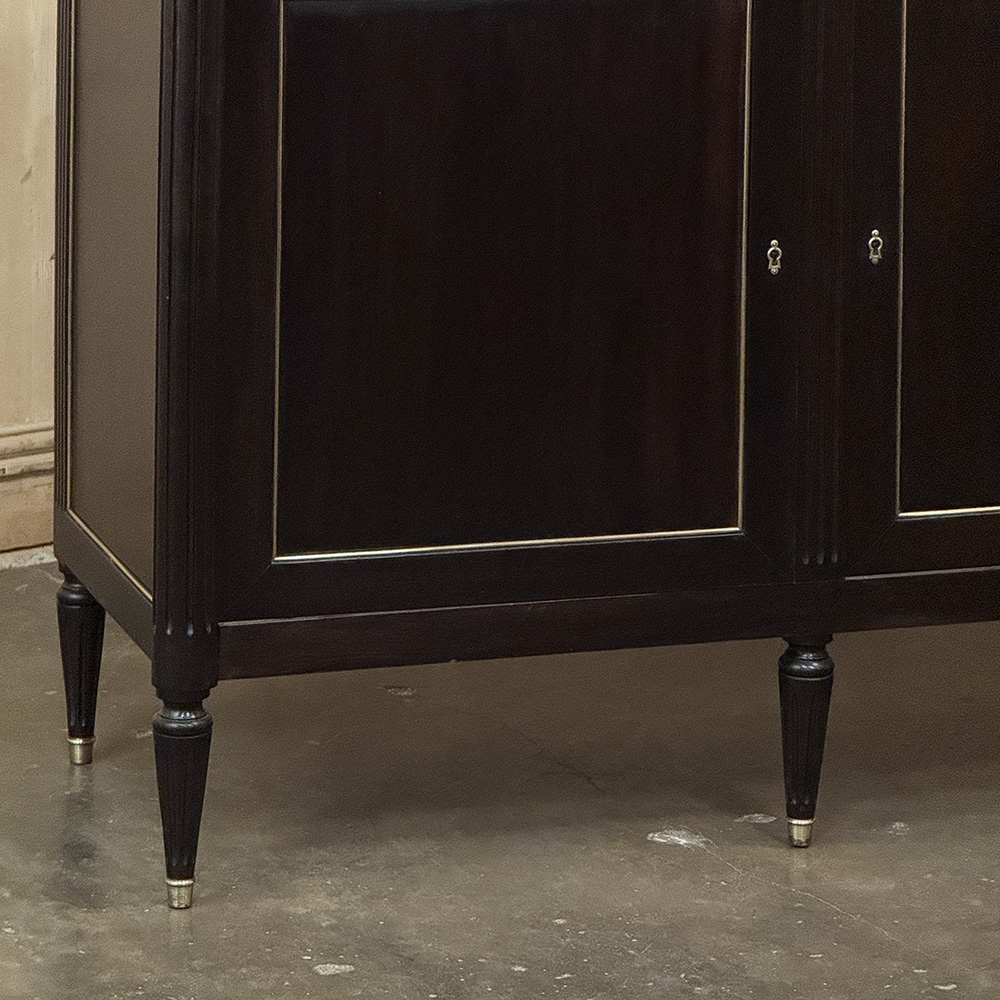 Antique French Louis XVI Mahogany Buffet with Carrara Marble will make a handsome addition to any room! The tailored, rectilinear architecture has its roots in the glory days of ancient Greece & Rome, with subtle touches that exude a French flair. Brass molding trim outlines the drawers and cabinet doors, further accented with ring pulls with brass guards and lively cast brass key guards. Fluted pilasters appear between the drawers and cabinet doors. The front corners protrude out slightly forming fluted columns which draw the eye down to the tapered & fluted legs tipped with brass feet. The luxurious Carrara marble top features a cove bevel and follows the contours of the corner posts below and contrasts beautifully with the dark mahogany below. Doors open wide for access to capacious storage.