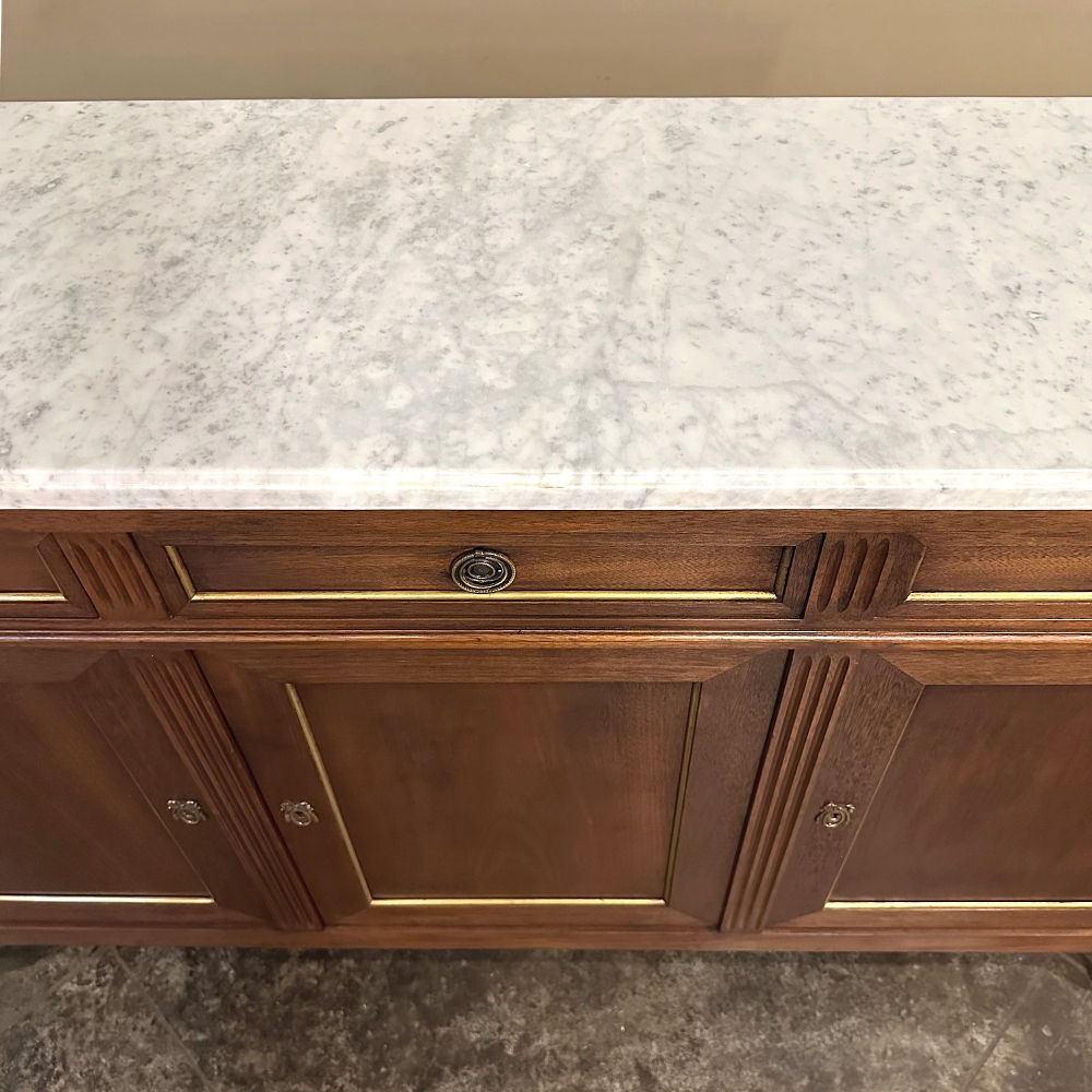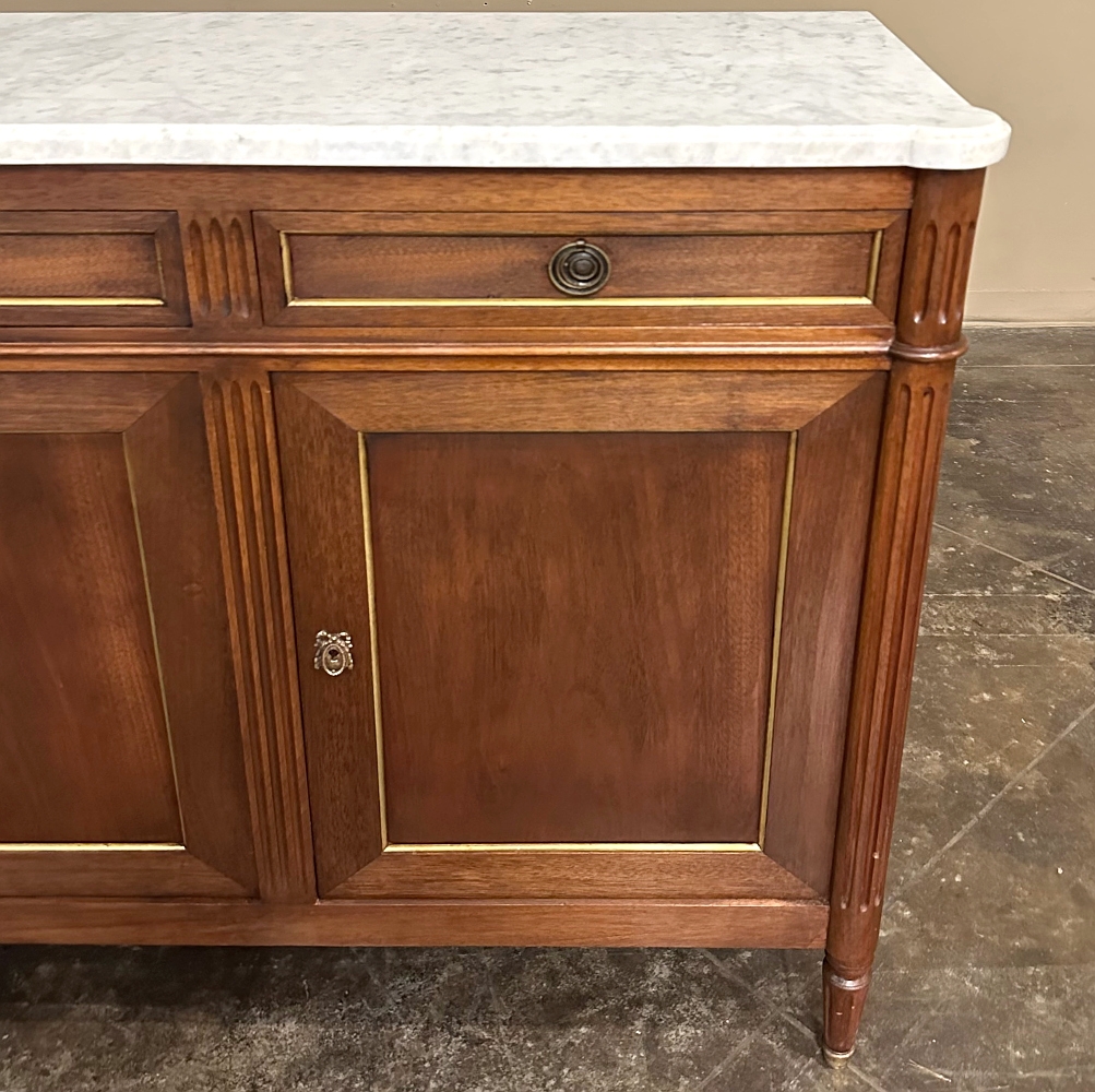 Antique French Louis XVI Mahogany Buffet with Carrara Marble represents the epitome of understated elegance. Hand-crafted from exotic imported mahogany, it features a tailored design that works with a wide variety of decors and interior designs. Three drawers and three cabinets are all trimmed in brass molding and fitted with brass ring pulls or key guards, matching the brass leg tips perfectly. Even the side panels are trimmed in brass, providing visual appeal from any angle. Doors open wide to reveal cavernous storage for such a relatively shallow piece, and the luxurious marble top makes for a great display and serving surface. Ideal for mounting a big flat panel TV, as well!
