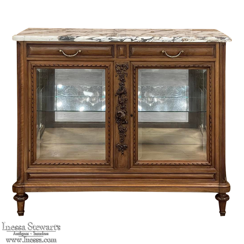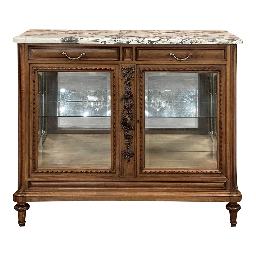 Antique French Louis XVI Maple Marquetry Marble Top Display Buffet is yet another unusual find. Crafted from finely figured maple with "curly" grain effects, it was designed to provide a carefree serving surface, storage for cutlery and flatware, and display your finest keepsakes in two tiers below! The luxuriously veined marble top with beveled edge is a splendid neutral color combination that works with a wide palette. The sides are of a tailored design, with spiral ribbon trim outlining the original beveled glass to make a visual statement from side angles as well as let more light in. The drawer tier just under the marble continues the tailored design effect, with finely framed drawer fronts accented with cast brass bale pulls. Rounded, fluted corners frame the doors below which duplicate the look of the sides with spiral ribbon trim and beveled glass, and with the interior glass shelf, combine to allow enough ambient light into the interior to make electric lighting unnecessary. The center stile between the doors has been lavished with a sculptural study of intertwined rings, musical instruments, flowers and foliage all bound by flowing ribbon executed in astounding full relief. The base and legs below return back to the tailored effect to complete the truly unique design.