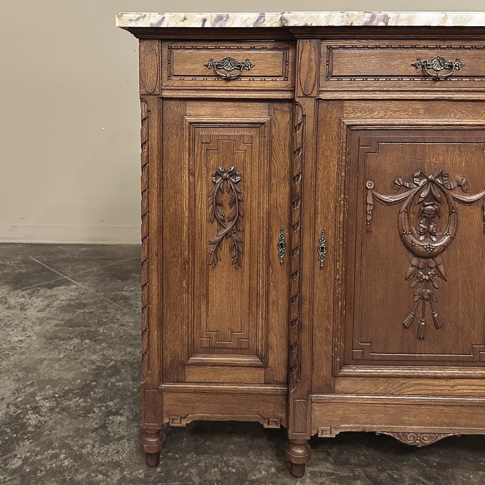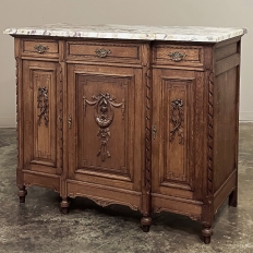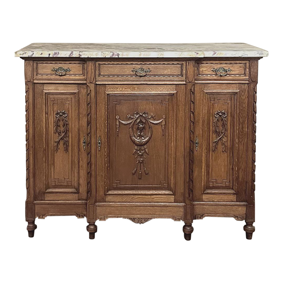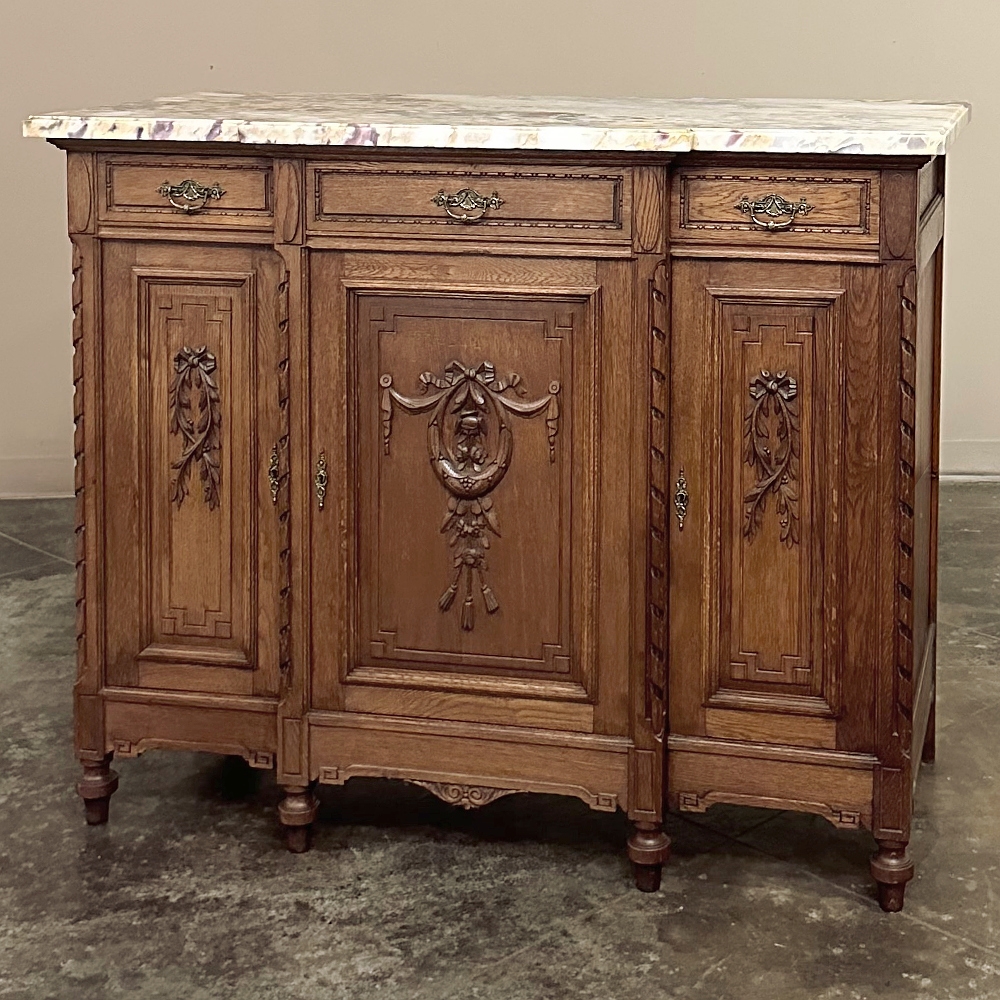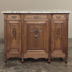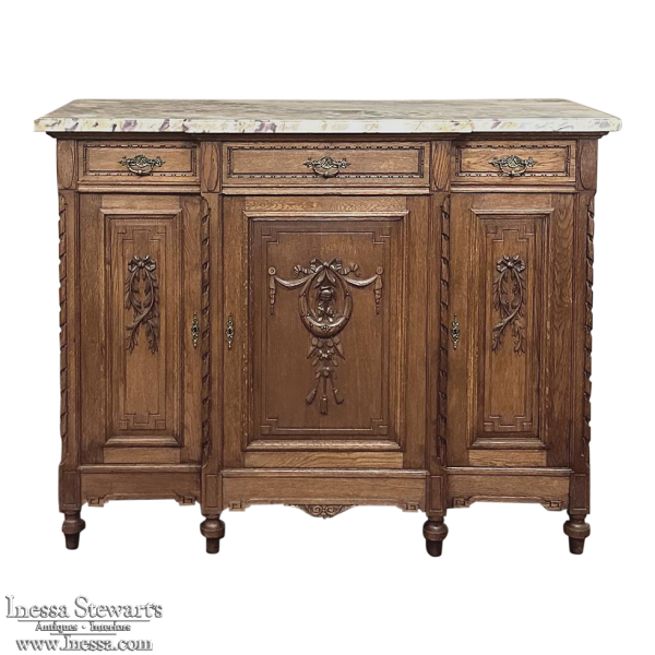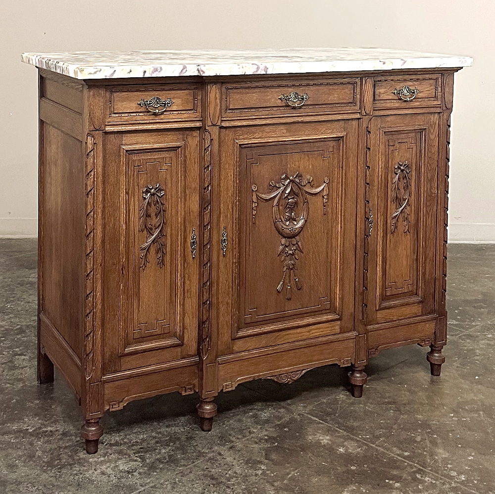 Antique French Louis XVI Marble Top Buffet is a timeless rendition of the classical style that dates back to ancient Greece and Rome! King Louis XVI was fond of the neoclassical look and it became exponentially more pervasive during his reign. This example features a three door design, although it's barely 4 feet wide, making it ideal for cozy niches or special places in a room. This will really come in handy if you need a pair of such pieces, which is available at the time of this writing, of course if you act fast! Starting with the exquisitely veined marble top which is subtly contoured to follow the nuanced step front center cabinet door, fine molding transitions the marble to the top of the casework where one finds three convenient and surprisingly spacious drawers, all framed in fine molding and fitted with cast brass bale pulls with finely designed guards. The two lower outermost cabinets under the drawers feature more molding detail framing the carved intertwined laurel swags tied with ribbon. The side doors provide a framework for the center door which is lavished with a laurel wreath with drapery swags, ribbon, a d floral spray with tassels, all in fine relief. A classically styled apron with turned legs provides support.