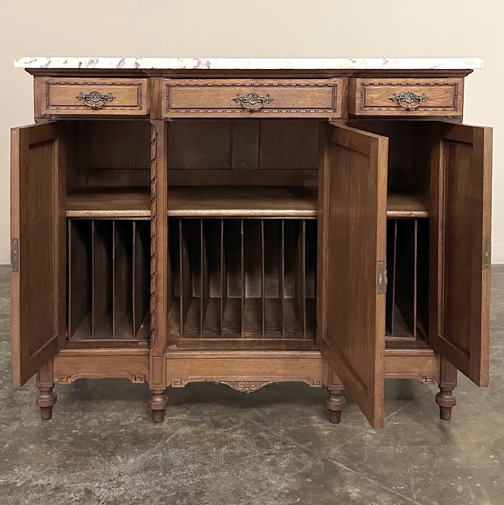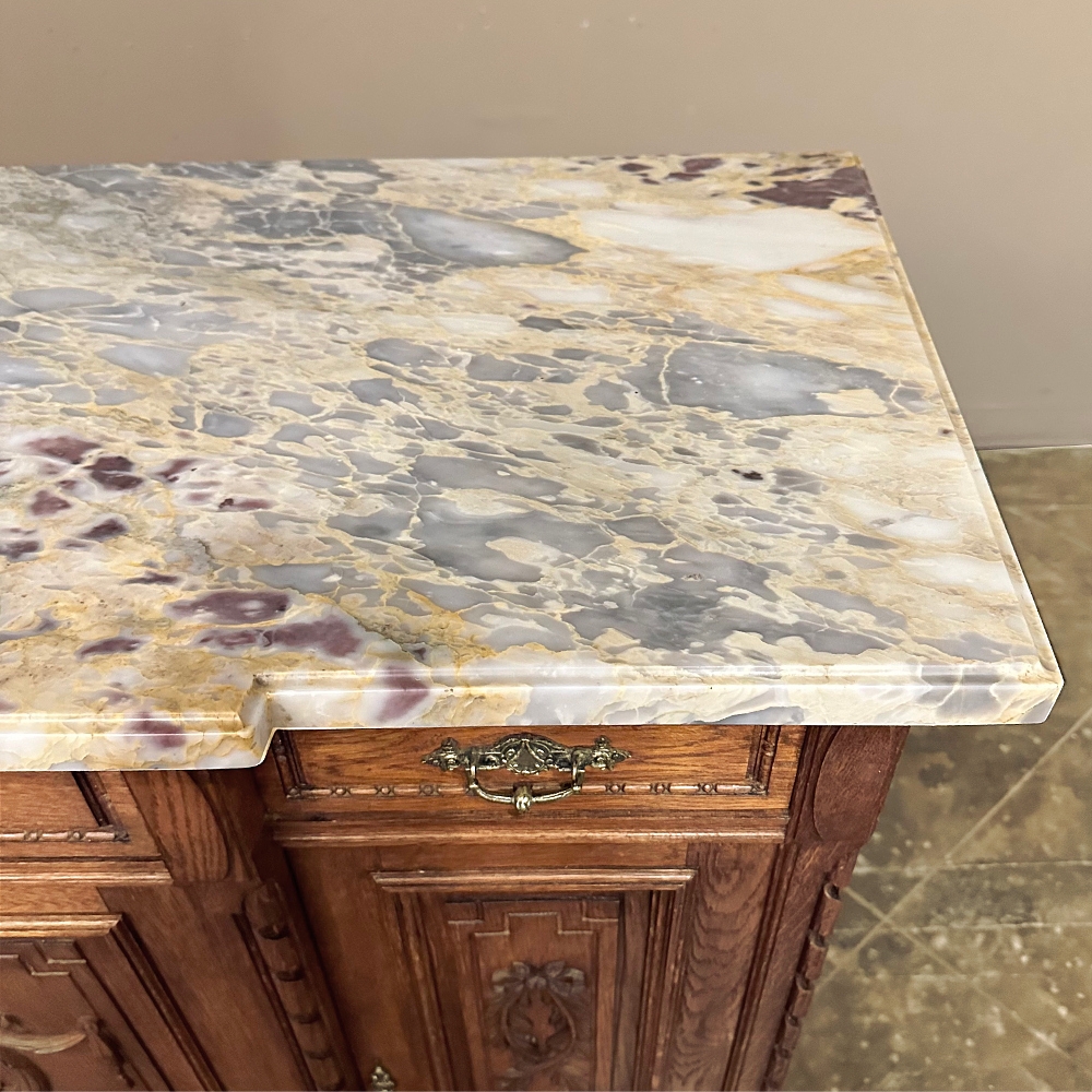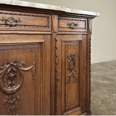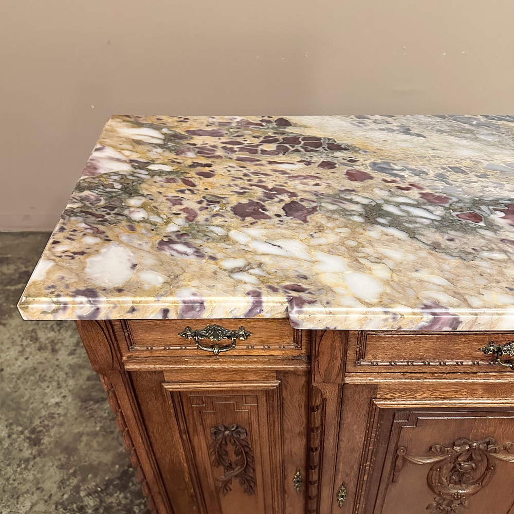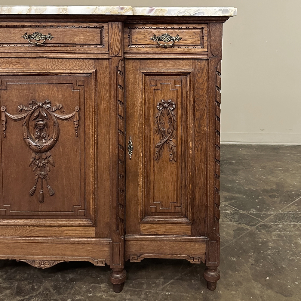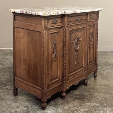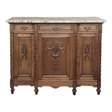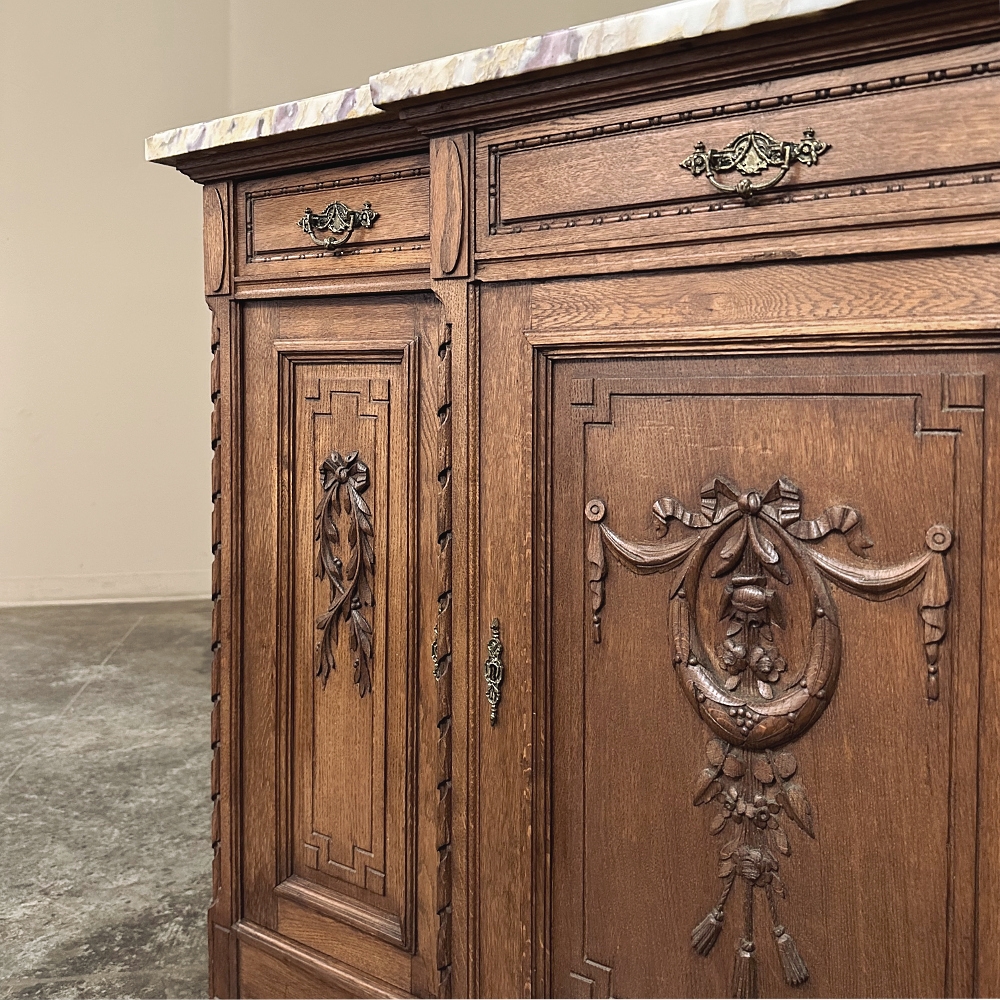 Antique French Louis XVI Marble Top Buffet is a timeless rendition of the classical style that dates back to ancient Greece and Rome! King Louis XVI was fond of the neoclassical look and it became exponentially more pervasive during his reign. This example features a three door design, although it's barely 4 feet wide, making it ideal for cozy niches or special places in a room. This will really come in handy if you need a pair of such pieces, which is available at the time of this writing, of course if you act fast! Starting with the exquisitely veined marble top which is subtly contoured to follow the nuanced step front center cabinet door, fine molding transitions the marble to the top of the casework where one finds three convenient and surprisingly spacious drawers, all framed in fine molding and fitted with cast brass bale pulls with finely designed guards. The two lower outermost cabinets under the drawers feature more molding detail framing the carved intertwined laurel swags tied with ribbon. The side doors provide a framework for the center door which is lavished with a laurel wreath with drapery swags, ribbon, a d floral spray with tassels, all in fine relief. A classically styled apron with turned legs provides support.