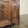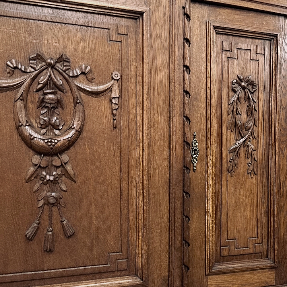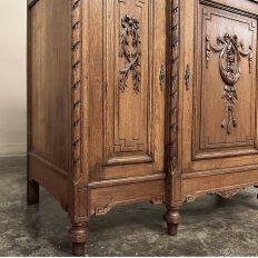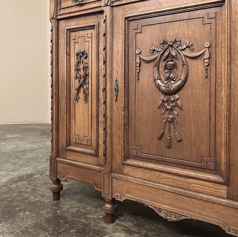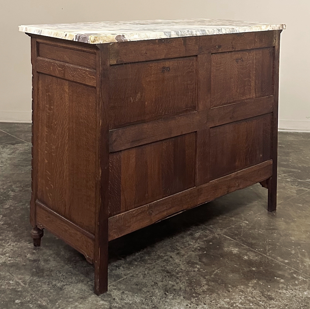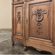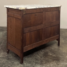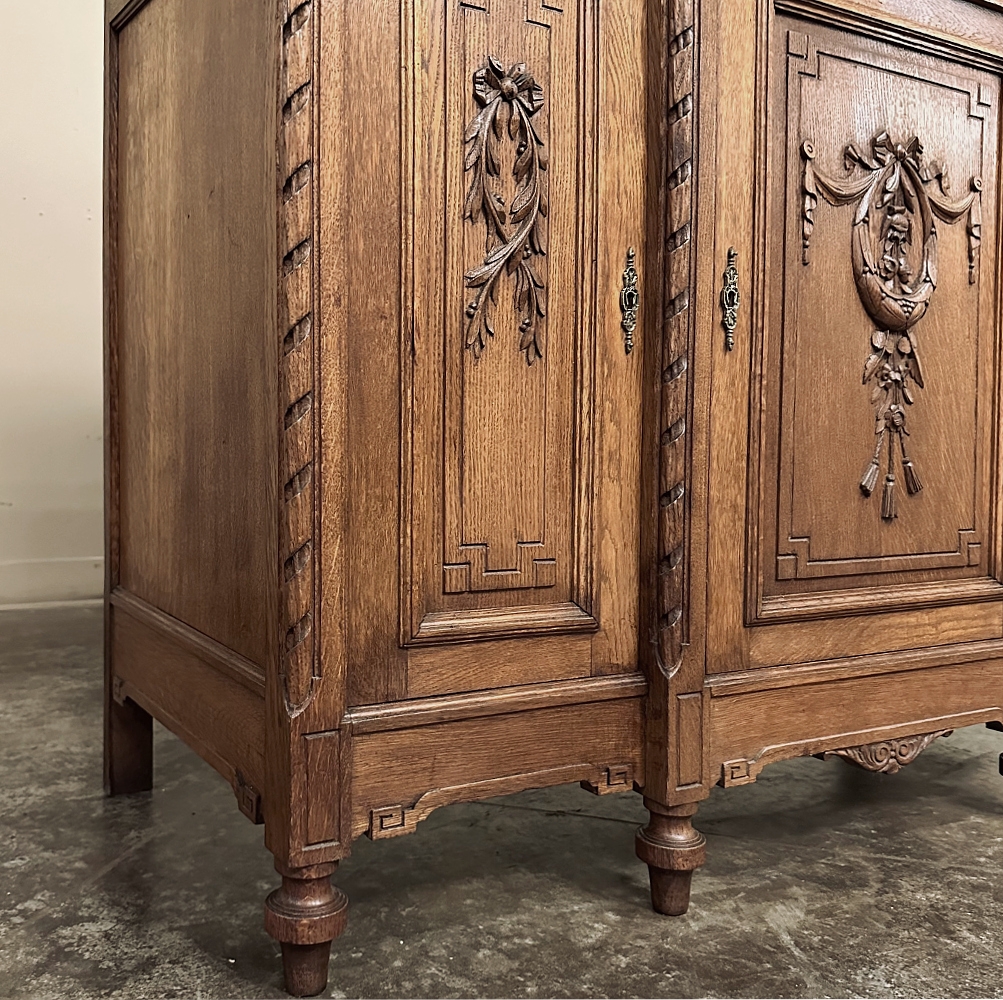 Antique French Louis XVI Marble Top Buffet is a timeless rendition of the classical style that dates back to ancient Greece and Rome! King Louis XVI was fond of the neoclassical look and it became exponentially more pervasive during his reign. This example features a three door design, although it's barely 4 feet wide, making it ideal for cozy niches or special places in a room. This will really come in handy if you need a pair of such pieces, which is available at the time of this writing, of course if you act fast! Starting with the exquisitely veined marble top which is subtly contoured to follow the nuanced step front center cabinet door, fine molding transitions the marble to the top of the casework where one finds three convenient and surprisingly spacious drawers, all framed in fine molding and fitted with cast brass bale pulls with finely designed guards. The two lower outermost cabinets under the drawers feature more molding detail framing the carved intertwined laurel swags tied with ribbon. The side doors provide a framework for the center door which is lavished with a laurel wreath with drapery swags, ribbon, a d floral spray with tassels, all in fine relief. A classically styled apron with turned legs provides support.