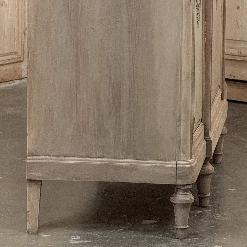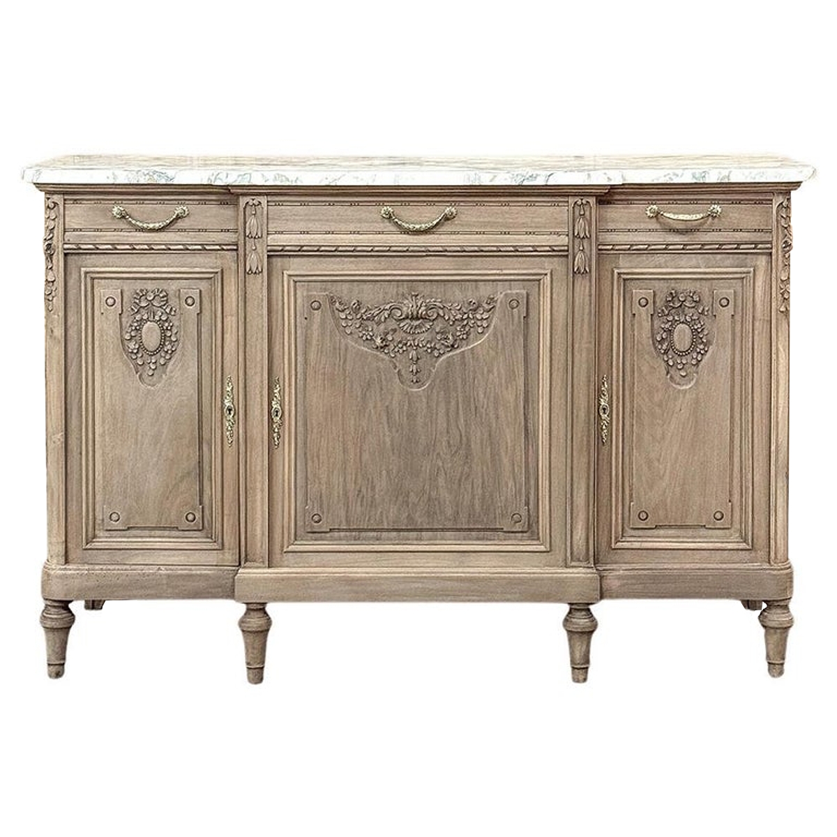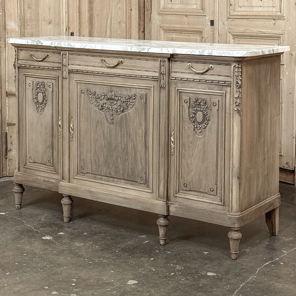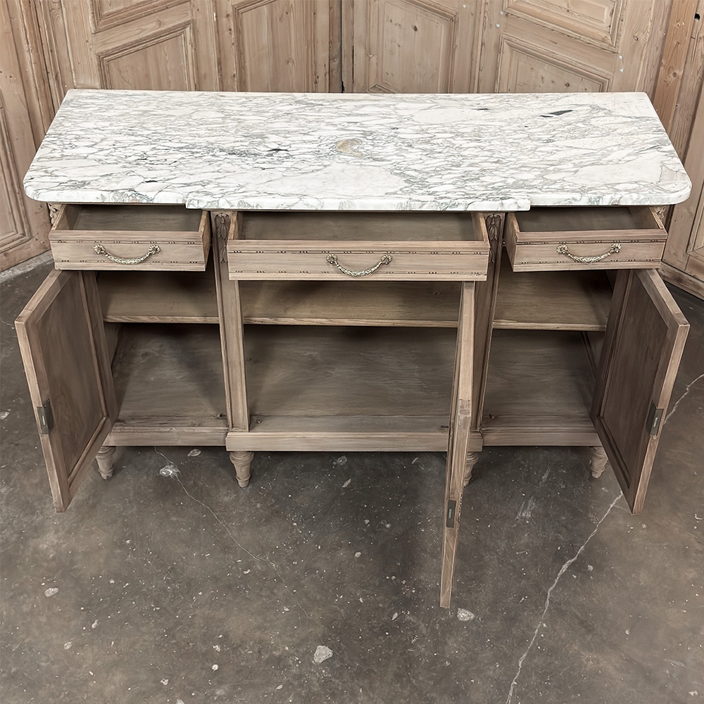 Antique French Louis XVI Marble Top Buffet in Stripped Walnut is a splendid combination of timeless elegance and casual flair! Hand-crafted from sumptuous walnut, the amazing grain of the wood has been realized by our proprietary in-house stripping process creating a light and airy visual effect. Adding to that, the top consists of luxuriously veined white marble which features a cove bevel and follows the contours of the step-front design of the casework below. Three drawers and three cabinets open to reveal capacious storage, with a carved spiral ribbon trim separating the tiers. More carving appears on the shoulders of the rounded corner posts and atop each of the doors in fine relief depicting florals and foliates. Tapered legs provide support, while cast brass bale pulls and key guards complete the look.