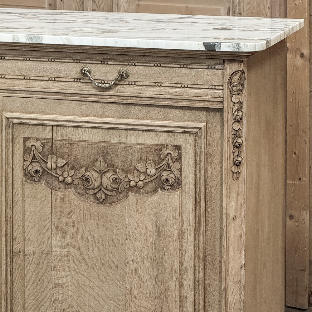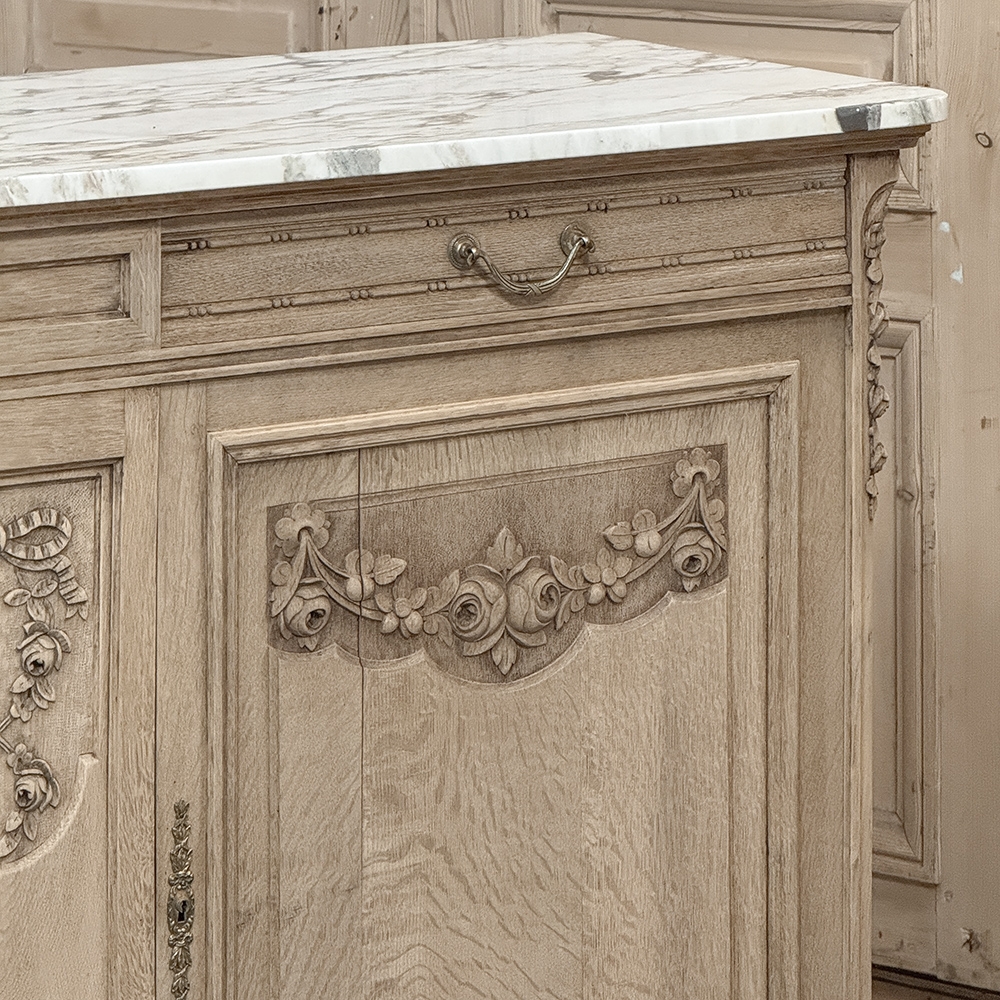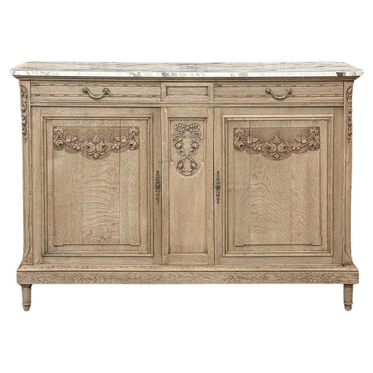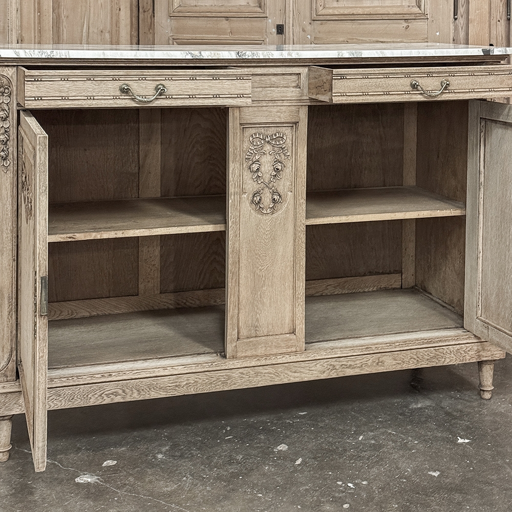 Antique French Louis XVI Stripped Marble Top Buffet adds a casual elegance to the room, with architecture and embellishment inspired by the ancient Greek & Roman civilizations popularized by Louis XVI. Densely grained old-growth oak has been stripped to reveal the patina and character of the wood lending a casual visual effect. Carved floral and foliate designs grace the facade, with tailored molding, tapered legs and brass pulls and key guards to add visual interest. Doors and drawers open to reveal capacious storage for a piece only five feet wide, and the top consists of luxuriously veined marble for carefree entertaining and daily use. Painstakingly stripped using our proprietary process that retains the patina and sheer natural beauty of the old wood, all performed by our expert in-house staff.