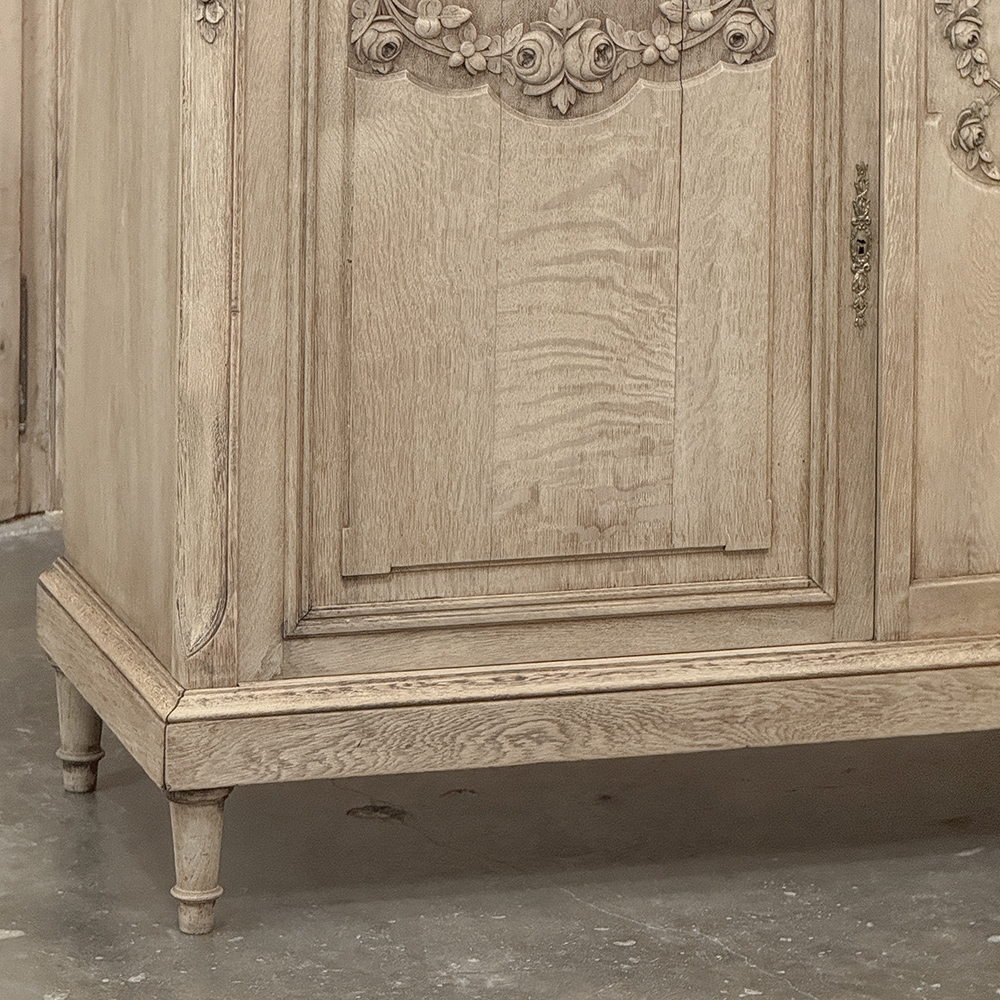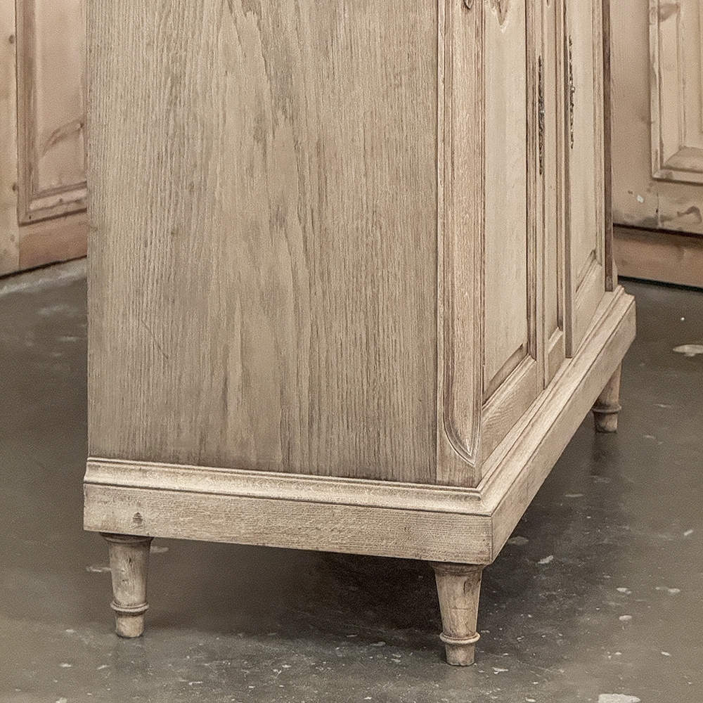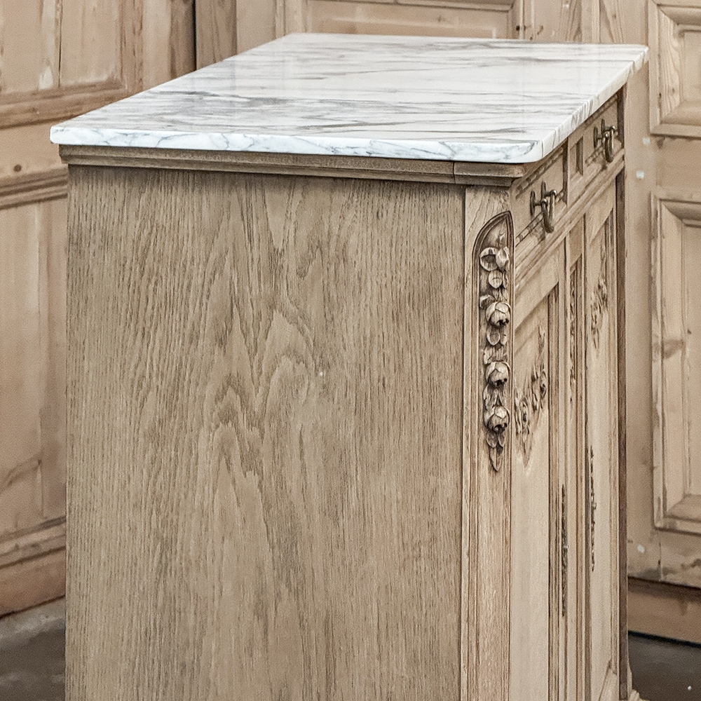 Antique French Louis XVI Stripped Marble Top Buffet adds a casual elegance to the room, with architecture and embellishment inspired by the ancient Greek & Roman civilizations popularized by Louis XVI. Densely grained old-growth oak has been stripped to reveal the patina and character of the wood lending a casual visual effect. Carved floral and foliate designs grace the facade, with tailored molding, tapered legs and brass pulls and key guards to add visual interest. Doors and drawers open to reveal capacious storage for a piece only five feet wide, and the top consists of luxuriously veined marble for carefree entertaining and daily use. Painstakingly stripped using our proprietary process that retains the patina and sheer natural beauty of the old wood, all performed by our expert in-house staff.