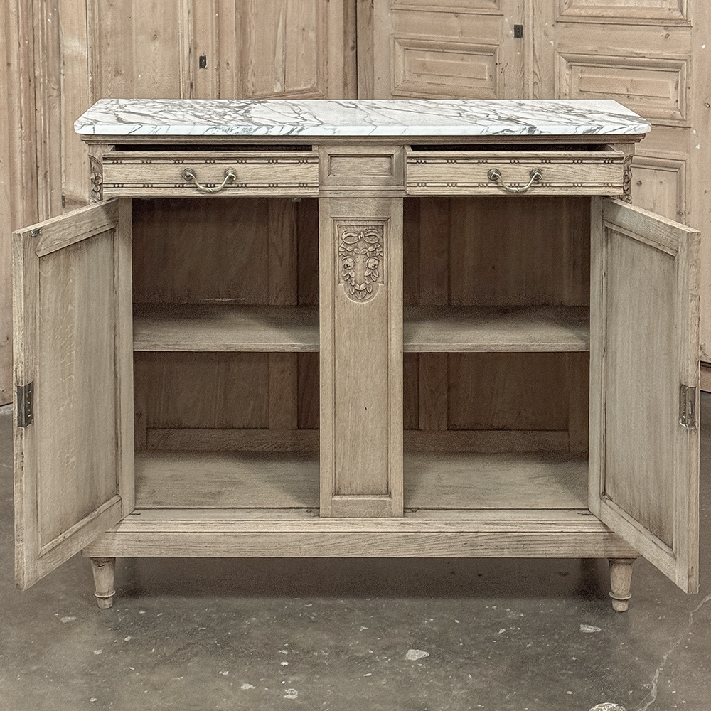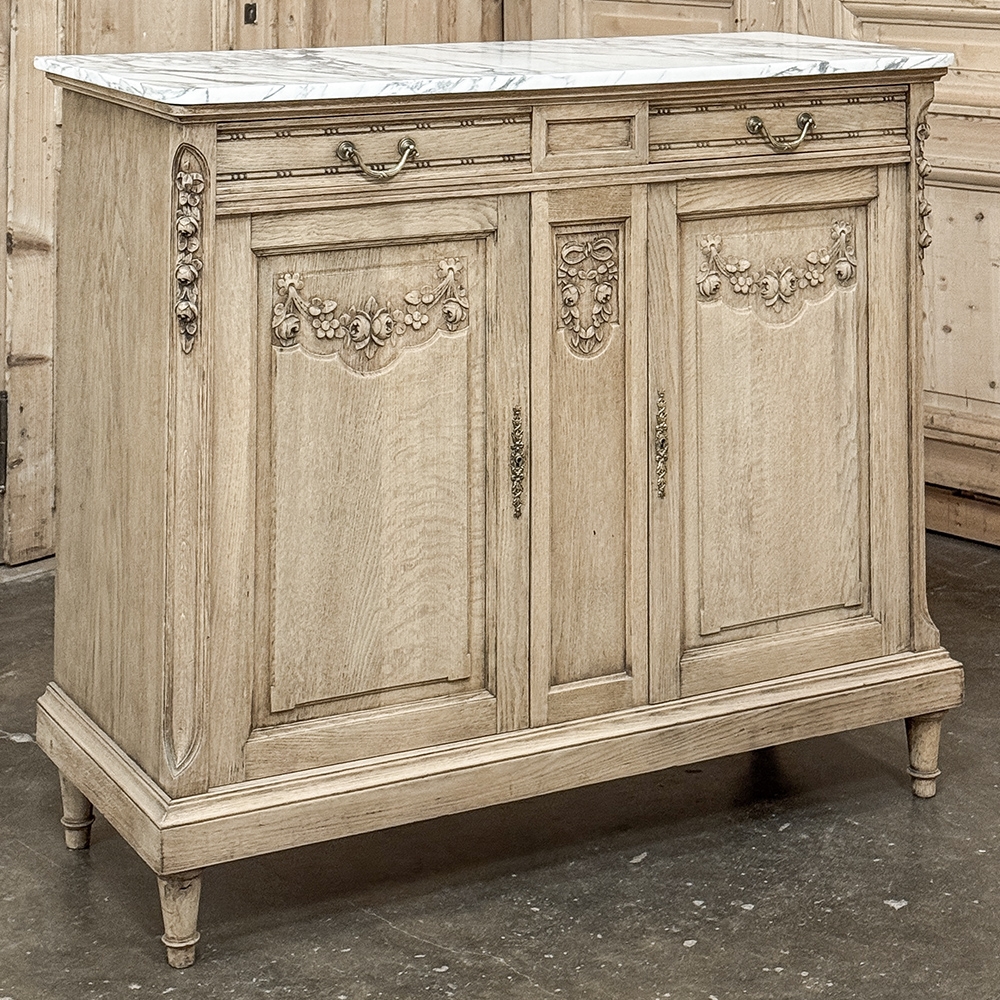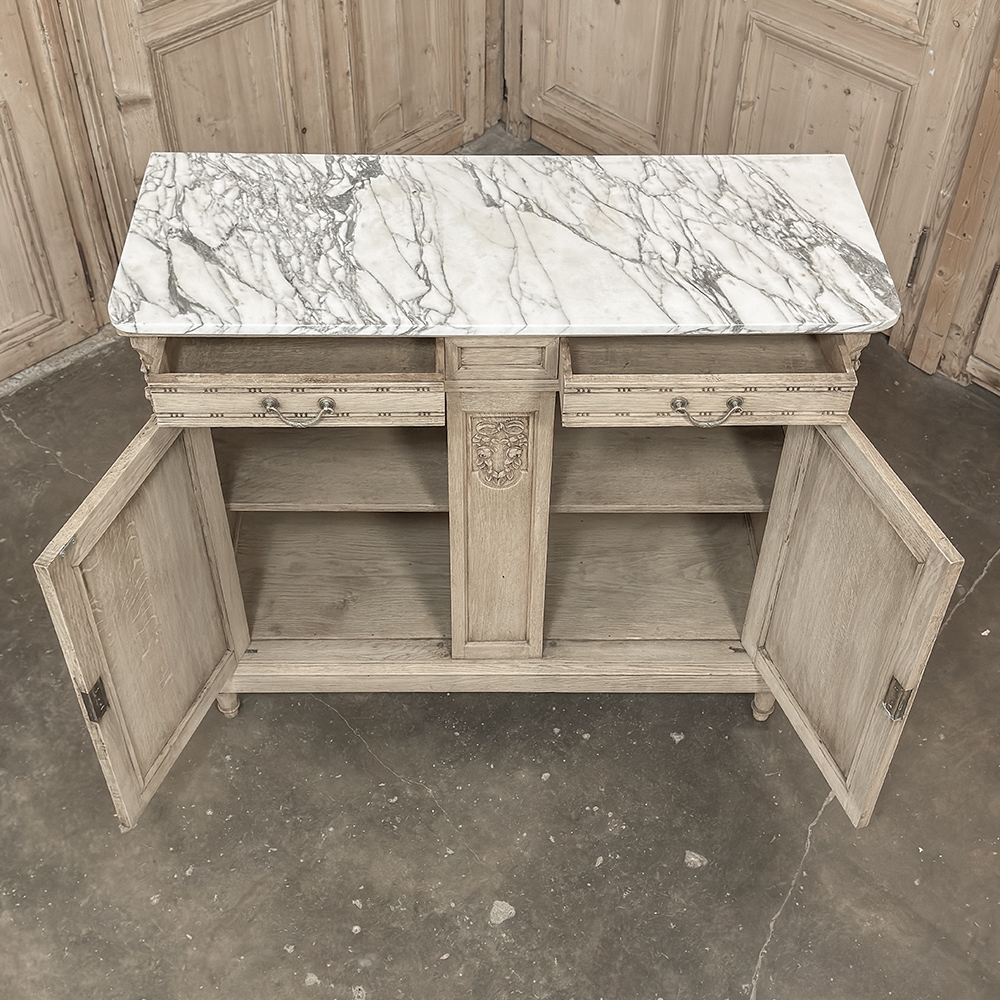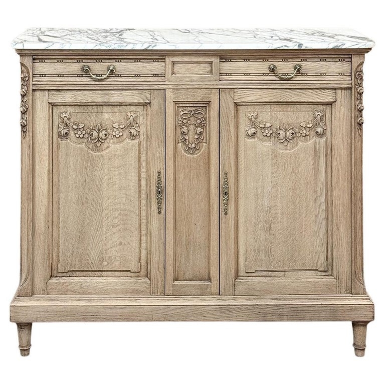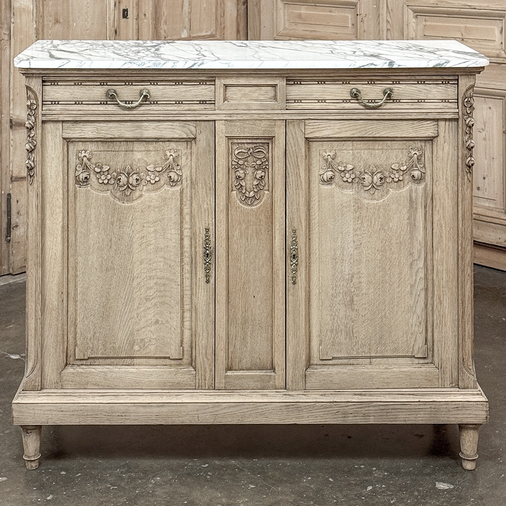 Antique French Louis XVI Stripped Marble Top Buffet adds a casual elegance to the room, with architecture and embellishment inspired by the ancient Greek & Roman civilizations popularized by Louis XVI. Densely grained old-growth oak has been stripped to reveal the patina and character of the wood lending a casual visual effect. Carved floral and foliate designs grace the facade, with tailored molding, tapered legs and brass pulls and key guards to add visual interest. Doors and drawers open to reveal capacious storage for a piece only five feet wide, and the top consists of luxuriously veined marble for carefree entertaining and daily use. Painstakingly stripped using our proprietary process that retains the patina and sheer natural beauty of the old wood, all performed by our expert in-house staff.
