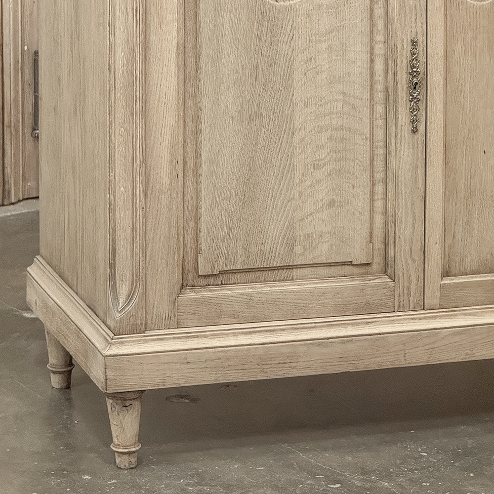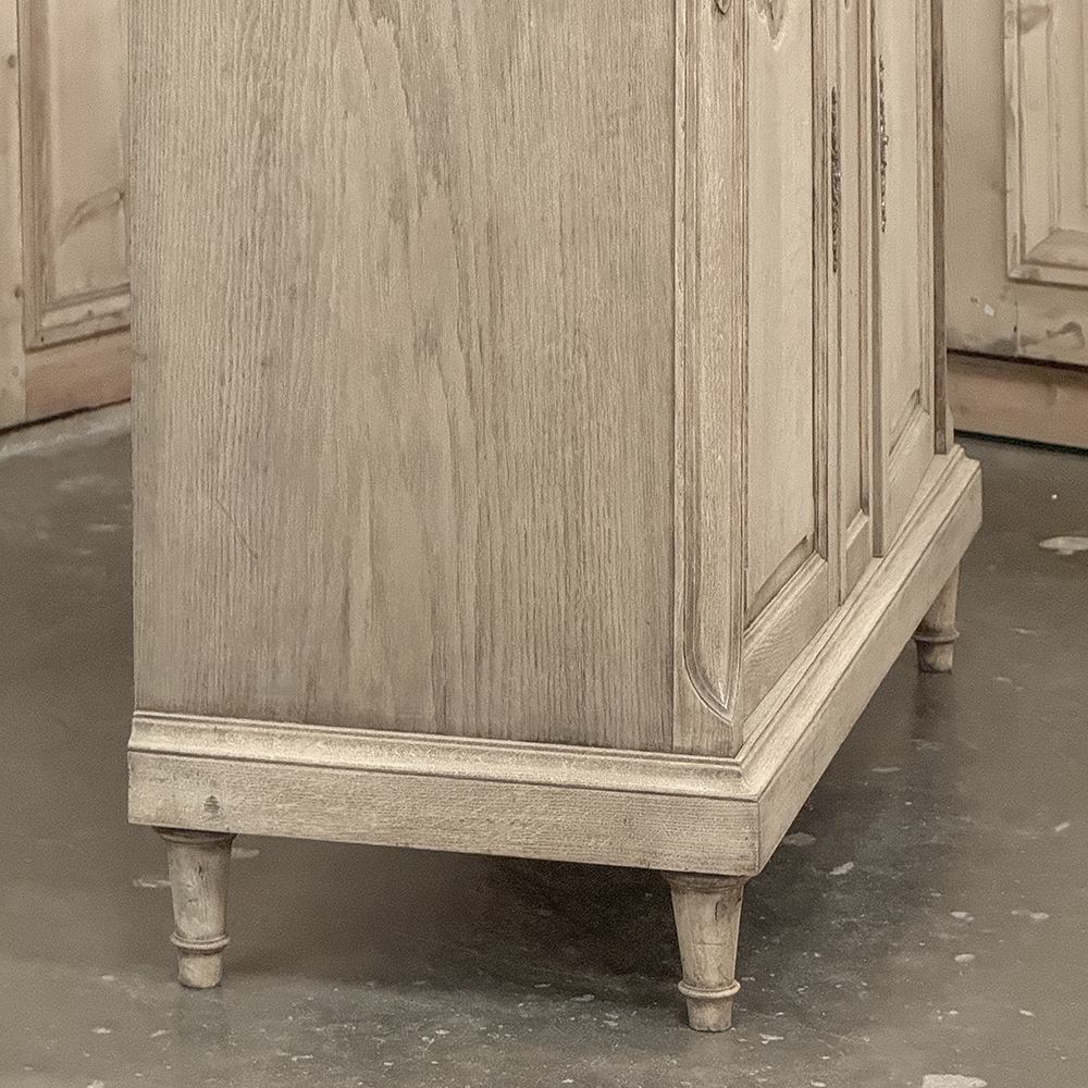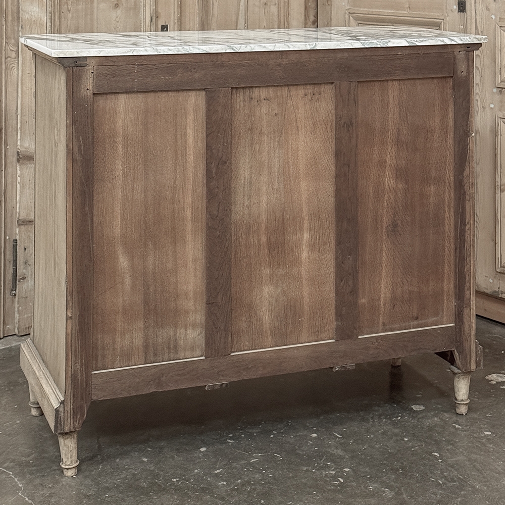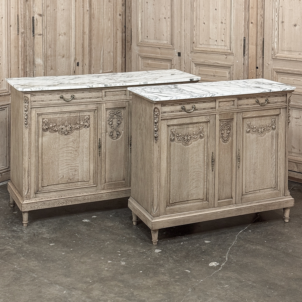 Antique French Louis XVI Stripped Marble Top Buffet adds a casual elegance to the room, with architecture and embellishment inspired by the ancient Greek & Roman civilizations popularized by Louis XVI. Densely grained old-growth oak has been stripped to reveal the patina and character of the wood lending a casual visual effect. Carved floral and foliate designs grace the facade, with tailored molding, tapered legs and brass pulls and key guards to add visual interest. Doors and drawers open to reveal capacious storage for a piece only five feet wide, and the top consists of luxuriously veined marble for carefree entertaining and daily use. Painstakingly stripped using our proprietary process that retains the patina and sheer natural beauty of the old wood, all performed by our expert in-house staff.