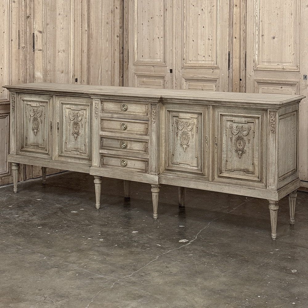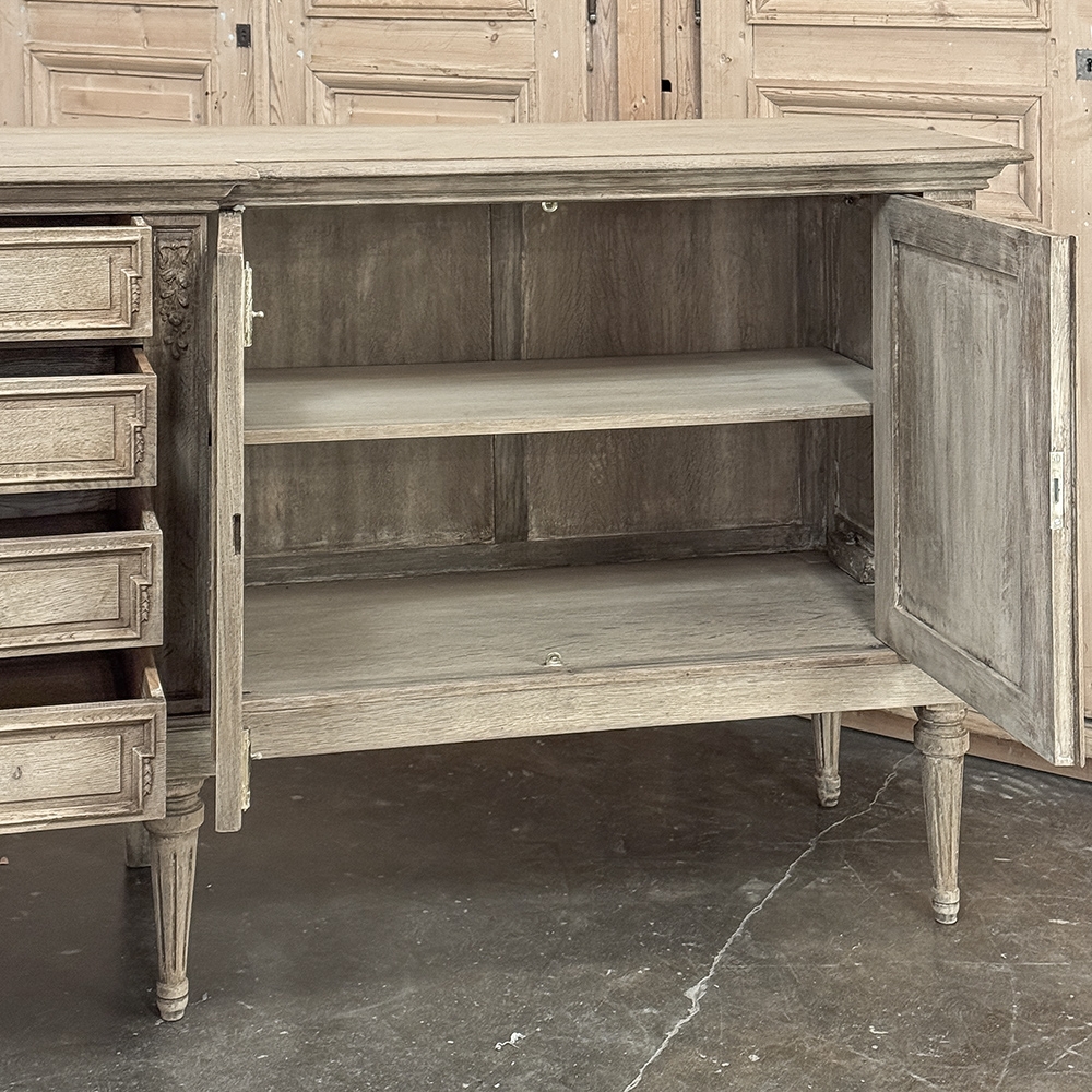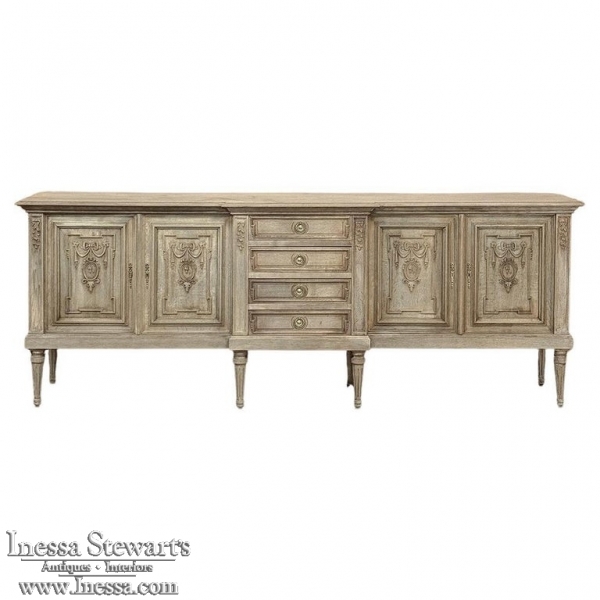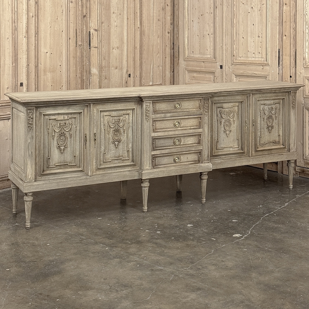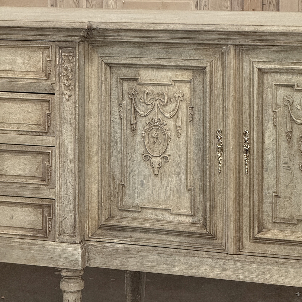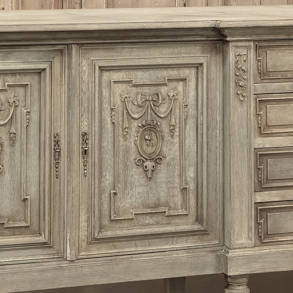 Antique Grand French Louis XVI Buffet ~ Credenza in Stripped Oak was crafted on a scale suitable for a gracious manoir! The facade is just under nine feet in width boasting room for four cabinet doors and an entire tier of four vertically stacked drawers at the middle in a step-front configuration. The long, spacious top provides ample opportunity for display and entertaining, and the entire affair is set upon six tapered and fluted legs to give it a surprisingly airy visual effect regardless of its imposing size. The aforementioned center section is defined by pilasters with ribbon, floral and foliate carvings which are repeated on each corner post to frame the entire piece. The drawers are otherwise tailored tailored affairs centered with brass ring pulls. The cabinet doors, however, showcase the woodcarver's expertise with framed oval medallions, ribbon, fabric swags and a stylized ram's head. Painstakingly stripped using our proprietary process that retains the patina and sheer natural beauty of the old wood, all performed by our expert in-house staff.