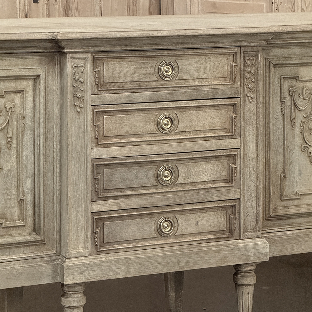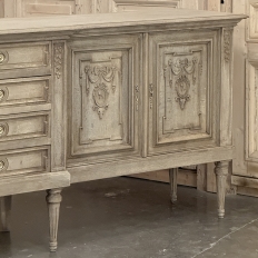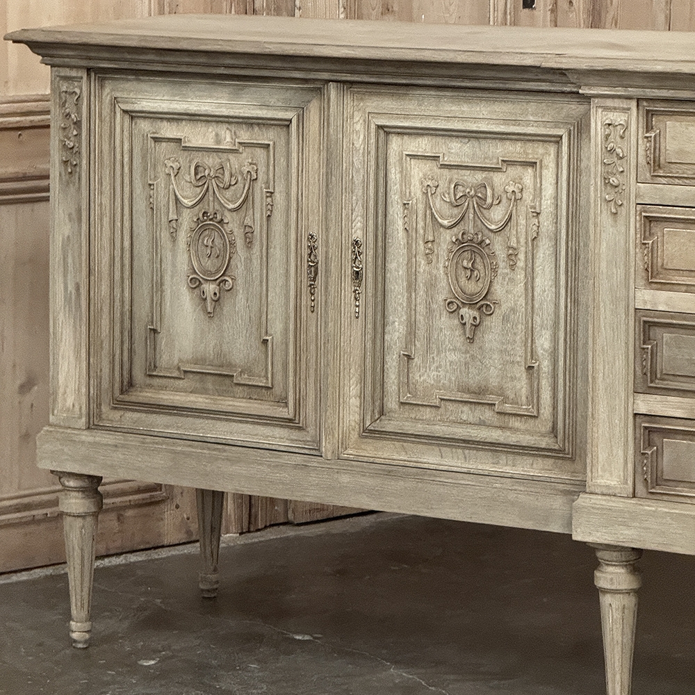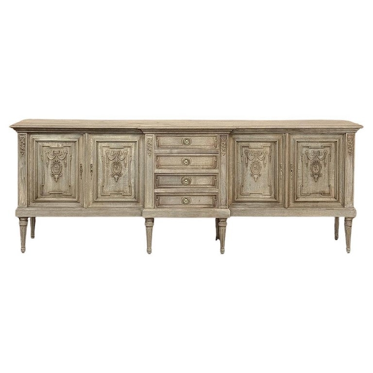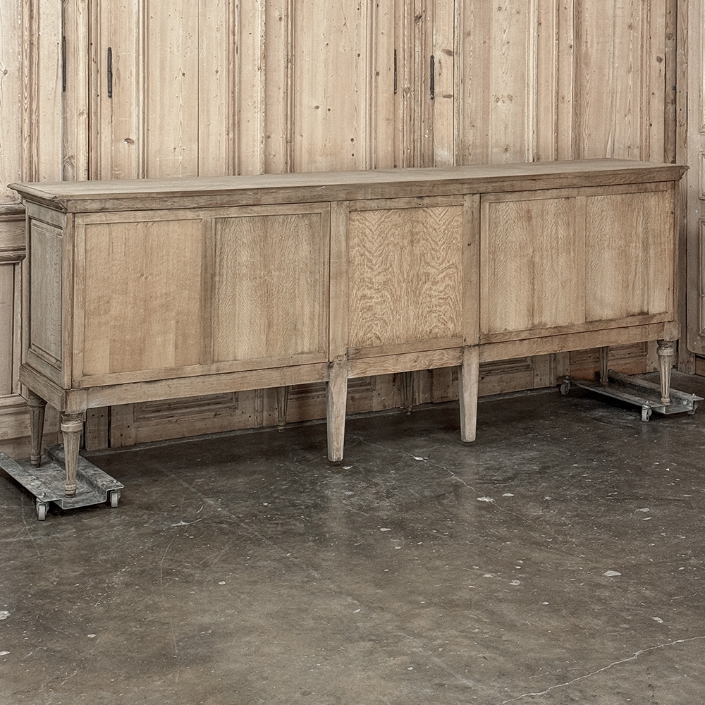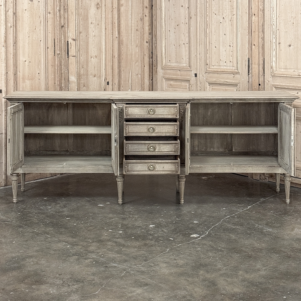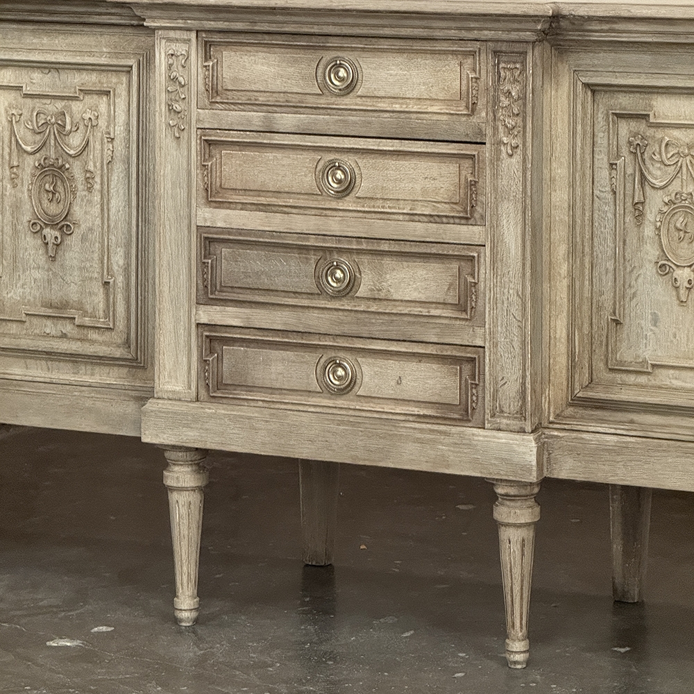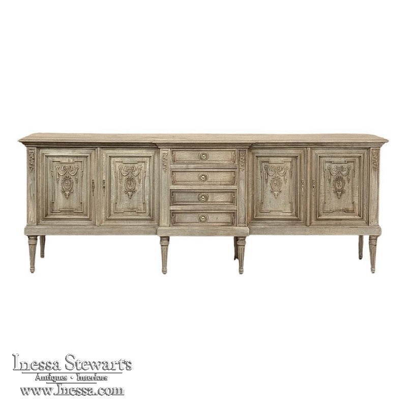 Antique Grand French Louis XVI Buffet ~ Credenza in Stripped Oak was crafted on a scale suitable for a gracious manoir! The facade is just under nine feet in width boasting room for four cabinet doors and an entire tier of four vertically stacked drawers at the middle in a step-front configuration. The long, spacious top provides ample opportunity for display and entertaining, and the entire affair is set upon six tapered and fluted legs to give it a surprisingly airy visual effect regardless of its imposing size. The aforementioned center section is defined by pilasters with ribbon, floral and foliate carvings which are repeated on each corner post to frame the entire piece. The drawers are otherwise tailored tailored affairs centered with brass ring pulls. The cabinet doors, however, showcase the woodcarver's expertise with framed oval medallions, ribbon, fabric swags and a stylized ram's head. Painstakingly stripped using our proprietary process that retains the patina and sheer natural beauty of the old wood, all performed by our expert in-house staff.