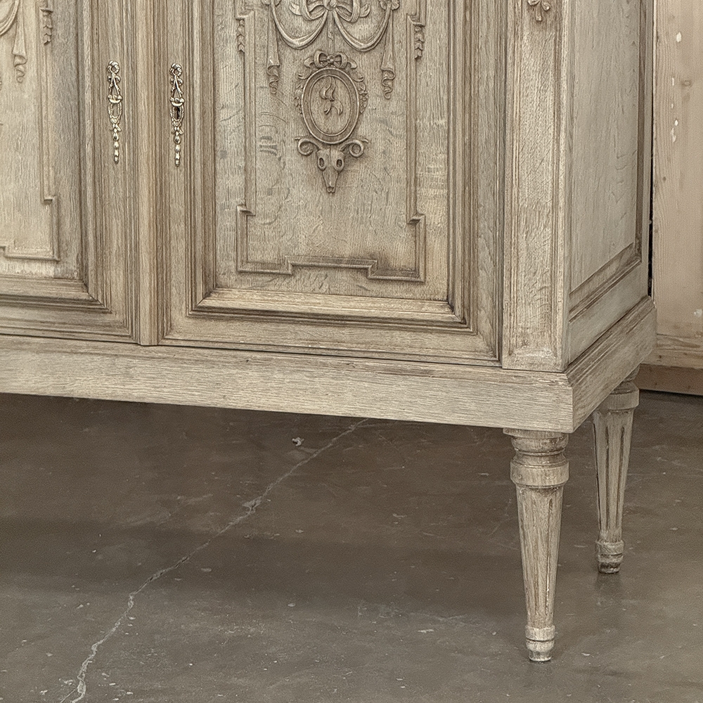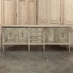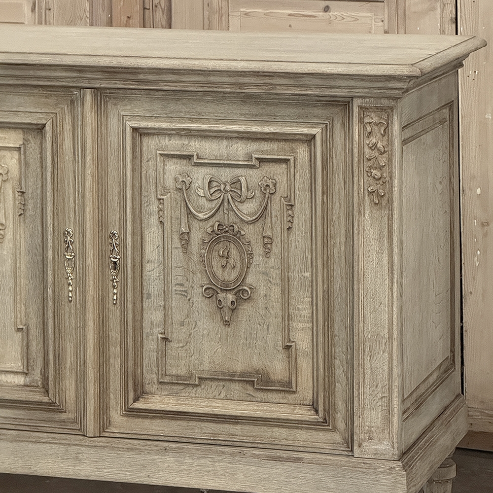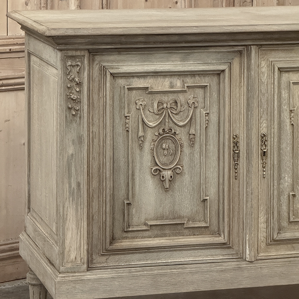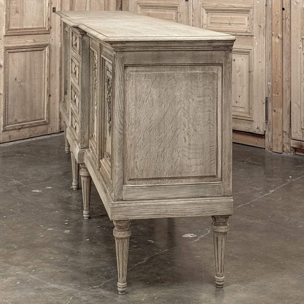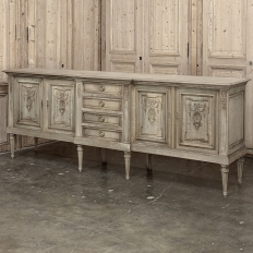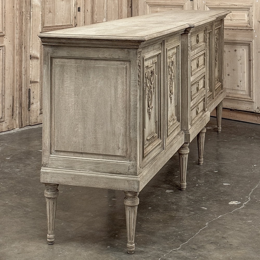 Antique Grand French Louis XVI Buffet ~ Credenza in Stripped Oak was crafted on a scale suitable for a gracious manoir! The facade is just under nine feet in width boasting room for four cabinet doors and an entire tier of four vertically stacked drawers at the middle in a step-front configuration. The long, spacious top provides ample opportunity for display and entertaining, and the entire affair is set upon six tapered and fluted legs to give it a surprisingly airy visual effect regardless of its imposing size. The aforementioned center section is defined by pilasters with ribbon, floral and foliate carvings which are repeated on each corner post to frame the entire piece. The drawers are otherwise tailored tailored affairs centered with brass ring pulls. The cabinet doors, however, showcase the woodcarver's expertise with framed oval medallions, ribbon, fabric swags and a stylized ram's head. Painstakingly stripped using our proprietary process that retains the patina and sheer natural beauty of the old wood, all performed by our expert in-house staff.