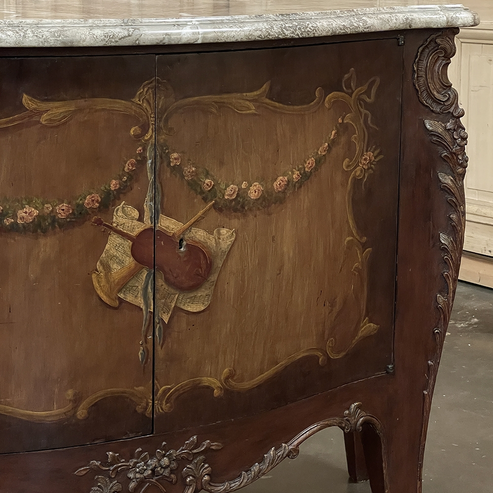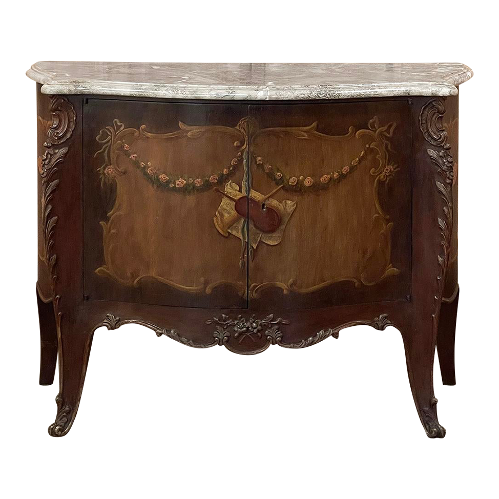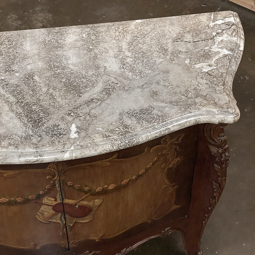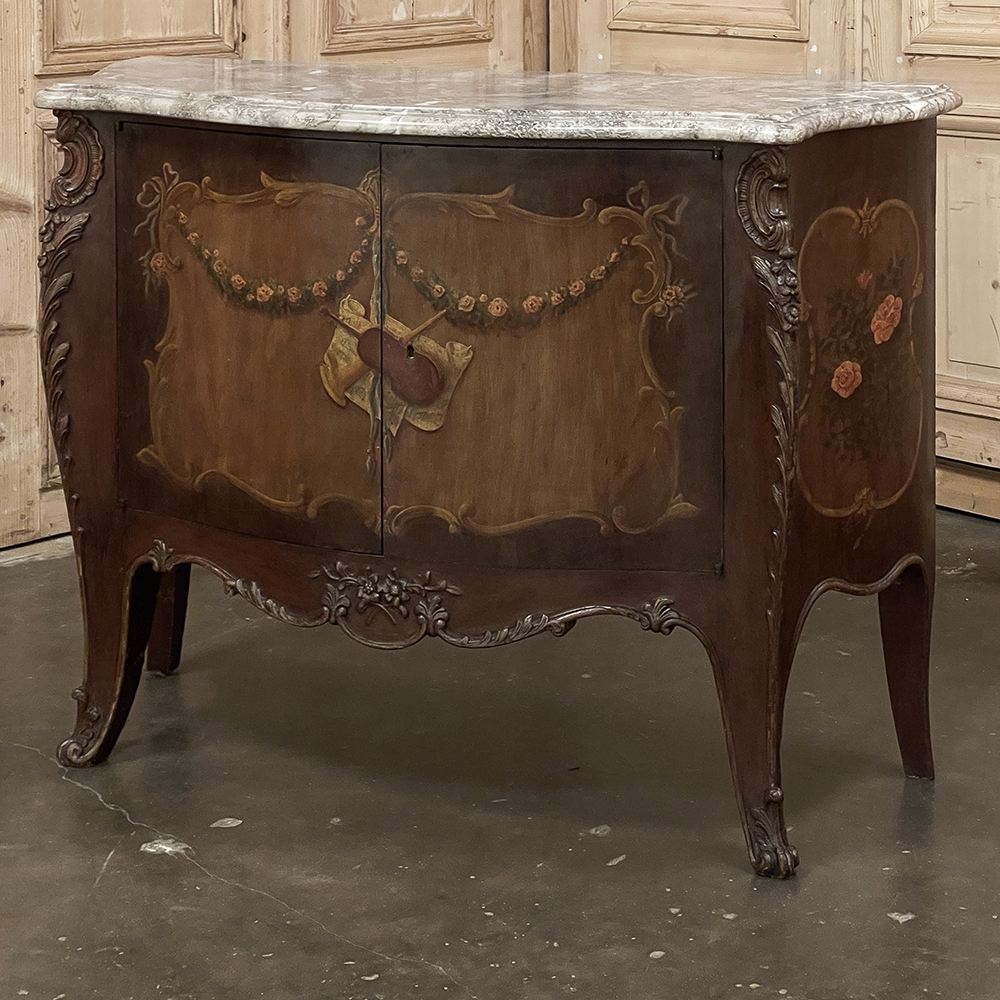 Antique Italian Hand-Painted Marble Top Bombe Commode ~ Cabinet at first glance appears to be a chest of drawers, but is actually a two door cabinet! Of course one could still use it for storing clothes, but it also makes a great choice for any room, able to store anything in style! The subtle curvaceous bombe form includes serpentine sides, and boldly scrolled front cornerposts fitted with full-height, finely detailed brass mounts. These mounts protect the corners from the top to the tip of the feet, and add a beautiful touch as well. The top is a luxuriously veined selection of neutral-colored gray marble that has been meticulously contoured and hand-beveled to follow the lines of the casework below. The facade, however, steals the show with three works of art expressed by an obviously talented painter on each side and spanning the two doors in front. Musical instruments, a music score, floral garlands, bouquets, and elaborate scrollwork have been painted onto the facade which consists of walnut contrasting with satinwood for an exquisite contrast. The apron features elegant scrollwork accented with gold and a painted floral spray. What a wonderful choice to add storage, a display surface, and a style statement all its own!