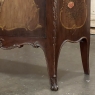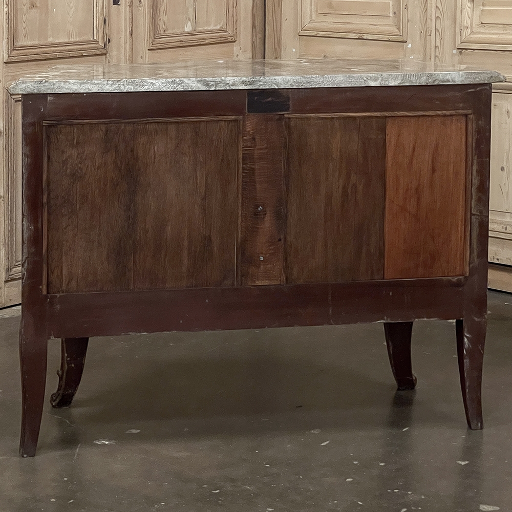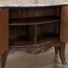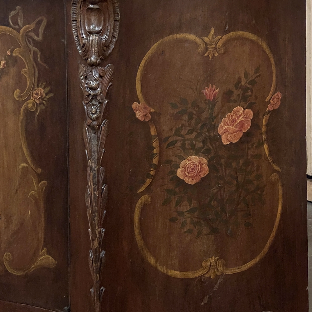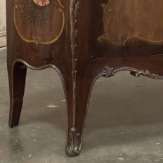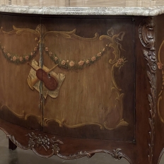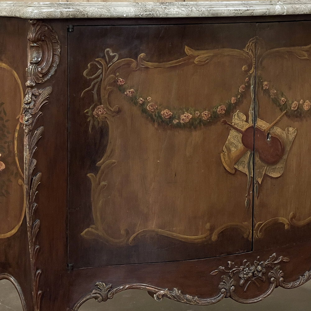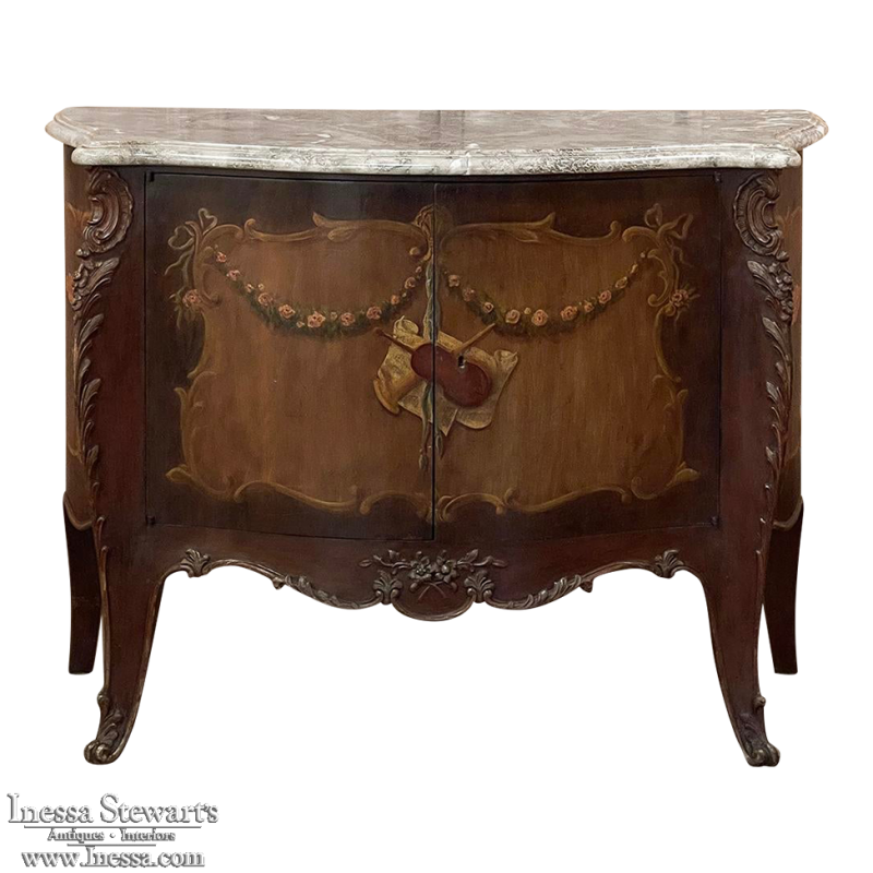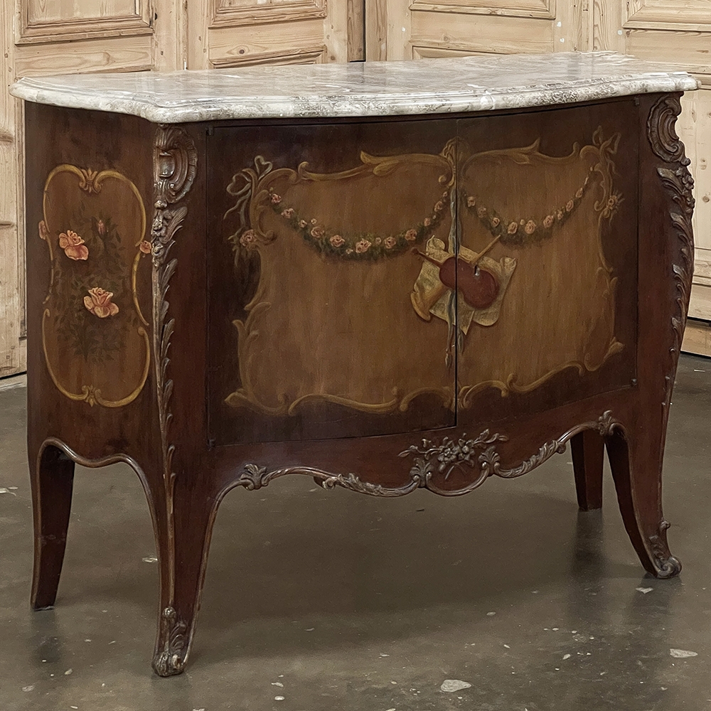 Antique Italian Hand-Painted Marble Top Bombe Commode ~ Cabinet at first glance appears to be a chest of drawers, but is actually a two door cabinet! Of course one could still use it for storing clothes, but it also makes a great choice for any room, able to store anything in style! The subtle curvaceous bombe form includes serpentine sides, and boldly scrolled front cornerposts fitted with full-height, finely detailed brass mounts. These mounts protect the corners from the top to the tip of the feet, and add a beautiful touch as well. The top is a luxuriously veined selection of neutral-colored gray marble that has been meticulously contoured and hand-beveled to follow the lines of the casework below. The facade, however, steals the show with three works of art expressed by an obviously talented painter on each side and spanning the two doors in front. Musical instruments, a music score, floral garlands, bouquets, and elaborate scrollwork have been painted onto the facade which consists of walnut contrasting with satinwood for an exquisite contrast. The apron features elegant scrollwork accented with gold and a painted floral spray. What a wonderful choice to add storage, a display surface, and a style statement all its own!