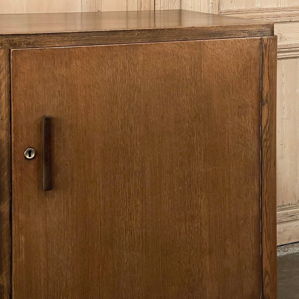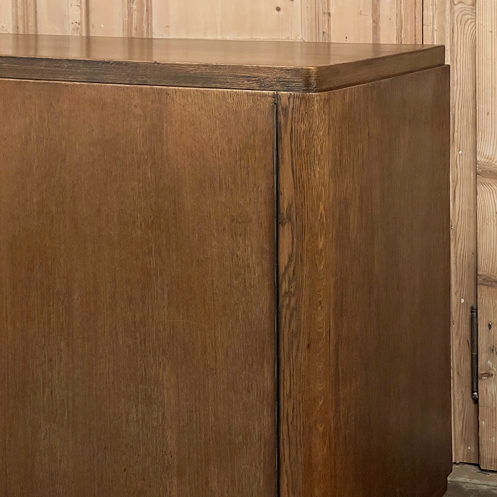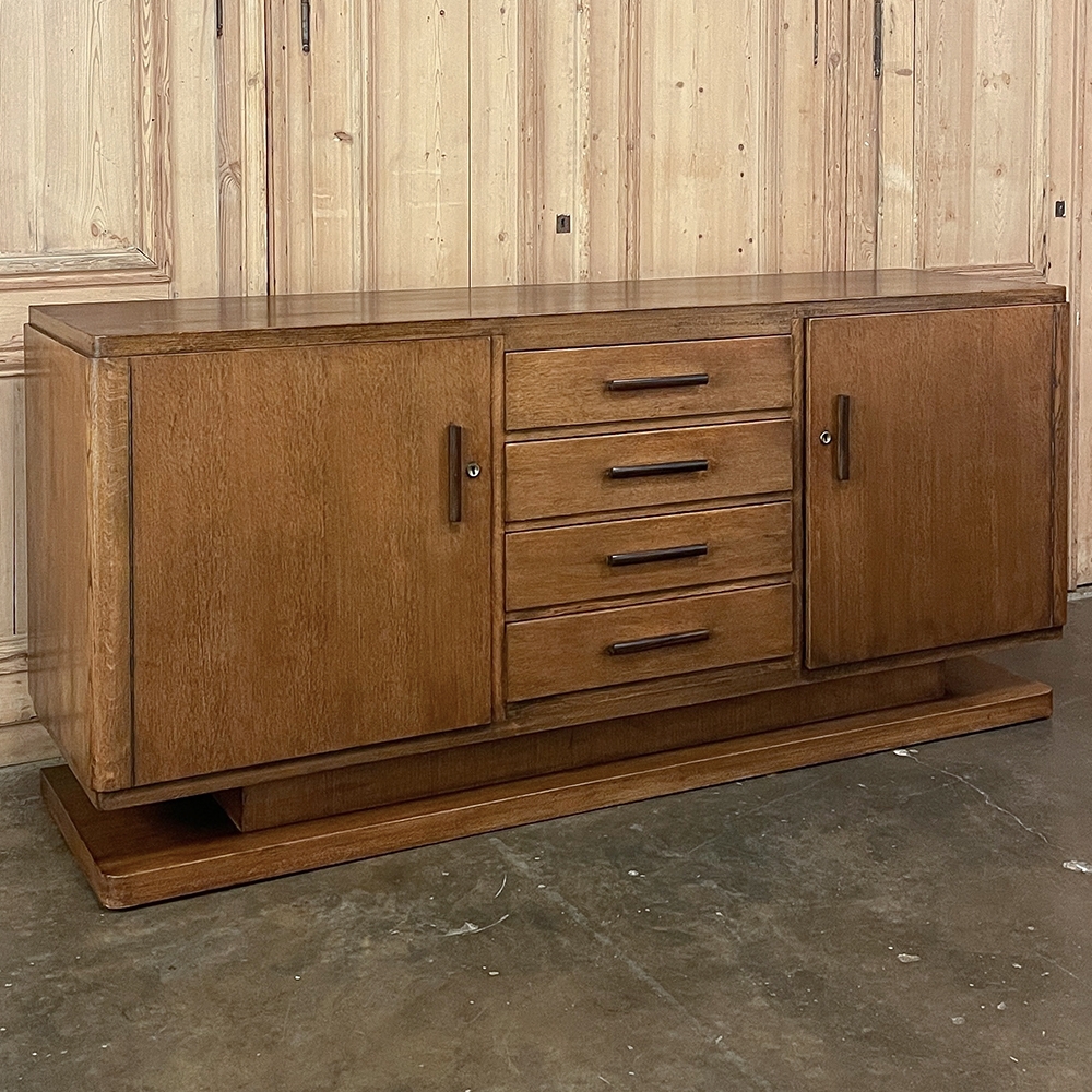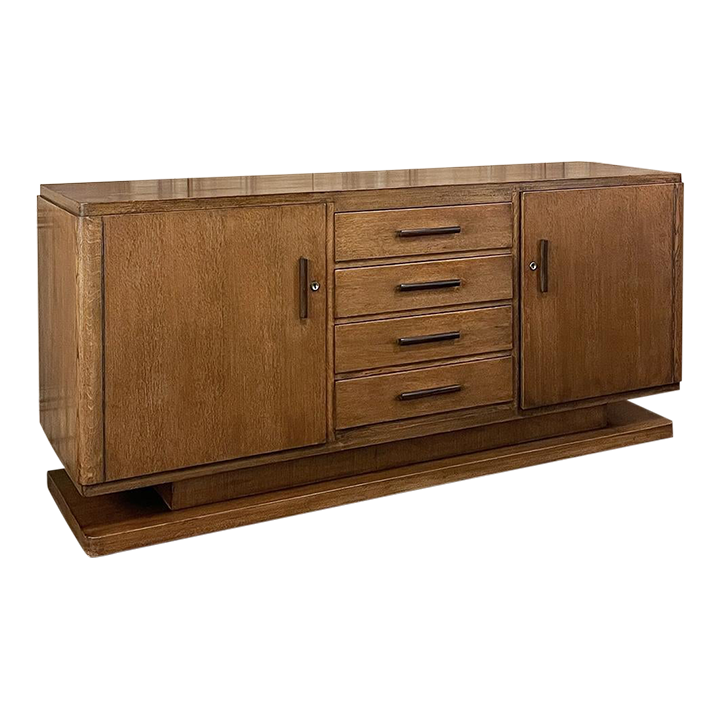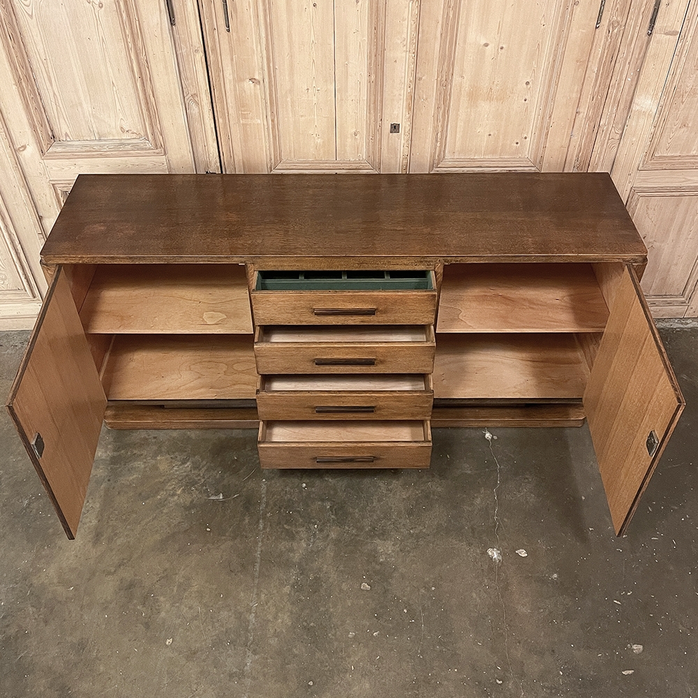 Art Deco Modern Credenza ~ Buffet will make the ideal choice for the contemporary and casual decors alike! Fashioned with a tailored rectilinear style, it features two spacious cabinets with interior shelves flanking a center section comprised of four drawers, all elevated on a pedestal type support, yet resulting in an under three foot total height. Ideal as a platform for a large flat-panel TV, it will afford plenty of useful storage below for anything you desire, including additional electrical components for your entertainment system. Fine oak veneer envelopes the entire affair, with felt-lined partitions in the topmost drawer indicating its possibilities in the dining room. Handles are solid contoured wood designed to complement the space-age exterior appearance.