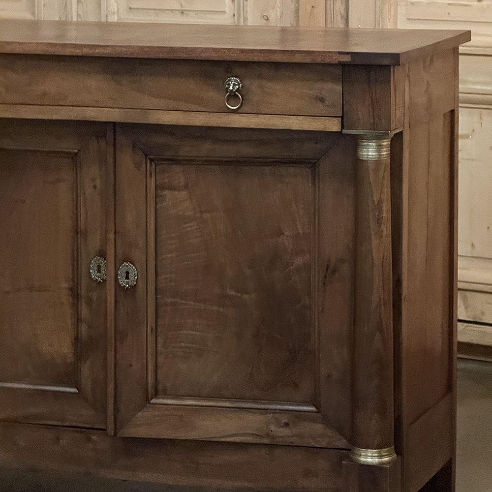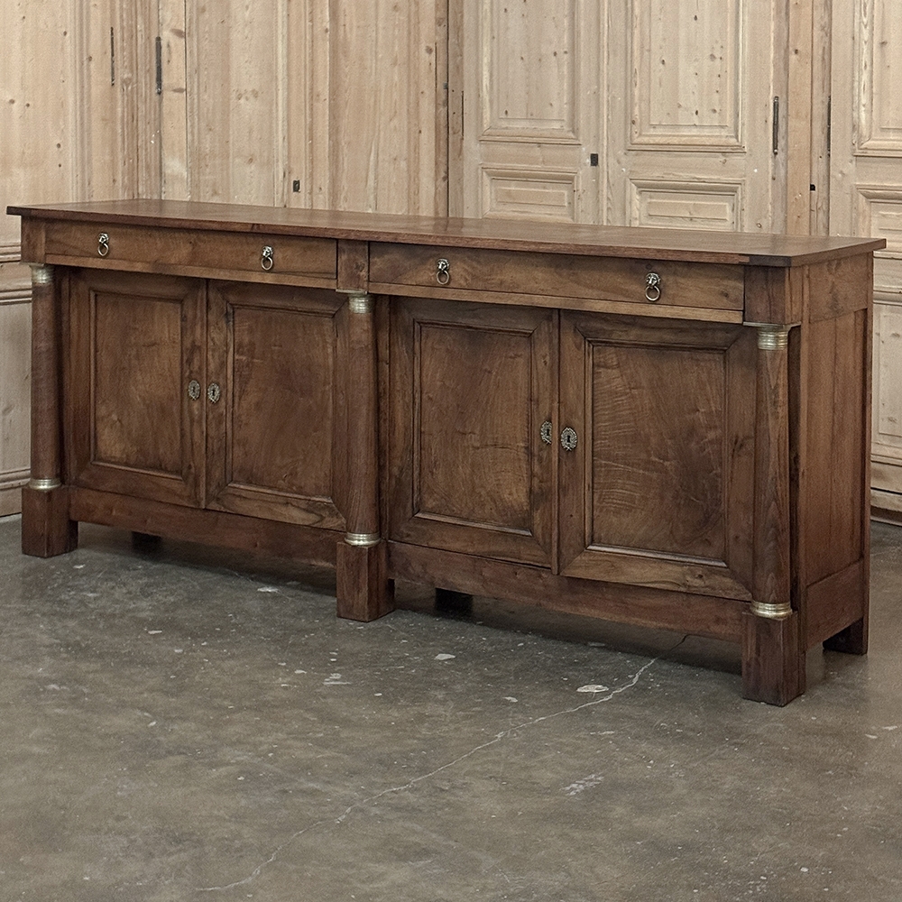 Early 19th Century French Empire Period Walnut Grand Buffet was meticulously hand-crafted by skilled artisans who drew inspiration from the royal families of their eras. In this case, the piece was styled after the designs developed by Napoleon and Josephine, and rendered entirely from select, finely figured French walnut which today is prohibitively expensive and almost unattainable. The simplicity of the architecture results in its own elegance, with plank and panel top, three solid walnut columns across the front, and the aforementioned figured walnut used for the cabinet door panels. Interestingly, the design consists of two very wide drawers, indicating the original owners desired plenty of space for tablecloths and larger linens. Visual adornment includes a brace of lions' heads ring pulls for each drawer, finely cast key guards, and brass capitals and base rings on the columns. Doors open wide to reveal a cavernous interior, ideal for the large families of the affluent during the period. A stunning ode to a bygone era!